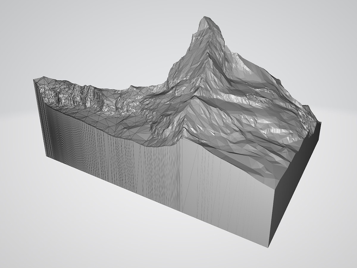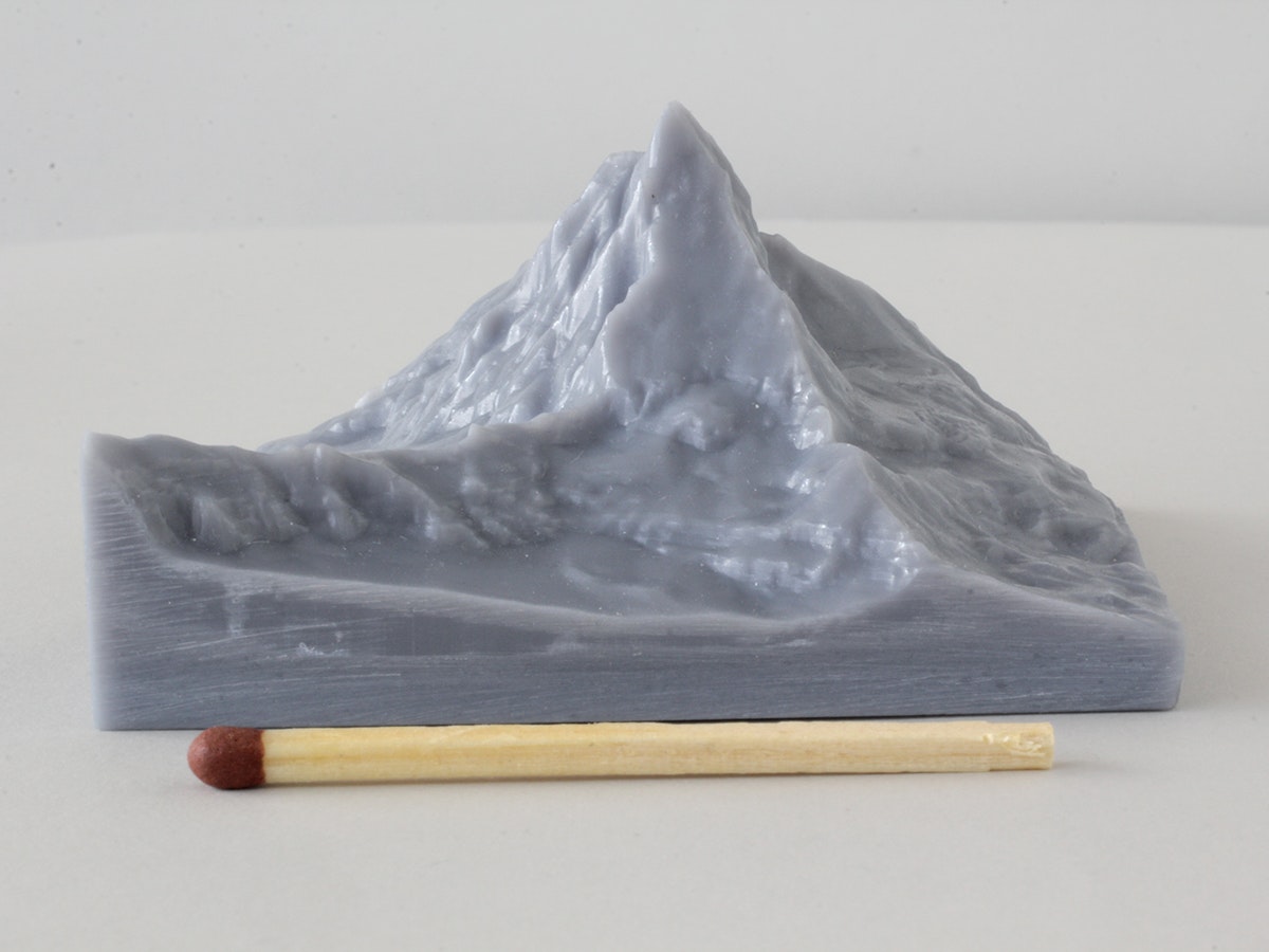 Als Beispiel können Sie das Matterhorn in einem beliebigen Massstab ausdrucken. Verwenden Sie dazu die aus dem Produkt swissALTI3D und DHM25 konvertierten Beispieldaten im STL Format.