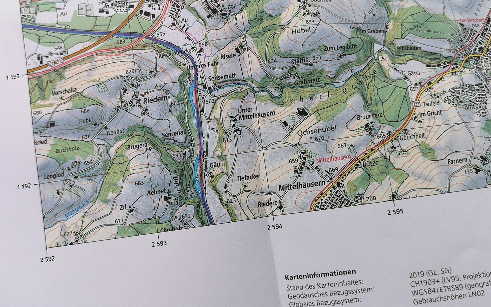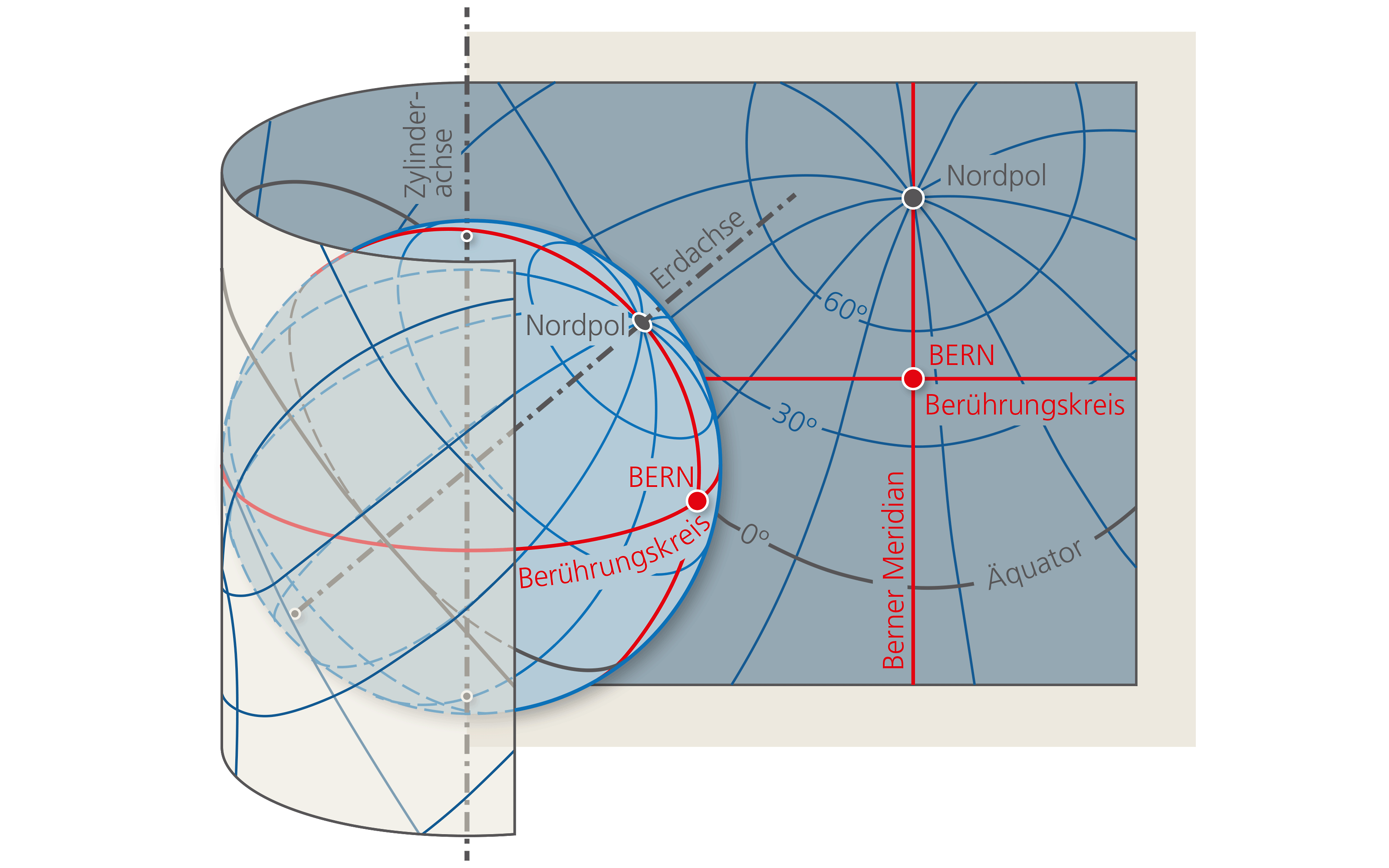 Haben Sie schon einmal versucht, die Schale einer Orange in möglichst einem Stück flach abzulegen? Dies geht nicht, ohne dass die Schale zerreisst. Wer die Erde auf einer Fläche abbilden will, steht vor ähnlichen Schwierigkeiten. Mit einer Kartenprojektion wird es möglich, ein bestimmtes Gebiet, zum Beispiel ein Land, mit möglichst wenig Rissen oder Verzerrungen auf einer Karte darzustellen. Für die Schweiz ist dies eine schiefachsige, winkeltreue Zylinderprojektion.