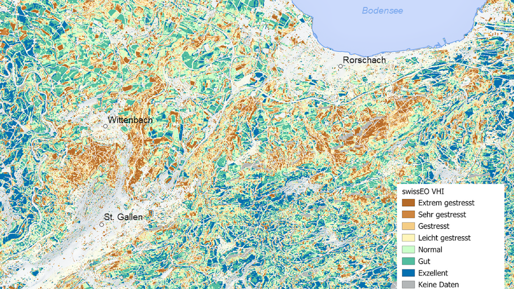 Die Satellitendatenprodukte swissEO S2-SR und VHI ermöglichen Echtzeit- Umweltbeobachtung in 10m und bis zu täglicher Auflösung. Der Produktnutzen wird für Trockenstress im Wald auf-gezeigt.