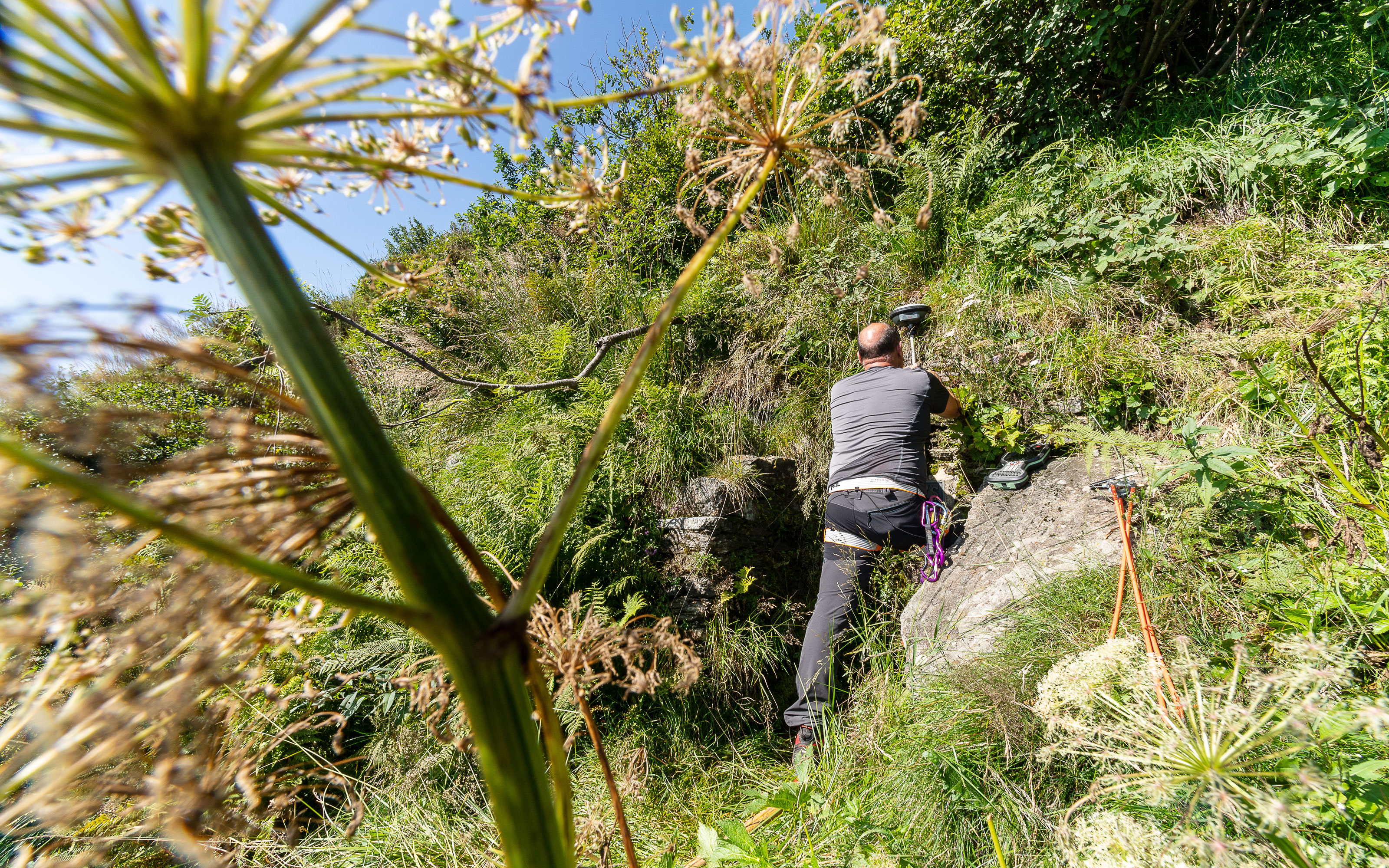 Rund ein Drittel seiner Arbeitszeit verbringt Alain Wicht in der Natur. Bevor er am Morgen jeweils losfährt, verstaut er die Utensilien in seinem Kleinbus, manchmal auch in einem Geländewagen von swisstopo. Im Gepäck hat er Vermessungswerkzeuge und drei Kisten Material: «Farbe, Pinsel, Wasserwaage, Meter, Zement, Bürste, Säge und einen Feldstecher», zählt er auf. «Man weiss nie, was einen erwartet», so der Geomatiktechniker. Auch einen Rucksack hat er stets dabei. Darin befinden sich Proviant, warme Kleider, das Kleinmaterial und sein Satelliten-Messgerät. Als Beauftragter für die Landesgrenze ist Alain Wicht stets auf der Suche nach Grenzsteinen, Grenzplatten und gemeisselten Grenzmarkierungen. Er erklimmt Berggipfel, kämpft sich durchs Dickicht der Wälder und überquert notfalls schwimmend Gewässer, um jenen Punkt zu orten, der die Schweiz vom Nachbarland trennt.