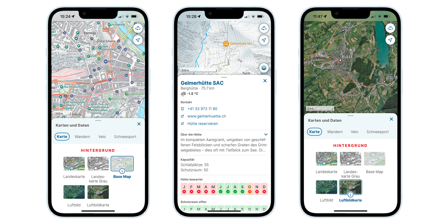 Die Base Map ist wie die Landeskarte als Hintergrundkarte in der App auswählbar und lässt sich wie gewohnt mit Layer kombinieren. Es kann jedoch vorkommen, dass bestimmte Themen, wie der öffentliche Verkehr, bereits in der Base Map integriert sind und durch die Einblendung eines zusätzlichen Layer doppelt abgebildet werden.