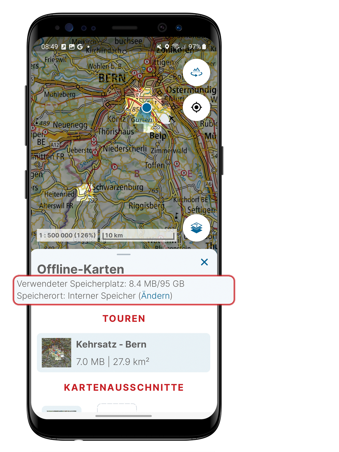Dazu wählen Sie die gewünschte Tour und ziehen das Touren-Menu ganz nach oben. Unten im Menu unter «Offline» können Sie mittels dem Download-Button das Kartenmaterial für die Route laden. Das Kartenmaterial wird entlang der Route mit ausreichendem Puffer geladen.