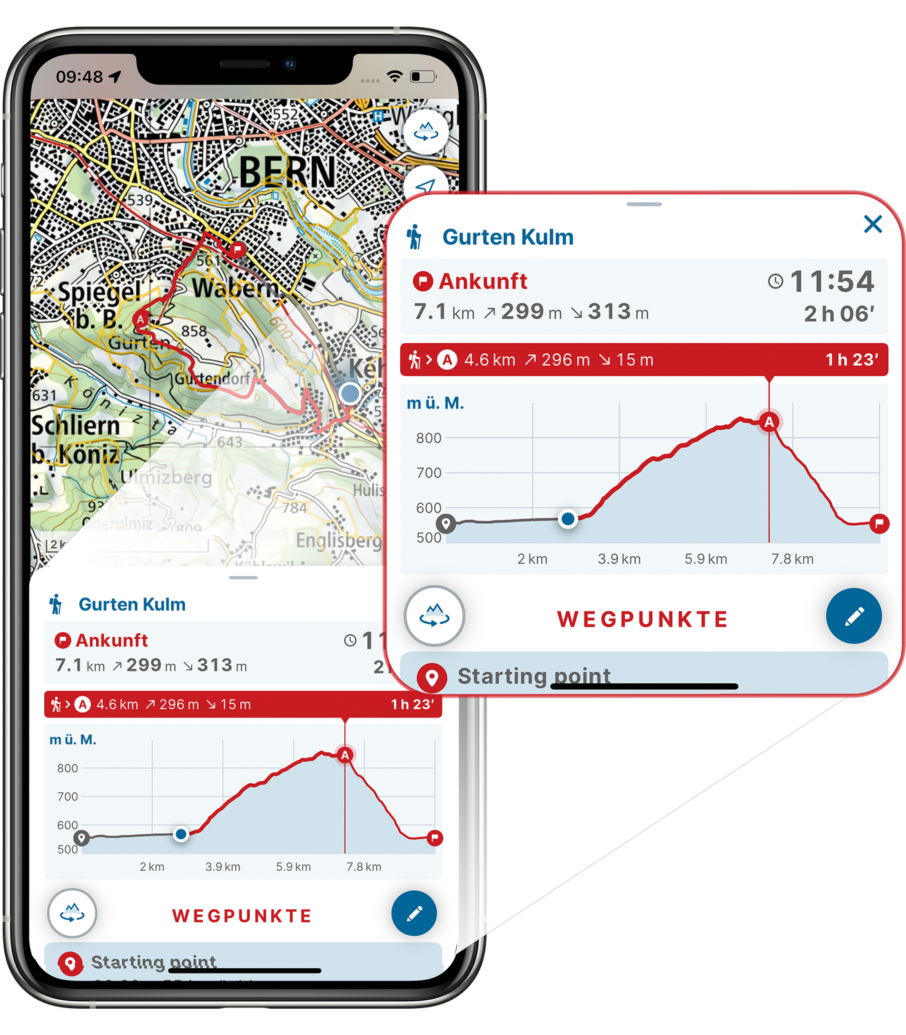 Mit der swisstopo-App sind Sie noch einfacher unterwegs. Die App zeigt Ihnen den kürzesten Weg von Ihrem aktuellen Standort zum gewünschten Ziel – wahlweise mit ÖV oder nur zu Fuss. Sind Sie auf einer geplanten Tour unterwegs, verlieren Sie den Weg zum Ziel nie aus den Augen und wissen jederzeit wo Sie sind und wie weit es noch geht.