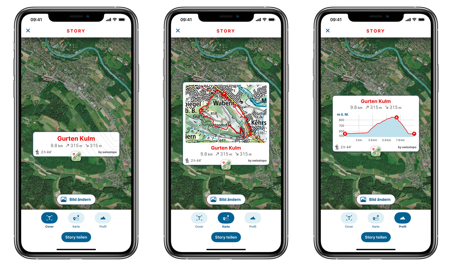 Die swisstopo-App bietet Ihnen die Funktion, eine Tour direkt auf Instagram zu teilen. Dafür klicken Sie im Menu der Tour auf «Als Story teilen» und erhalten eine Auswahl von 3 verschiedenen Darstellungsmöglichkeiten – Cover, Karte, Profil. Wenn Ihnen das Bild gefällt, klicken Sie auf «Story teilen» und fertig ist der ideale Post.