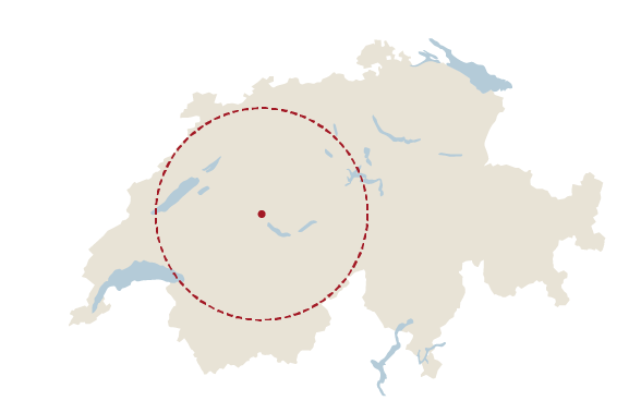 Wo liegt der Mittelpunkt des grösstmöglichen Kreises innerhalb der Schweiz, der die Landesgrenze berührt, aber an keiner Stelle überschreitet? Das Zentrum dieses Kreises ist nämlich jener Punkt, der am weitesten von unseren Nachbarländern entfernt liegt.