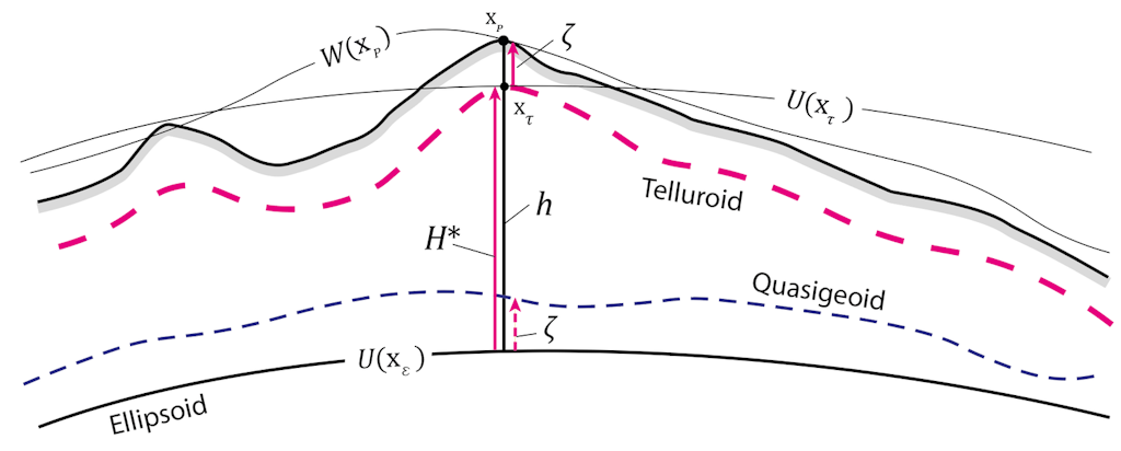 Wenn man für jeden Punkt der Topografie den Punkt x𝜏 bestimmt, erhält man eine Fläche, die als Telluroid bezeichnet wird (siehe Abbildung unten). Die Höhenabweichung entspricht dann der Differenz zwischen der Position auf dem Telluroid und dem jeweiligen Punkt der Topografie. Durch Übertragung dieser Höhenabweichungen auf das Ellipsoid bildet man das Quasi-Geoid, eine theoretische Fläche, welche für die Normalhöhen die gleiche Rolle spielt wie das Geoid für die orthometrischen Höhen.
