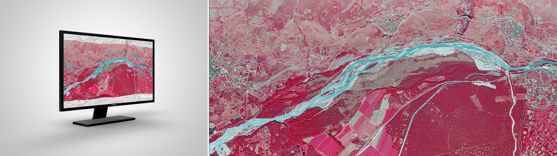 Da die Vegetation Sonnenstrahlen überwiegend im Bereich des nahen Infrarots reflektiert, stellt SWISSIMAGE RS die ideale Grundlage für Umweltstudien dar. Die Orthofotos, welche in ihrem Rohzustand vertrieben werden, eignen sich für die digitale Bearbeitung und liefern hochpräzise Resultate. Mit der vorhandenen Informationsfülle (vier Kanäle) kann dieses Produkt sowohl für die Bildklassifizierung wie auch für die Bilddarstellung in naturgetreuen RGB-Farben (Rot, Grün, Blau) effizient eingesetzt werden.