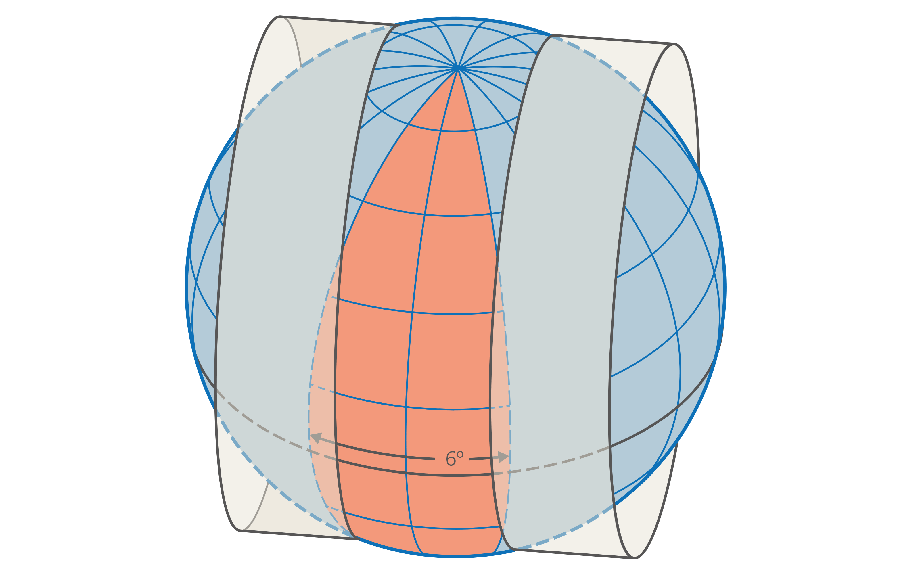 Um grosse Gebiete der Erdoberfläche in die Kartenebene abzubilden, bedient man sich besonderer Projektionen, welche die Erde in Streifen (Zonen) aufteilen. Innerhalb der Streifen bleiben die Abbildungsverzerrungen in vertretbaren Grenzen. Eine häufig gebrauchte, weltweit anwendbare Abbildung ist die UTM-Projektion, welche das Gebiet der Erde in 60 Zonen von Pol zu Pol mit einer Breite von 6 Längengraden teilt. Die Abbildung innerhalb der Zonen entspricht einer konformen Zylinderprojektion mit der Zylinderachse in der Äquatorialebene. Die Schweiz wird durch die UTM-Zone 32 mit dem Hauptmeridian L = 9° Ost fast vollständig abgedeckt. Wenn man es genau nimmt, liegt der westlichste Teil des Kantons Genf in der UTM-Zone 31 mit Mittelmeridian 3° Ost. Deren Anwendung ist für die Schweiz allerdings nicht empfehlenswert.