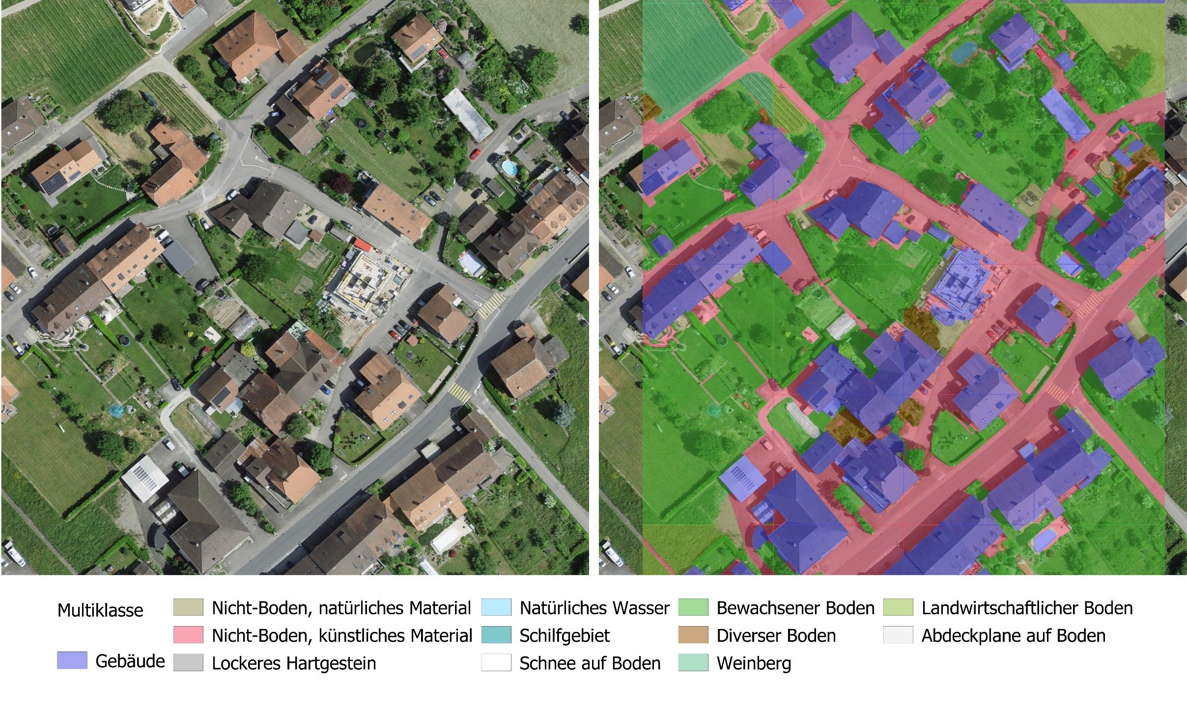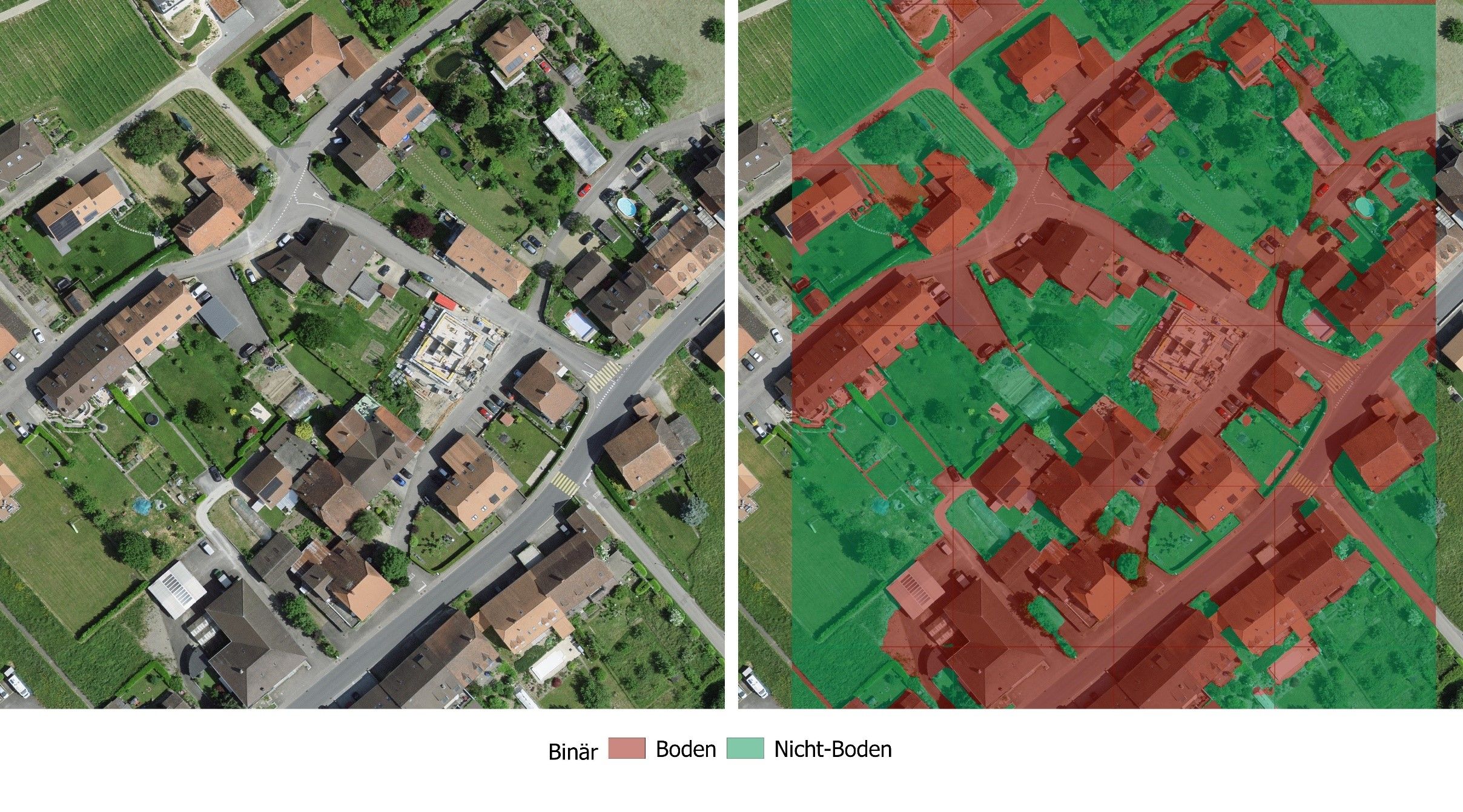Mit dem optimierten Modell können die Bodenklassen auf jeder Swissimage-Kachel abgeleitet werden, wie im folgenden Beispiel.