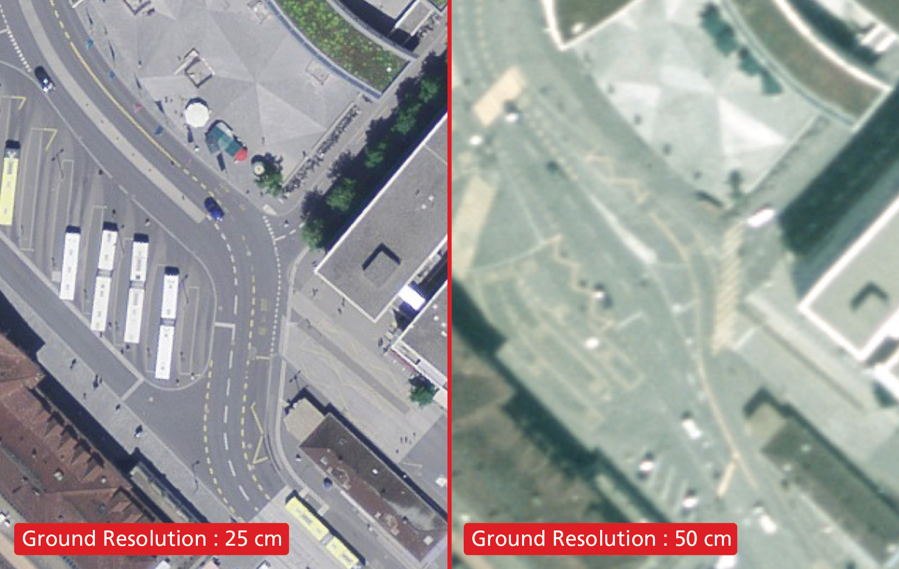 To obtain these images, the aircraft flies over Switzerland from west to east or follows the axis of the valleys whenever the topography does not allow this. The aircraft flies at an altitude of around 2,400 metres above the ground in order to produce a resolution of 10 centimetres, and at around 6,000 metres above the ground for a resolution of 25 centimetres.