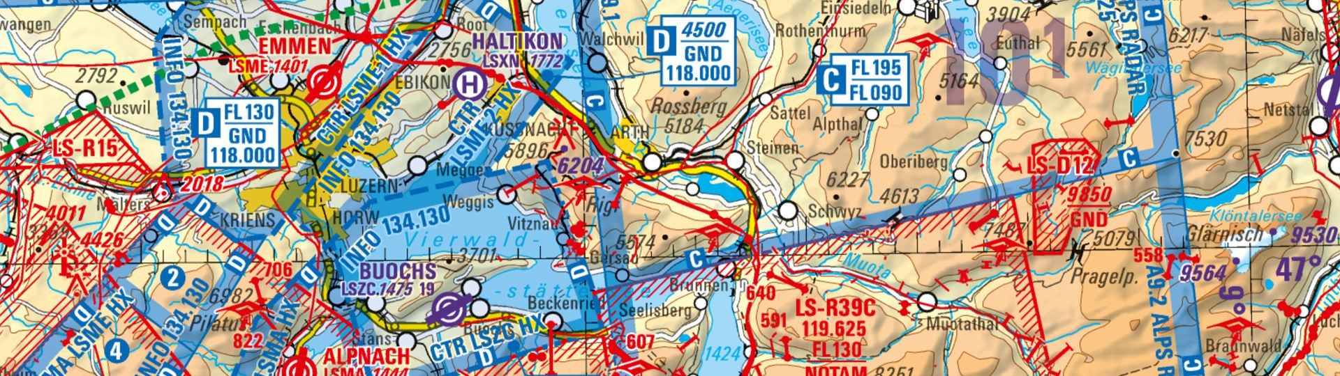 Swiss aeronautical maps with airports, airfields, airspaces, restricted and hazardous zones as well as air safety information.