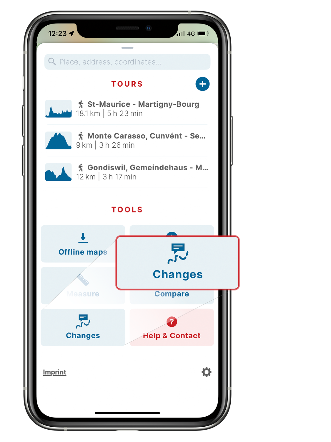 You can report changes and errors in the map material directly in the app using the Changes tool. To do this, drag the menu upwards and tap «Changes». You can now enter your error report.