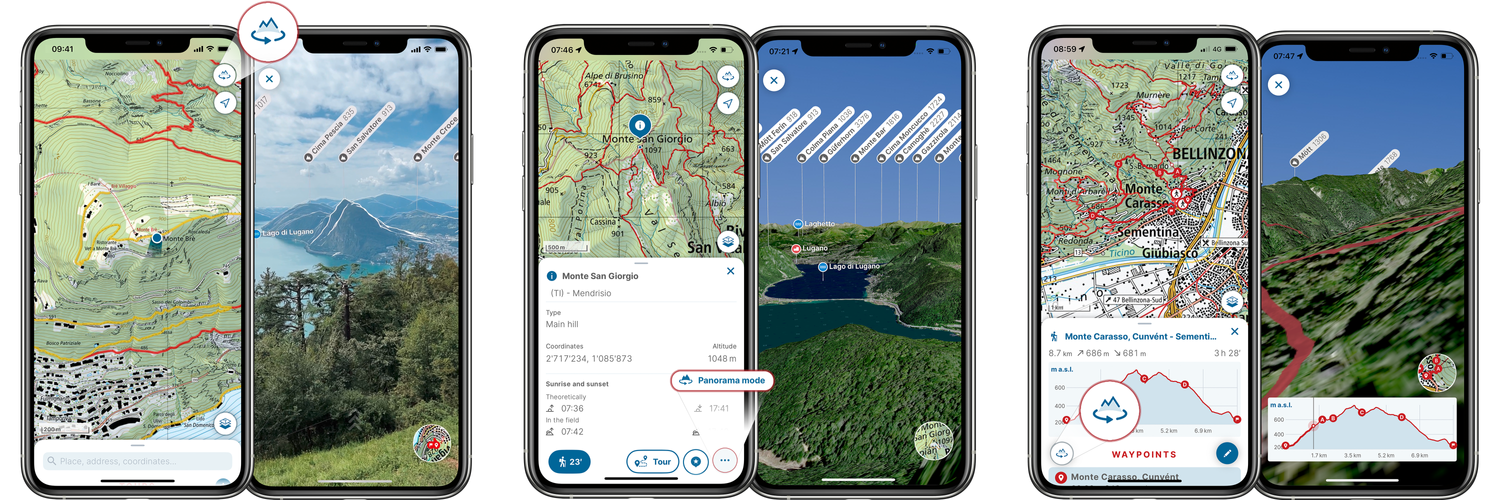 You want to know which panorama surrounds you? With one click you look through your camera and the most important places and summits are labelled in the camera image. Or discover the view virtually from any point on the map.