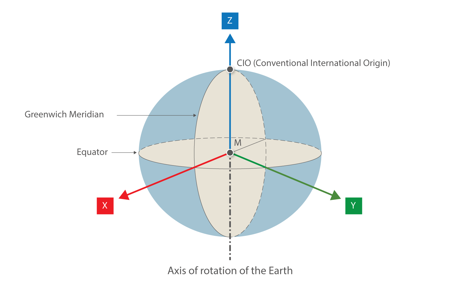 Global terrestrial reference systems are geocentric Cartesian coordinate systems with their origin in the earth's centre of gravity M. A «Conventional Terrestrial System» (CTS) has its point of origin at M, with its Z axis passing through the north pole (Conventional International Origin: CIO), its XZ plane passing through the mean zero point in Greenwich, and its Y axis completing the definition of a right-handed coordinate system.