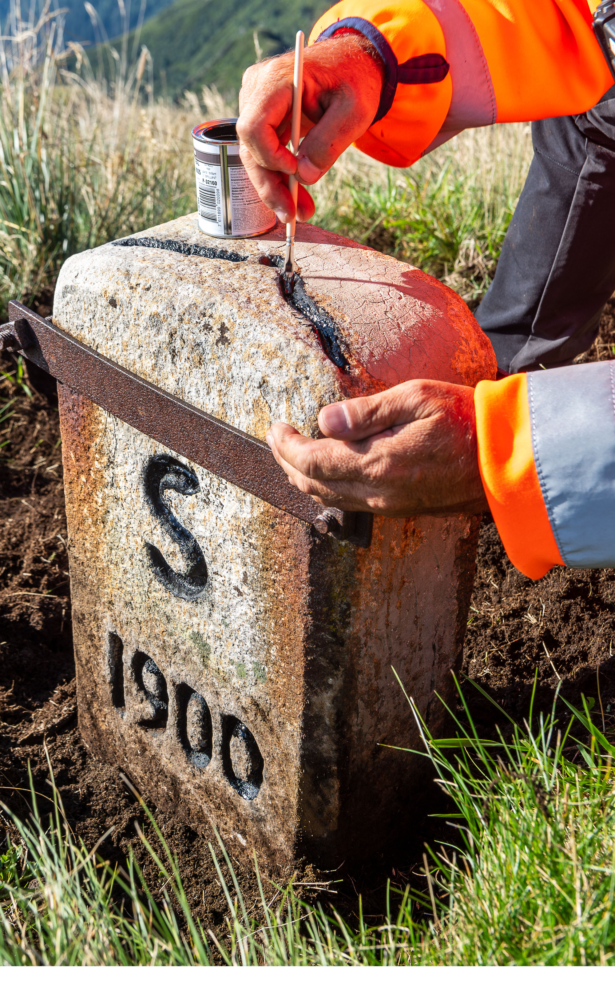 Alain Wicht spends around a third of his working time in the field. Before he sets out in the morning, he stows his utensils in his minibus or in one of swisstopo’s all-terrain vehicles. His utensils include surveying instruments plus three boxes containing various items which he says includes paint, paintbrushes, a spirit level, a measuring device, cement, a scrubbing brush, a saw and a pair of binoculars. “I never really know what to expect,” he says. He also always takes a backpack on his excursions, which contains provisions for his daily needs, plus warm clothing, various small items and his satellite measurement device. In the field, he constantly has to search for boundary stones and plates, as well as engraved border markings. He has to scale mountain peaks, fight his way through forest undergrowth and sometimes even cross rivers in order to find the exact location of the border between Switzerland and a neighbouring country.