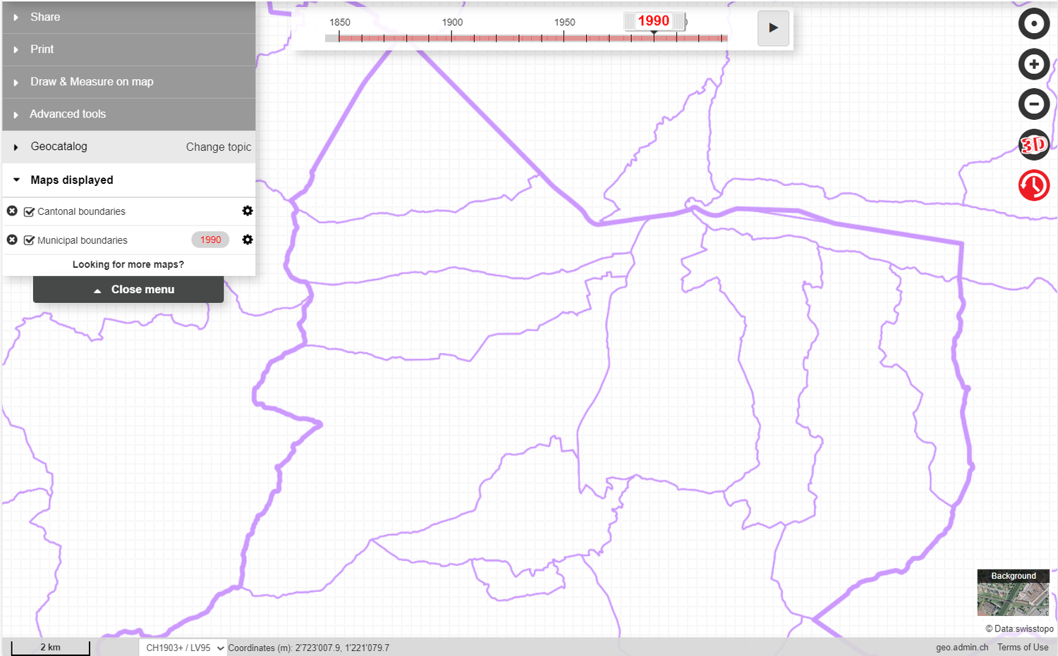 The layer municipal boundaries constitute the administrative borders of the municipalities of Switzerland and the principality of Liechtenstein. By default, the current status of municipal boundaries is displayed. With the historical data representation tool - called « journey through time - the evolution of municipal boundaries from 1850 to the present day is interactive. When a year prior to the current status is selected, the status of municipal boundaries on the first of January is displayed. Two data sources have been used to generate this layer: "Municipal boundaries: time series since 1850s» from the Swiss Federal Statistical Office for the period 1850 - 2015 and swissBOUNDARIES3D from the Swiss Federal Office of Topography for the period 2016 to the present.