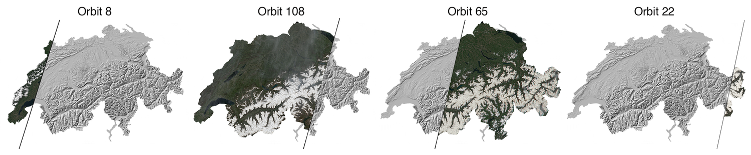 Switzerland is mapped by four orbits of the satellite overflight (see graphic below). The overlapping orbits result in a complete image of Switzerland approximately every three to five days, but the usefulness of the data is heavily dependent on meteorological conditions at the moment of overflight, as the imaging sensor cannot see through clouds. In addition to the already applied localisation of the data, a co-registration of the data optimised for Switzerland is applied for a sub-pixel positional accuracy and and a reprojection is carried out in a uniform coordinate system. Also included are optimised quality layers with masks for clouds (and cloud shadows) and topographic shadows.
