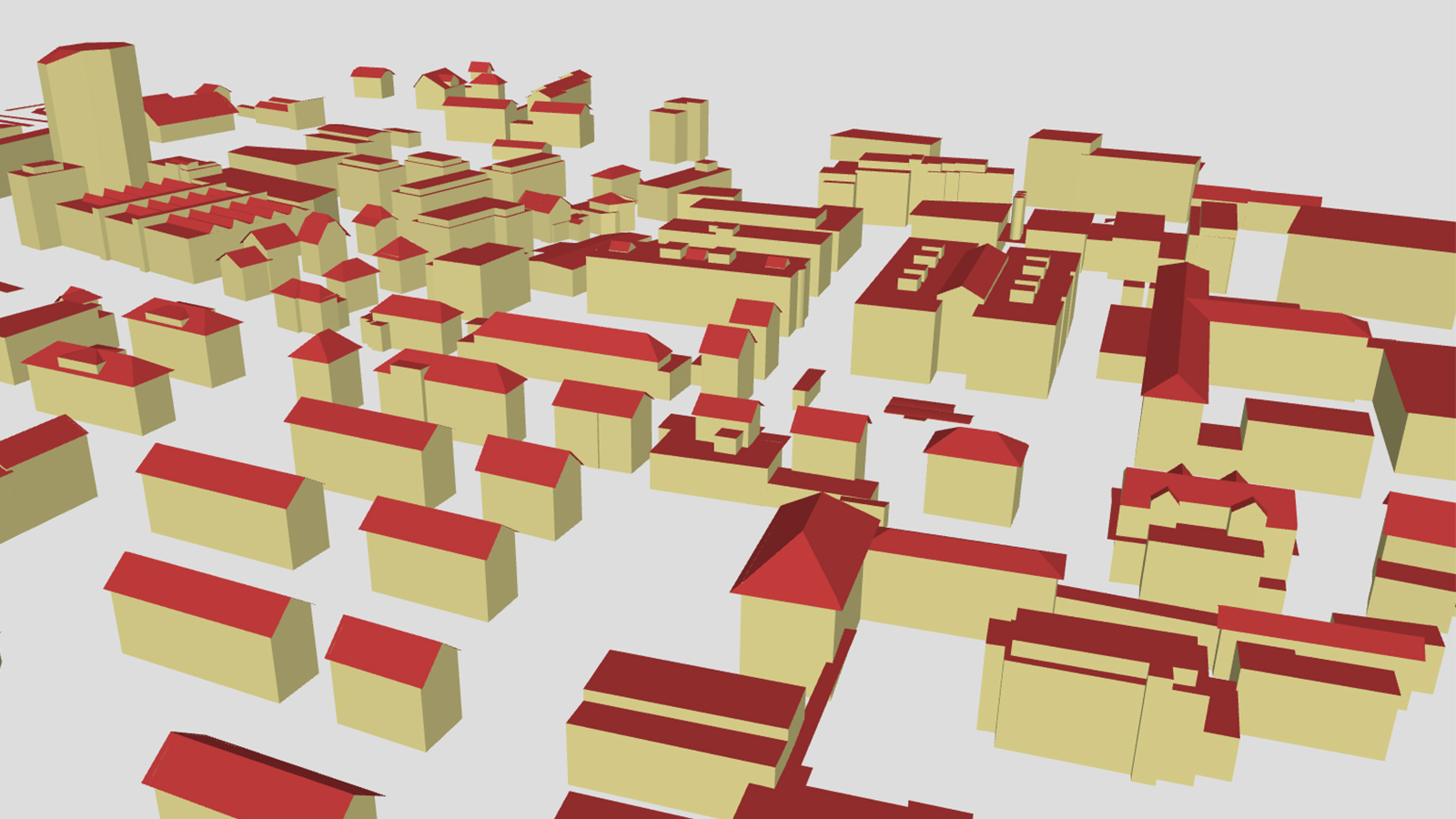 - The buildings are available as closed solid models (roof and building) and as surface models with separate roofs, facades and footprints.