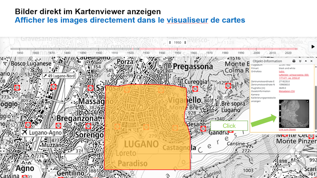 Les photos terrestres et aériennes déjà scannées peuvent être téléchargées directement à pleine résolution et, quand possibile, aussi visualisées directement dans le portail cartographique.