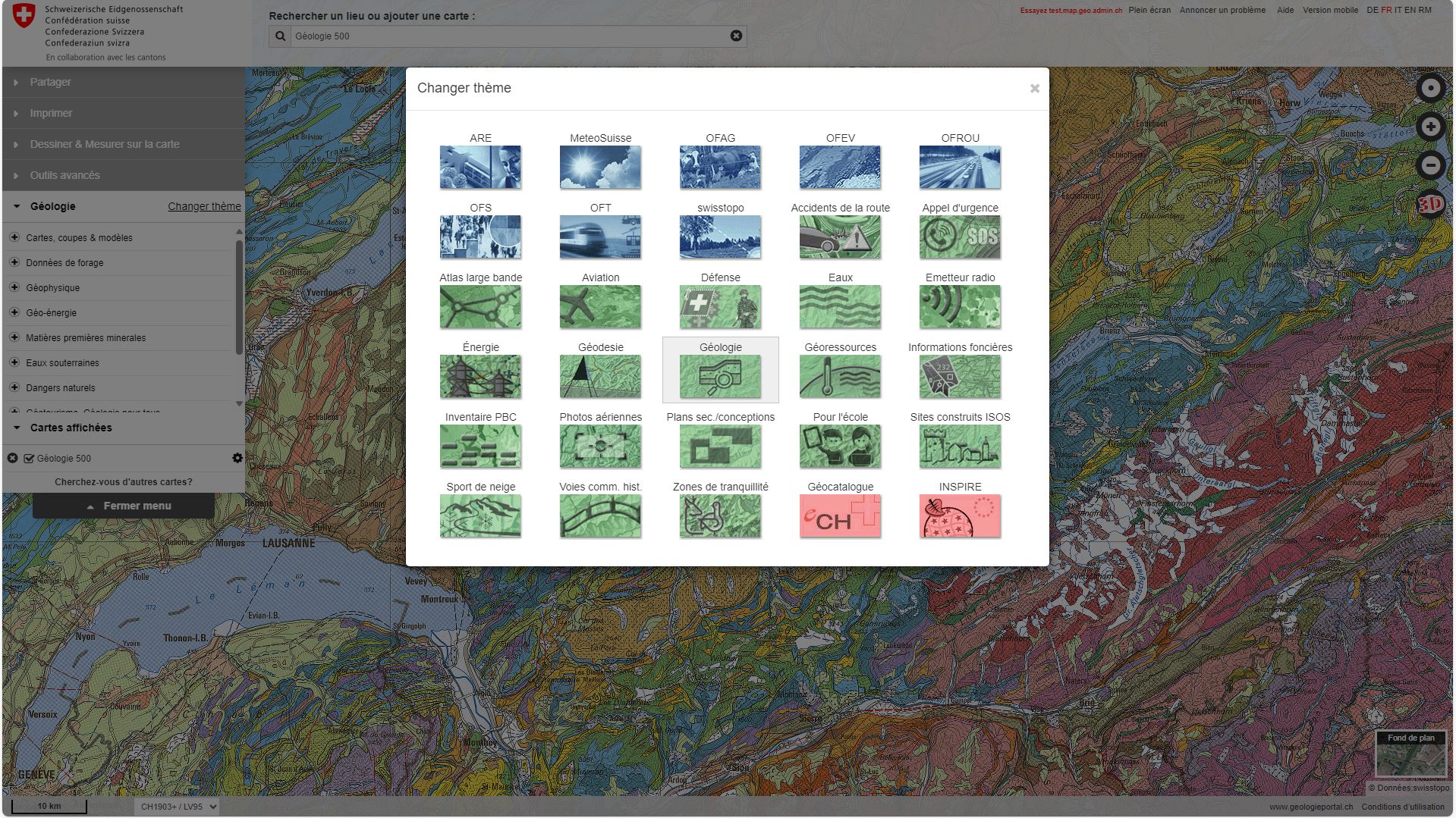 Les données géologiques et les données liées à la géologie sont affichées principalement sous les thèmes «Géologie» et «Géoressources» sur map.geo.admin.ch. L'offre existante est régulièrement complétée par d'autres jeux de données géologiques. Avec la recherche et l'interrogation d'attributs de jeux de données, la création de profils altimétriques et le téléchargement de données individuelles ou de jeux de données complets, map.geo.admin.ch devient un outil important pour le travail quotidien des spécialistes. La vaste offre s'adresse également aux enseignants, aux professionnels des médias et aux personnes non initiées intéressées.