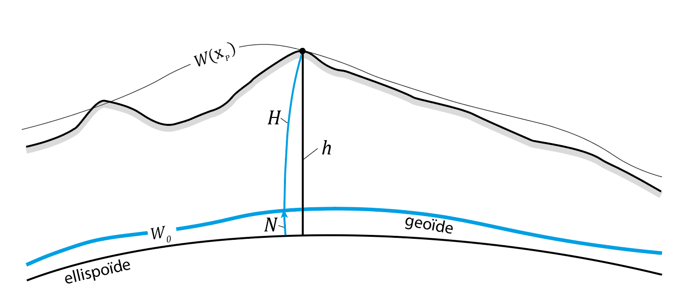 Les altitudes orthométriques sont univoques et se réfèrent au géoïde qui est une surface équipotentielle correspondant à la surface des océans prolongée sous les continents. Géométriquement, l’altitude orthométrique H correspond à la distance curviligne le long de la ligne d’aplomb entre le point considéré et son point correspondant sur la surface du géoïde. Elle est reliée à l’altitude ellipsoïdale h par la cote du géoïde N :