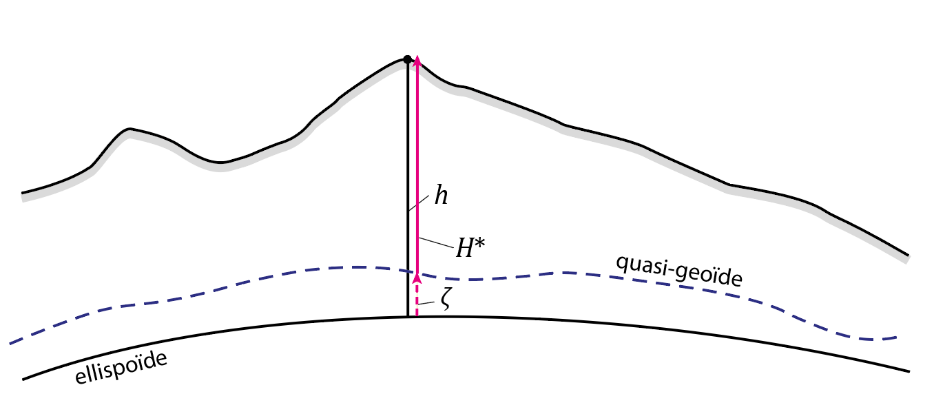 Contrairement aux altitudes orthométriques, les altitudes normales ne se réfèrent pas au géoïde, ni à une autre surface équipotentielle. Leur surface de référence est appelée quasi-géoïde. Enfin, pour obtenir une altitude normale à partir d’une hauteur ellipsoïdale h mesurée par GNSS, on applique une relation analogue à celle utilisée pour les altitudes orthométriques. Cependant, au lieu de la cote du géoïde N, on soustrait l’anomalie de hauteur 𝜁 :