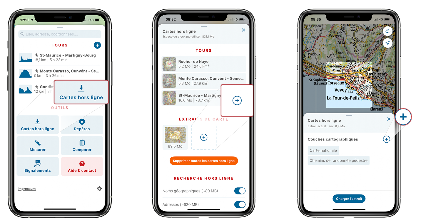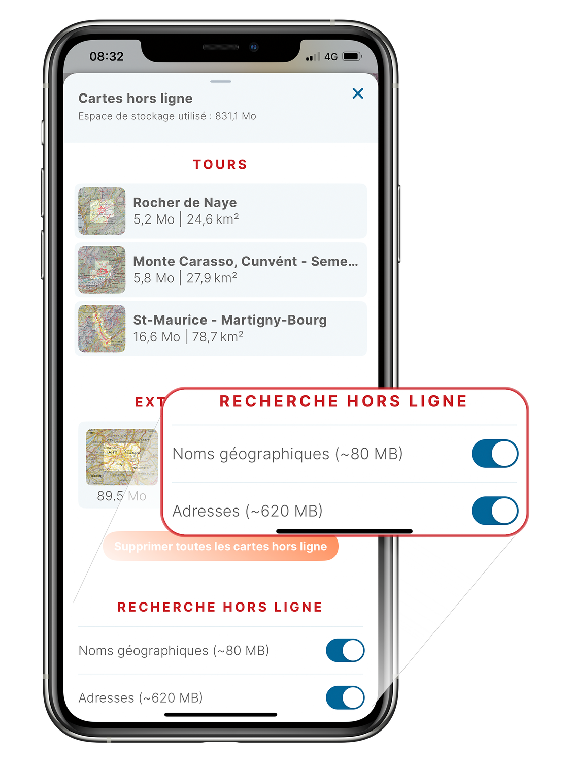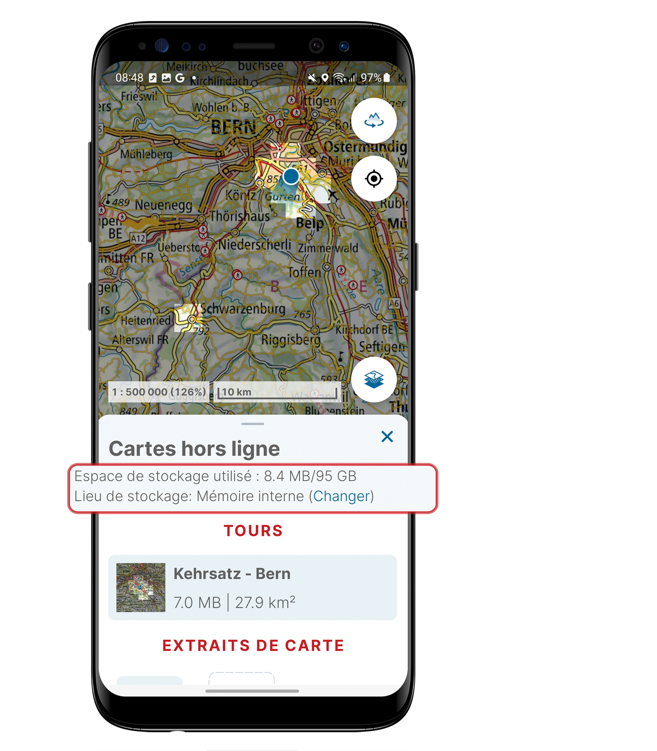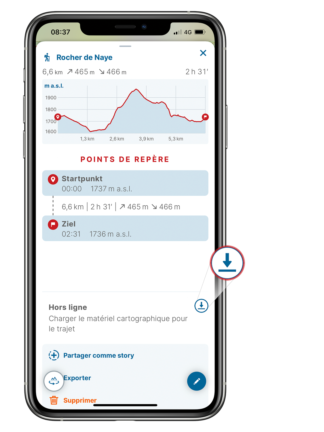 Pour cela, sélectionnez le tour souhaité et balayez le menu des tours pour l’ouvrir jusqu’en haut. En bas dans le menu sous « Hors ligne », vous pouvez, au moyen du bouton Téléchargement, télécharger les cartes pour votre itinéraire. Les cartes des zones longeant l’itinéraire sont téléchargées en prévoyant une bonne marge.