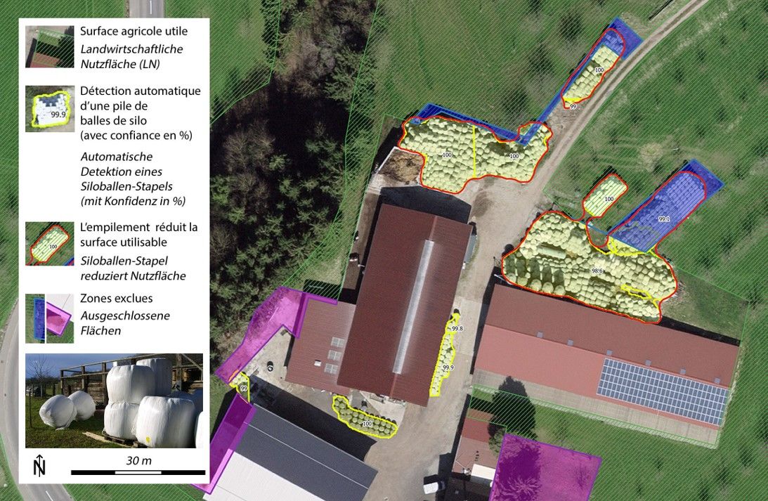 La détection de balles d’ensilage a été le premier indicateur pour le contrôle. En effet, si des balles d’ensilage sont entreposées sur une surface verte, cette dernière ne peut être considérée comme SAU. Comme les balles d’ensilage ont une petite emprise au sol, les corrections à la couche SAU sont minimes.