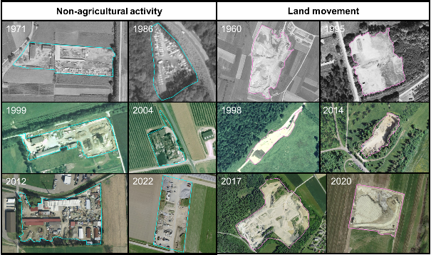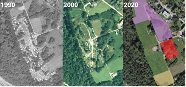 Une vérité de terrain a été créée par les experts pour les classes « activité non agricole » et « mouvement de terrain ». Elle comprend une sélection d’objets entre 1950 et 2023 et a servi à entraîner le détecteur d’objets du STDL à segmenter les deux classes d’intérêt à travers les années. Des tests ont été menés afin d’homogénéiser les couleurs desles images RGB et en noir et blanc, mais au final, travailler avec les images originales donnait les meilleurs résultats.