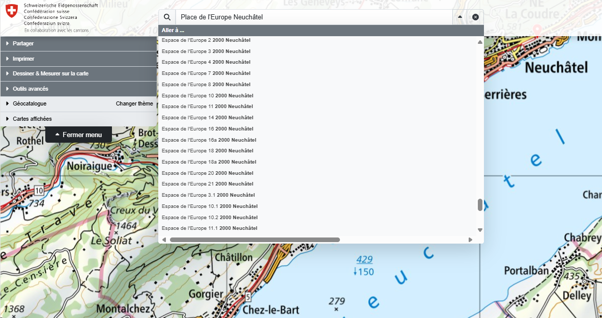Le service de recherche pour les adresses de bâtiments, accessible soit via l’API ou via l’outil de recherche dans map.geo.admin.ch, utilise de nouveau un algorithme de « fuzzy search ». Qu'est-ce que cela signifie ? La « fuzzy search » permet de retrouver non seulement les saisies exactes mais également des saisies approximatives ("Place de l’Europe, 2000 Neuchâtel" (faux) au lieu de «Espace de l’Europe, 2000 Neuchâtel» (vrai)).