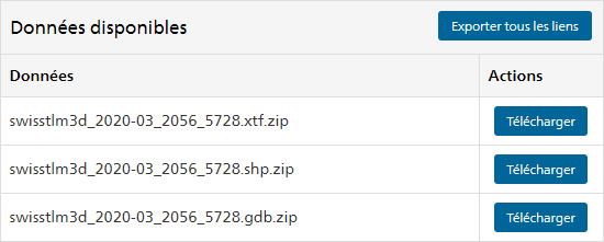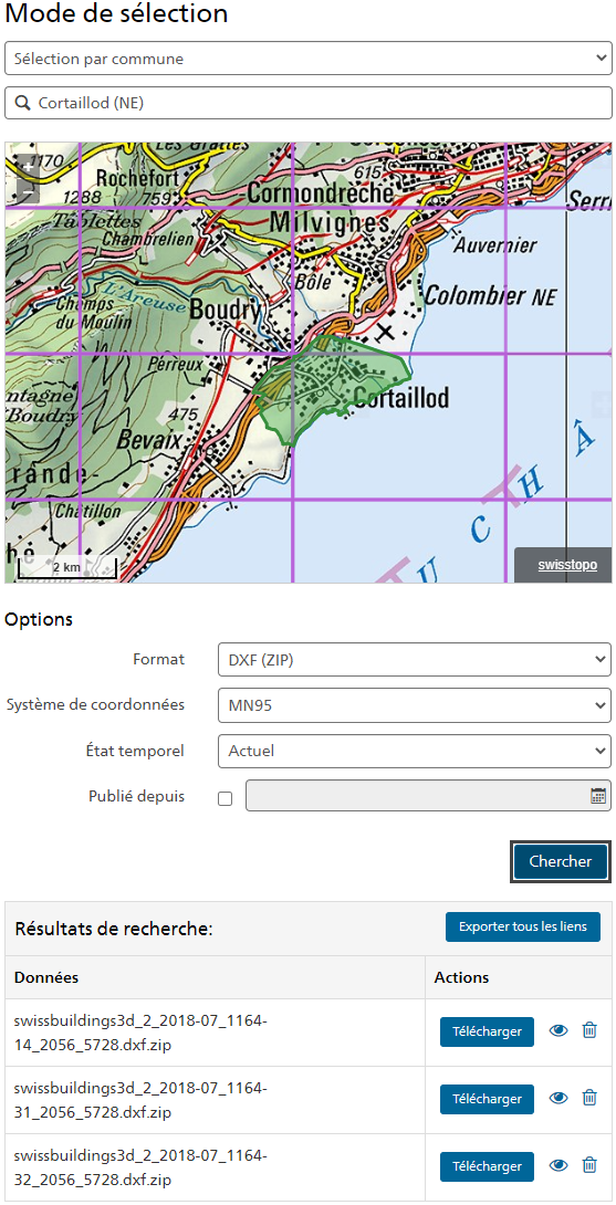 Vous pouvez mettre en évidence le périmètre de chaque unité de la liste de téléchargement sur la carte en ligne et ainsi affiner votre sélection spatiale, par exemple en supprimant des unités individuelles de la liste. Vous pouvez ensuite exporter une liste avec tous les liens au format CSV ou vous pouvez télécharger les unités individuellement.