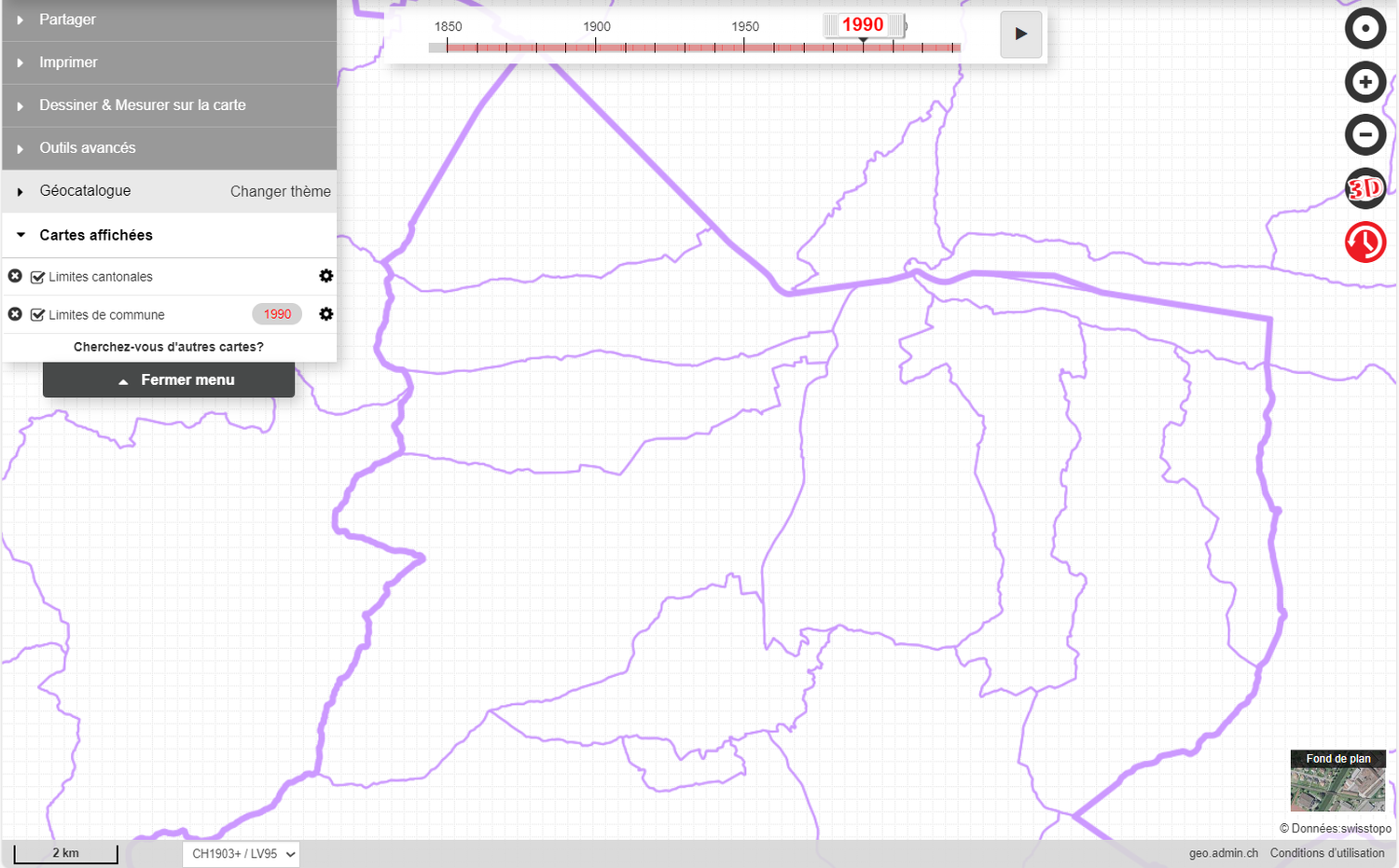 La couche limites de commune comprend les limites administratives des communes de la Suisse et de la Principauté de Liechtenstein. Par défaut, l'état actuel des limites de commune est affiché. Avec l'outil de représentation historique des données – nommé « voyage dans le temps » - l’évolution des limites de communes 1850 à nos jours est interactive. Lorsqu’une année antérieure à l’état actuel est sélectionnée, l’état des limites de commune au premier janvier est affiché. Deux sources de données ont été utilisées pour générer cette couche : «Limites communales : série temporelle depuis 1850» de l’Office fédéral de la statistique pour la période 1850 – 2015 et swissBOUNDARIES3D de l’Office fédéral de topographie pour la période 2016 à aujourd’hui.