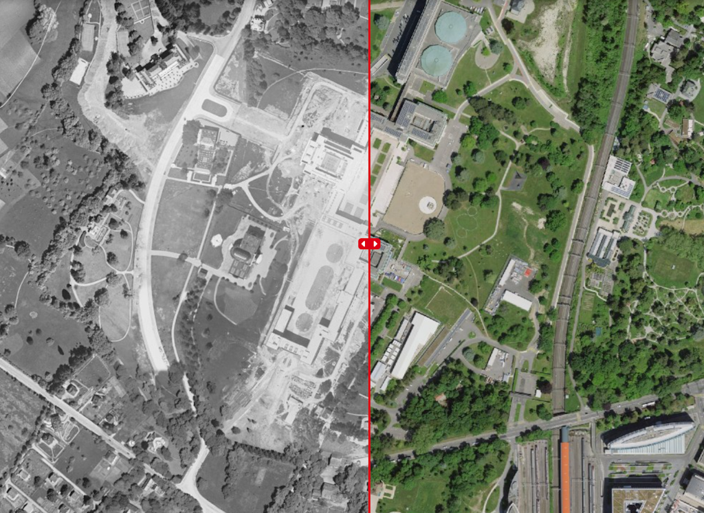 La mosaïque d'orthophotos SWISSIMAGE HIST est un assemblage des images aériennes historiques (avant 1998) en noir et blanc sur l'ensemble de la Suisse avec une résolution au sol de 50 cm.