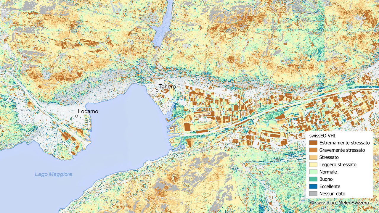 État de santé de la végétation dans la plaine de Magadino («swissEO VHI» du 15 juillet 2023). Cette carte combine les données satellitaires de Sentinel-2 et de Meteosat et montre la végétation stressée par des facteurs tels que la sécheresse, les maladies, les chablis ou les interventions humaines par rapport à la période de référence climatique 1991-2020.