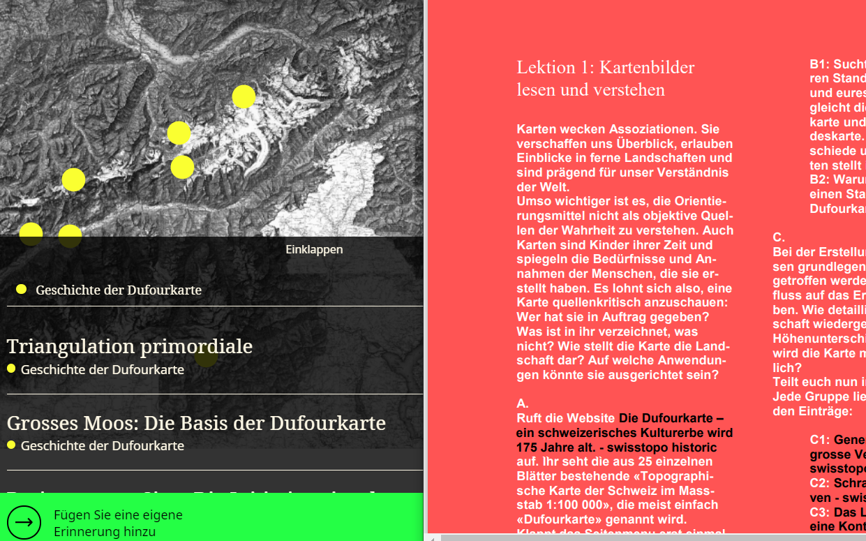 L’application web interactive swisstopo historic est à la disposition du personnel enseignant. Elle retrace l’histoire de la carte Dufour, et donc celle de la mensuration nationale de la Suisse, expliquée de A à Z. Elle s’adresse aux élèves du degré secondaire supérieur, du lycée et des écoles professionnelles.