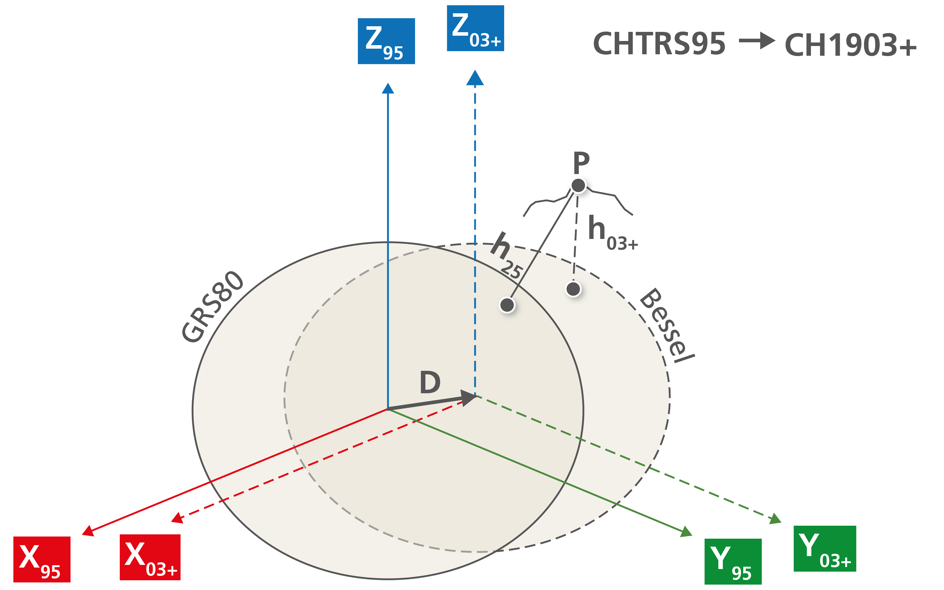 Les systèmes de référence tridimensionnels cartésiens CHTRS95 et CH1903+ peuvent être transformés l’un dans l’autre avec exactitude au moyen de trois translations. Cette méthode peut également être appliquée sans restriction à des jeux de coordonnées des cadres de référence CHTRFyyyy et MN95. Il reste toutefois à prendre en compte les différences au niveau des dimensions des ellipsoïdes et des projections cartographiques.