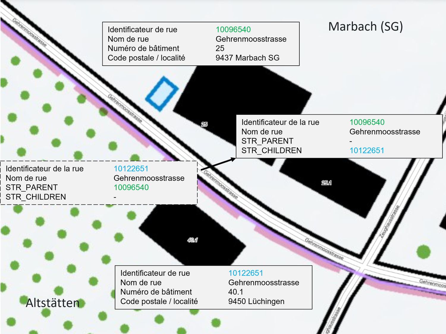 La rue Gehrenmoosstrasse se trouve sur la commune de Marbach (SG). Cependant, le bâtiment 40.1 de la commune d’Altstätten est adressé également sur la rue Gehrenmoosstrasse. Chacune des deux communes doit attribuer un ESID à la rue. L’ESID 10096540 attribué par la commune Marbach (SG) est ce qu’on appellera l’ESID « parent ». C’est la géométrie liée à cet ESID qui sera notamment visualisable sur map.geo.admin.ch. L’ESID 10122651 est quant à lui un ESID « enfant ». La géométrie de cet ESID sera un point.