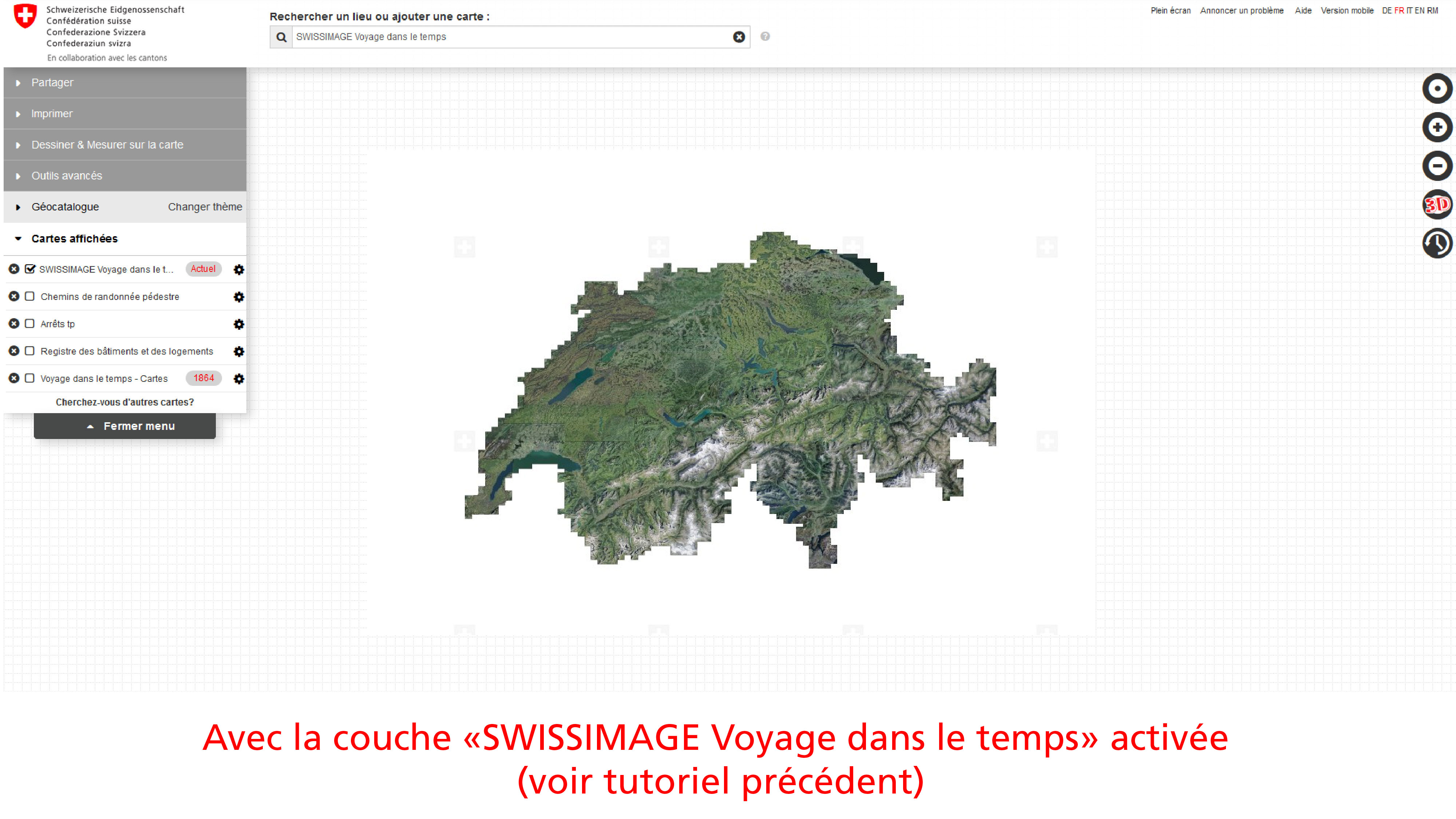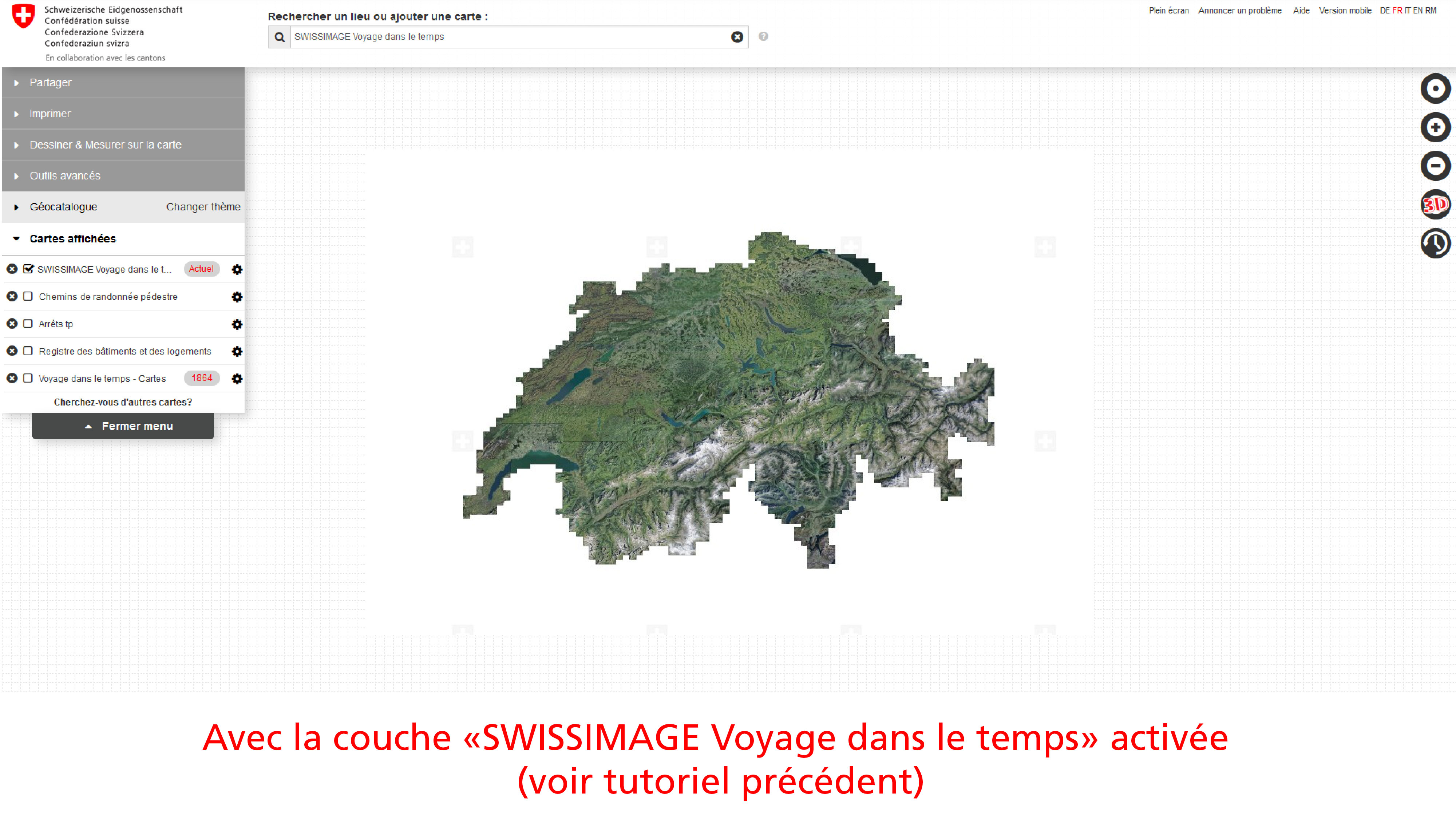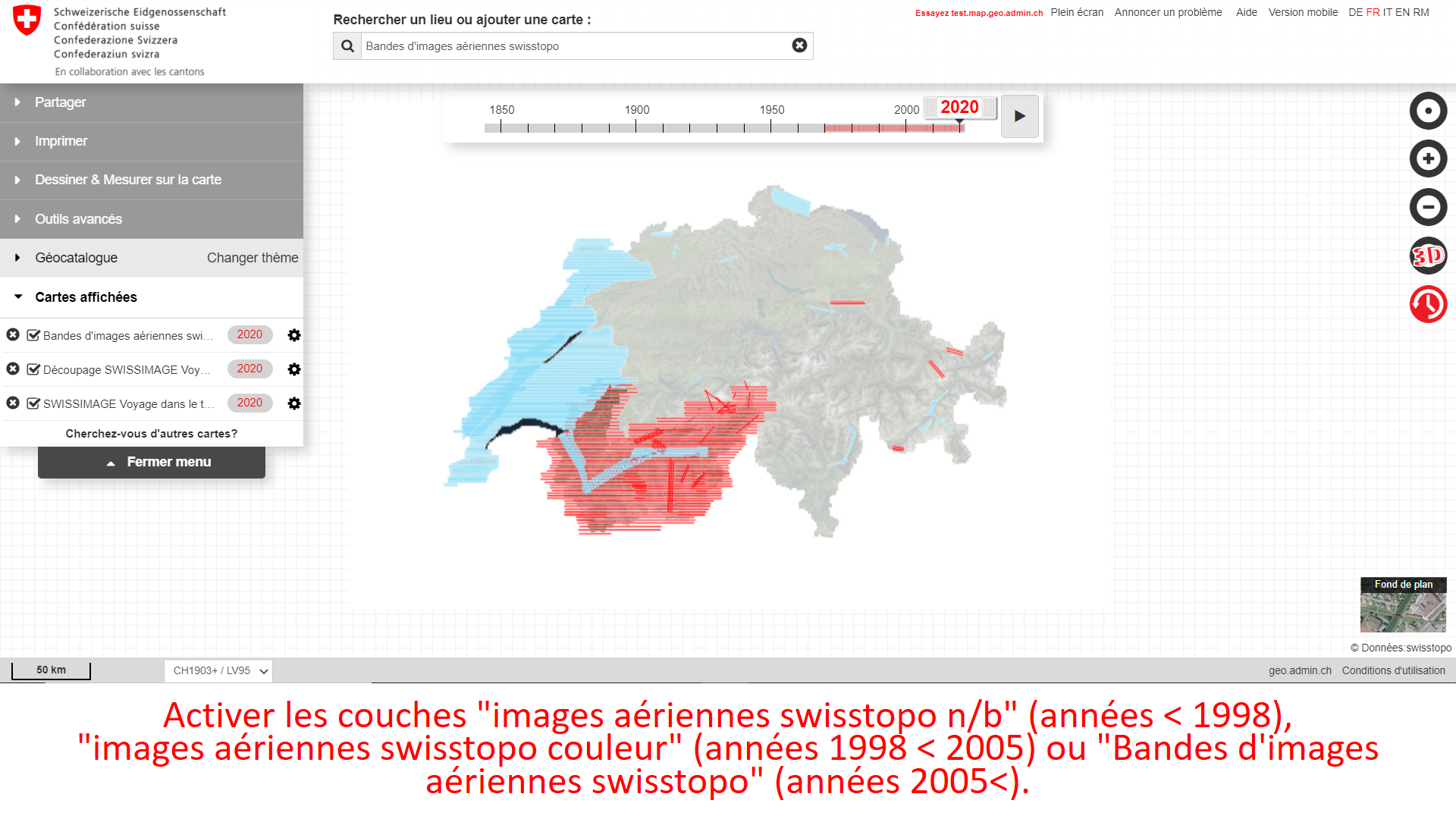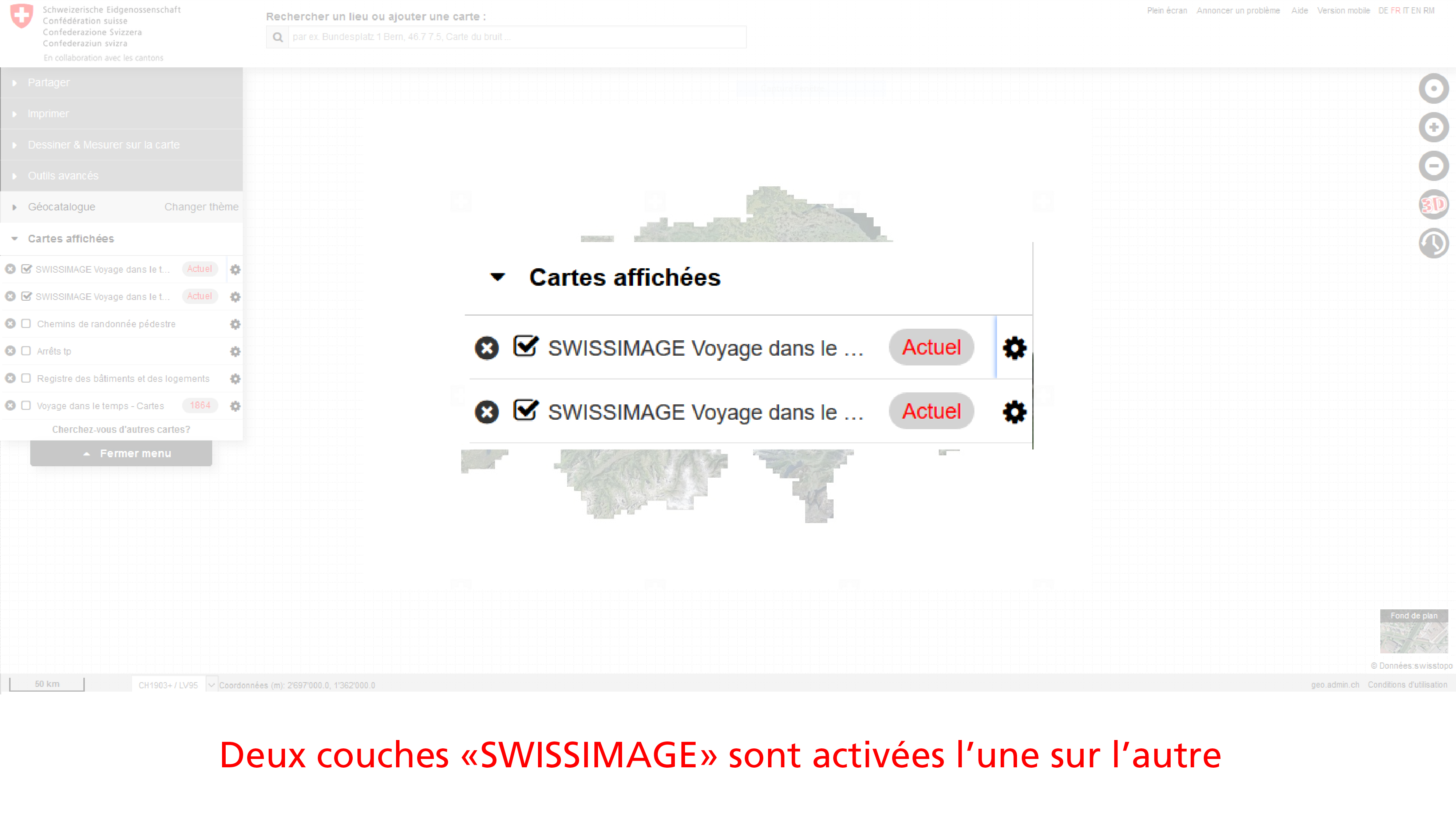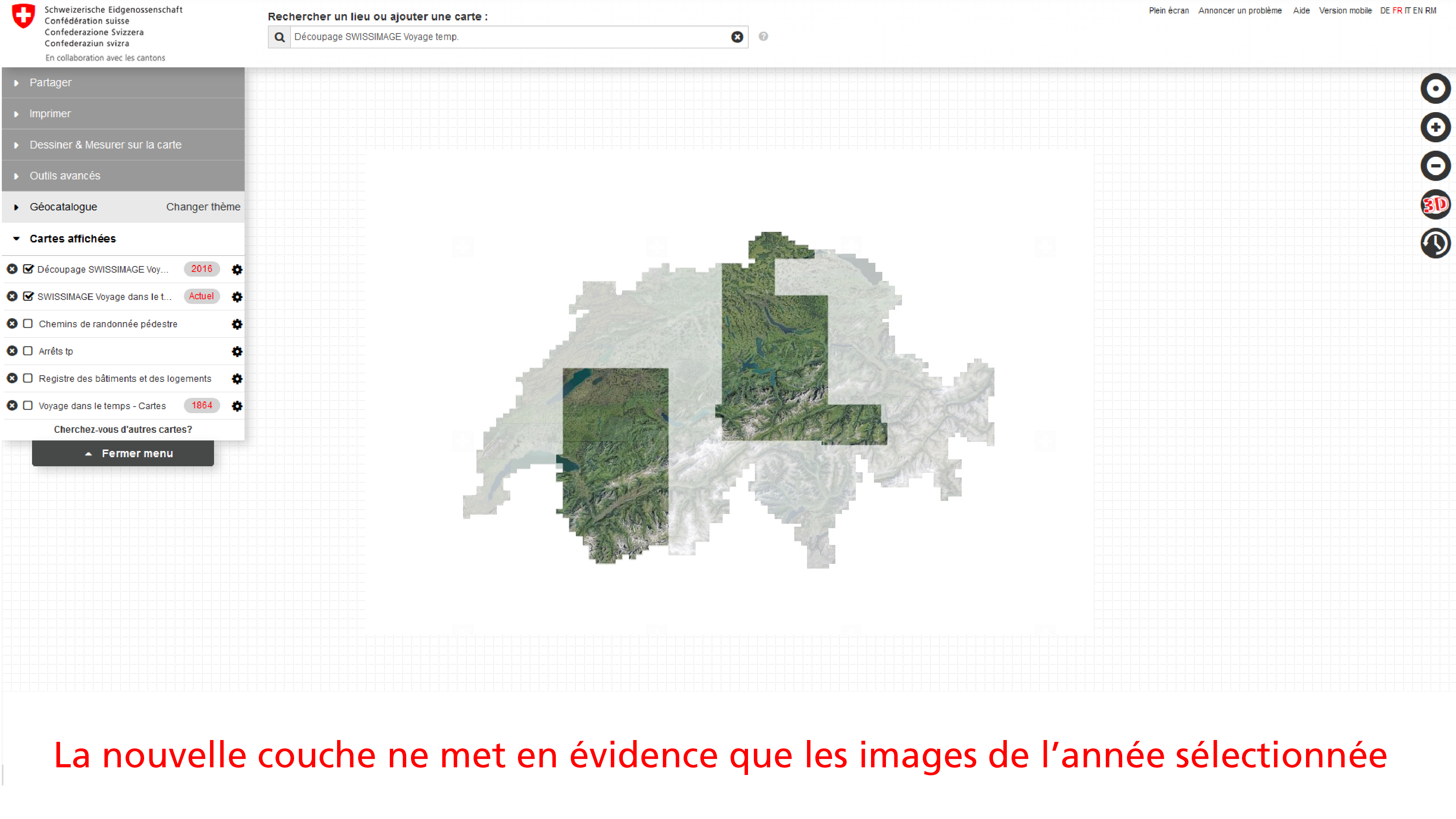 Le "Voyage dans le temps - images aériennes" est intégré dans le géoportail fédéral map.geo.admin.ch avec la couche « SWISSIMAGE Voyage dans le temps ». Deux variantes sont possibles pour la visualisation :