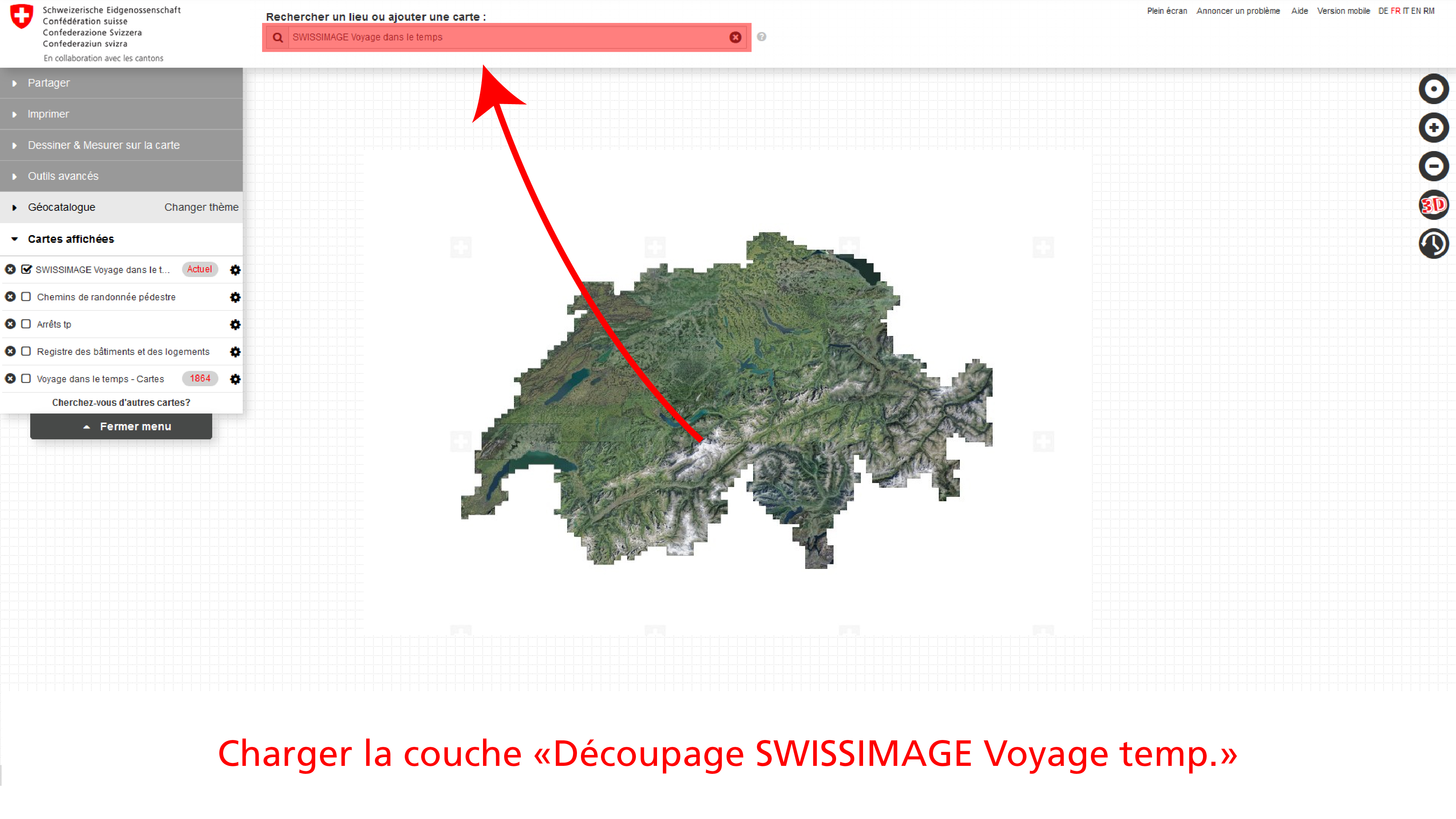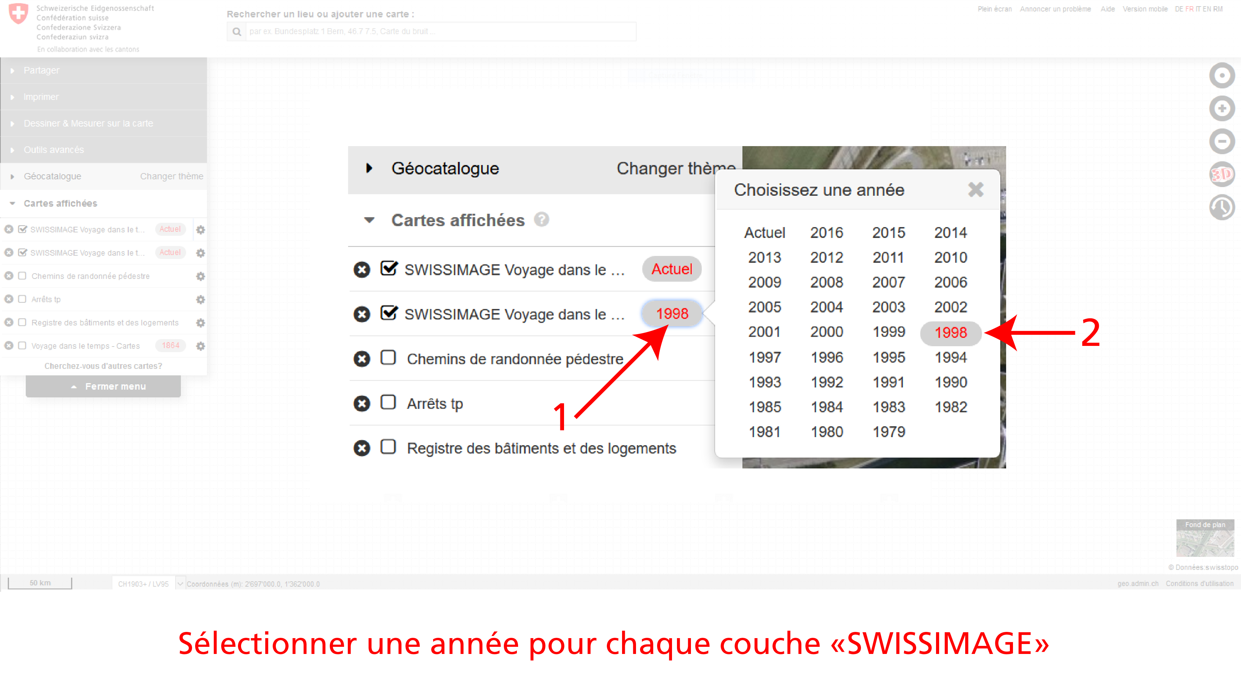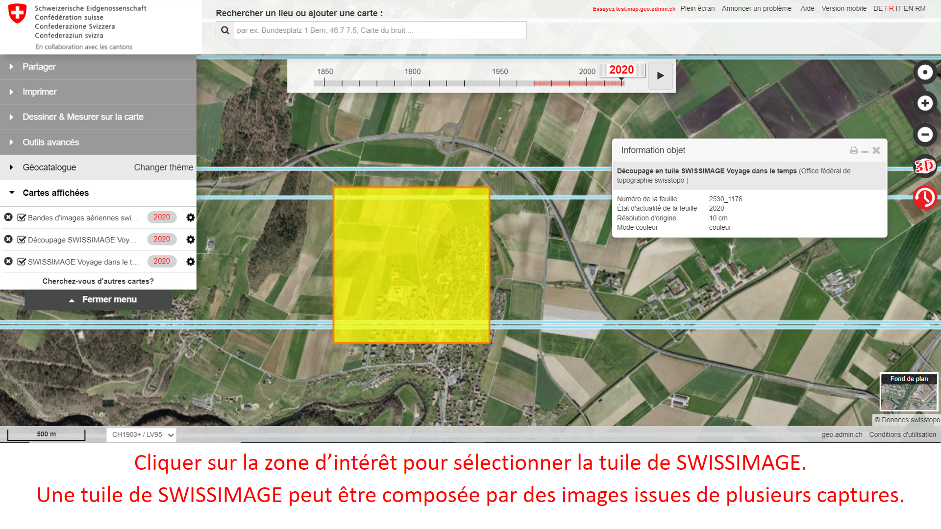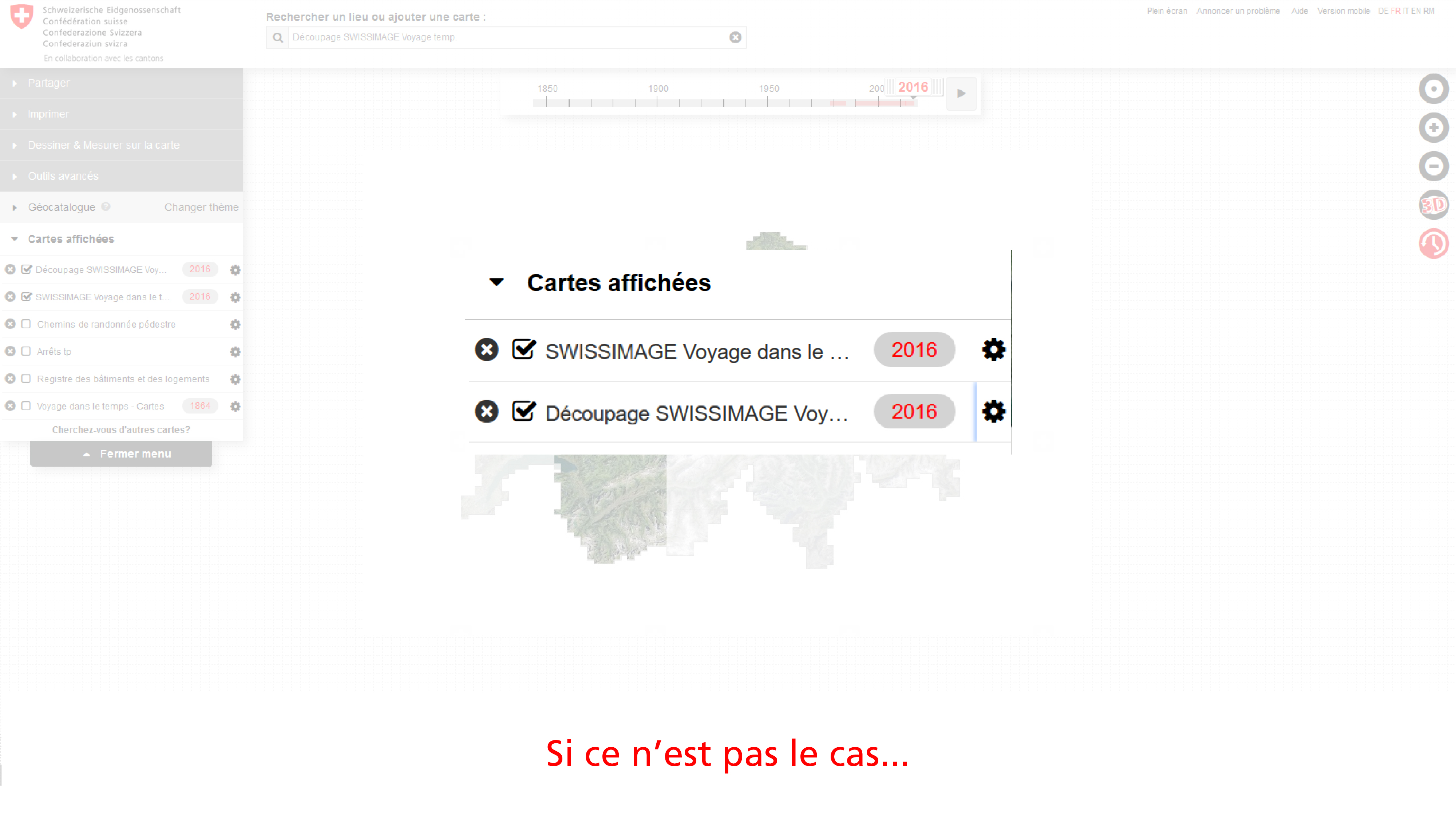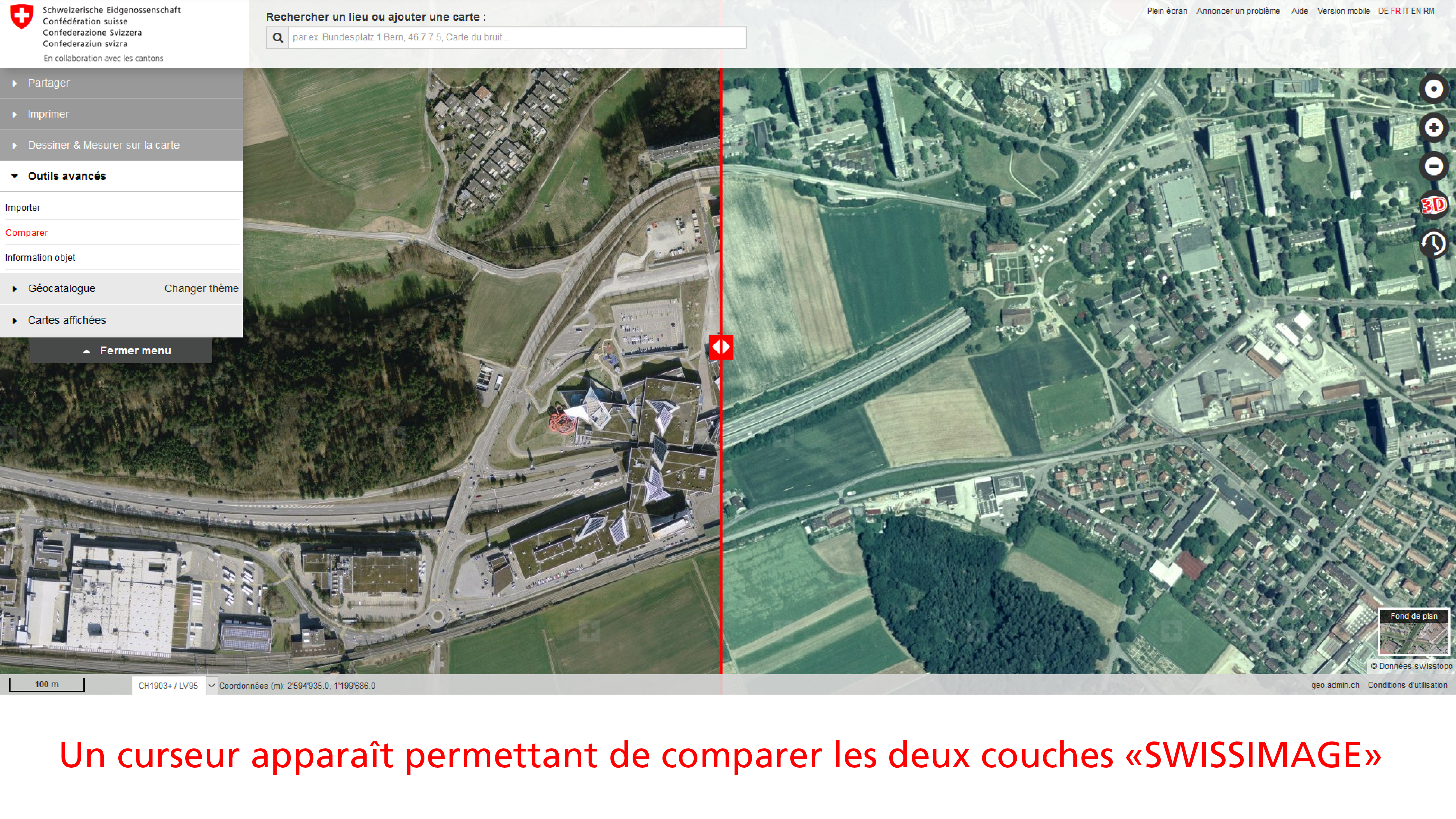 Le "Voyage dans le temps - images aériennes" est intégré dans le géoportail fédéral map.geo.admin.ch avec la couche « SWISSIMAGE Voyage dans le temps ». Deux variantes sont possibles pour la visualisation :