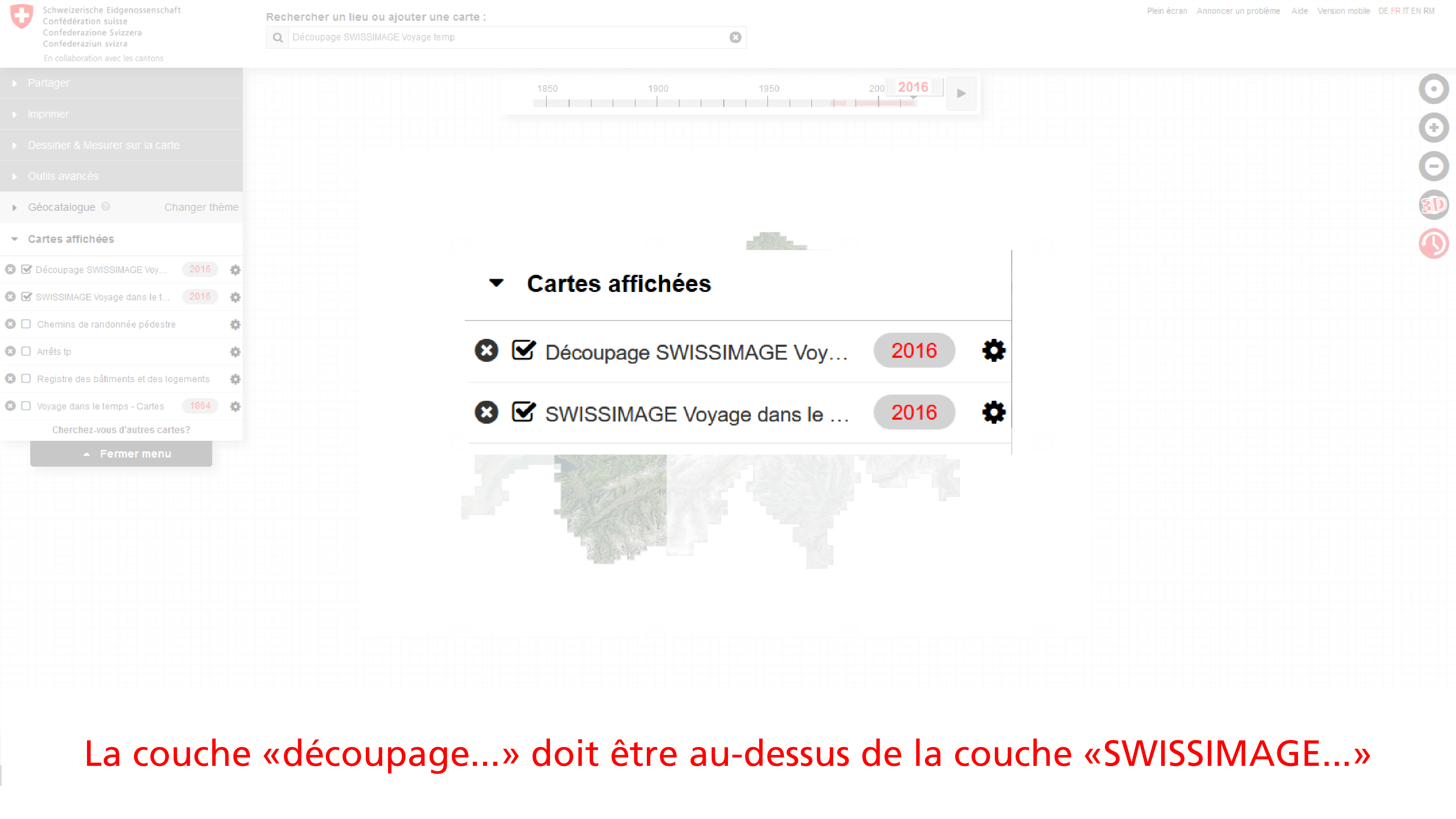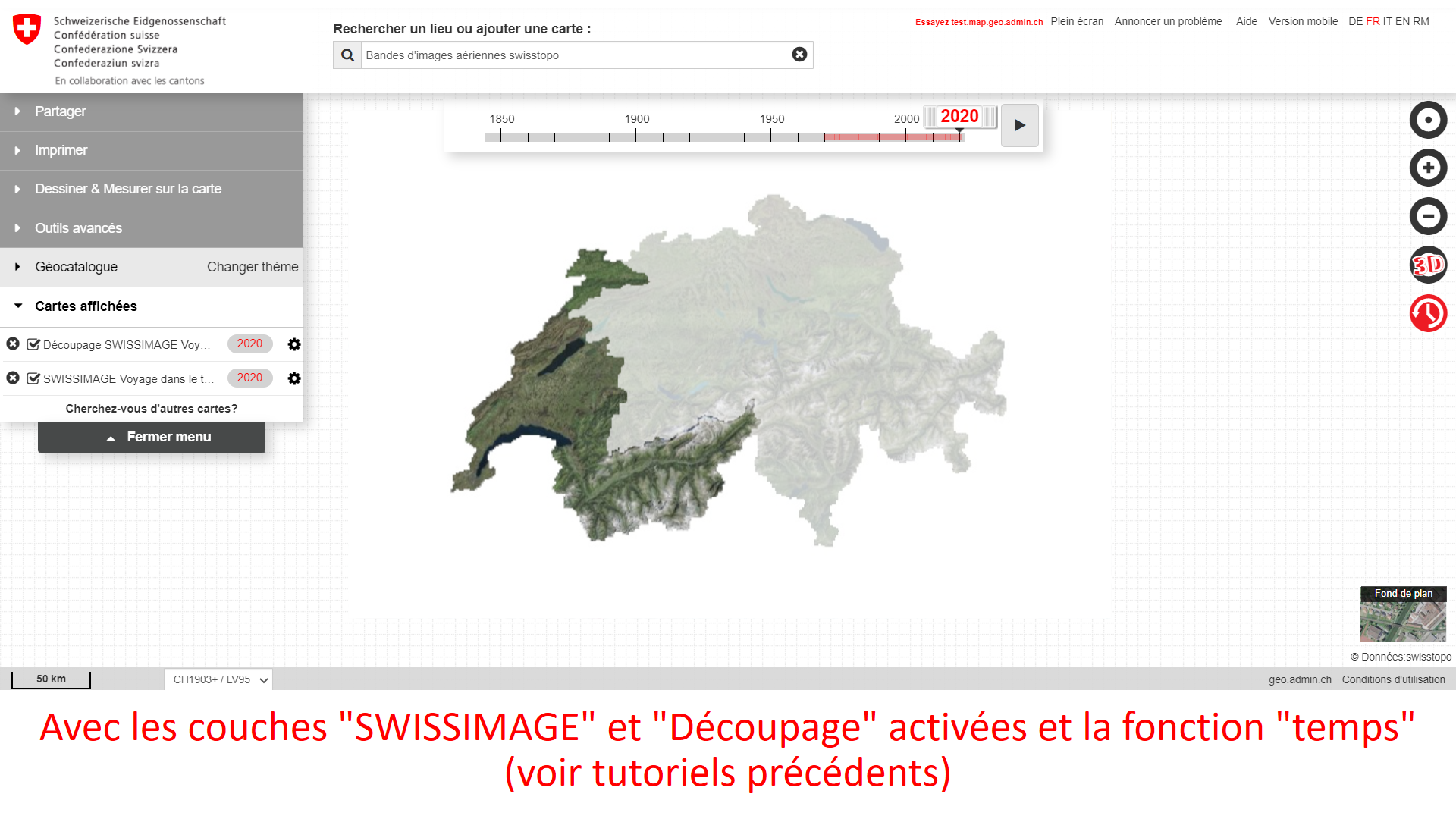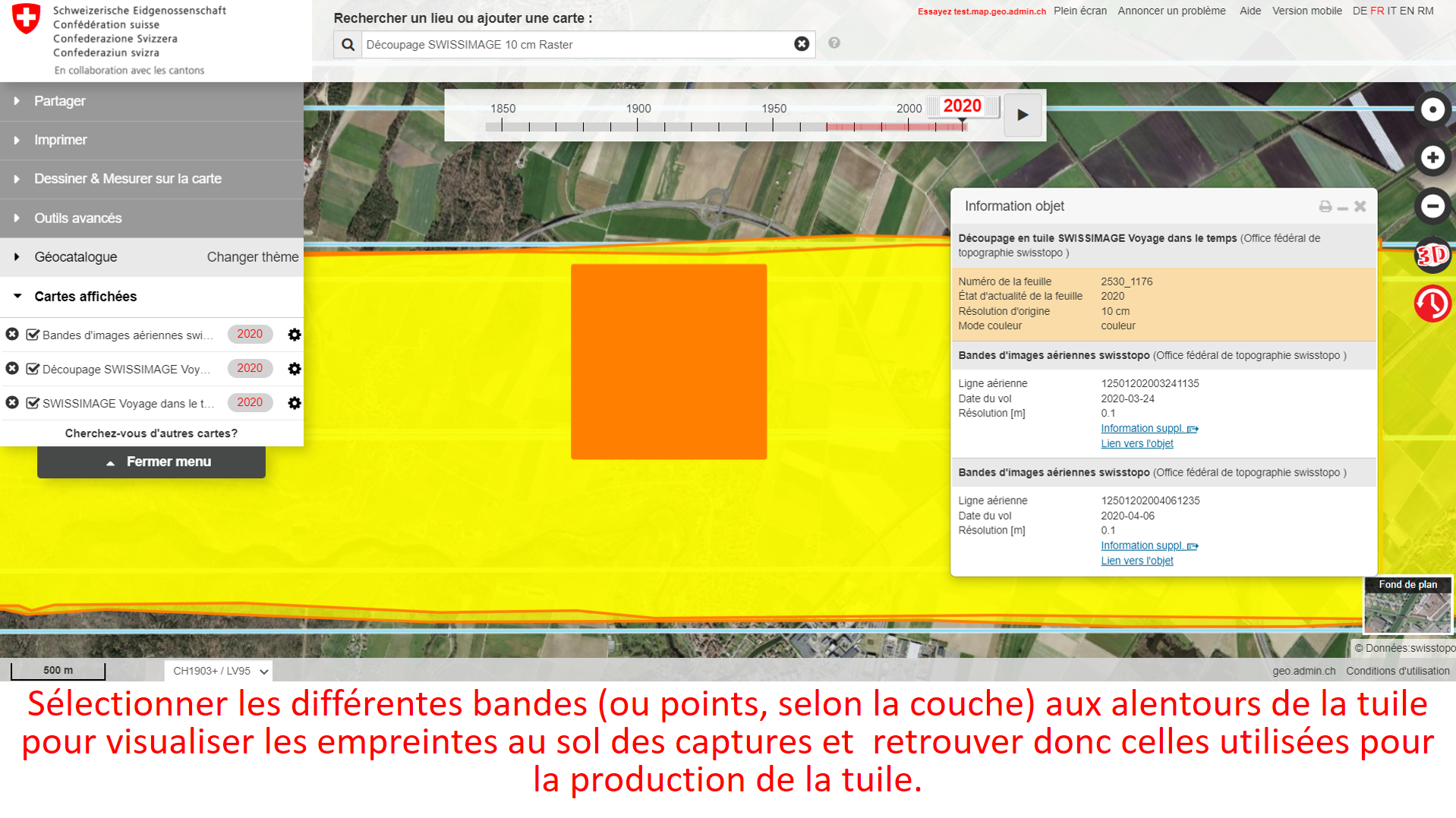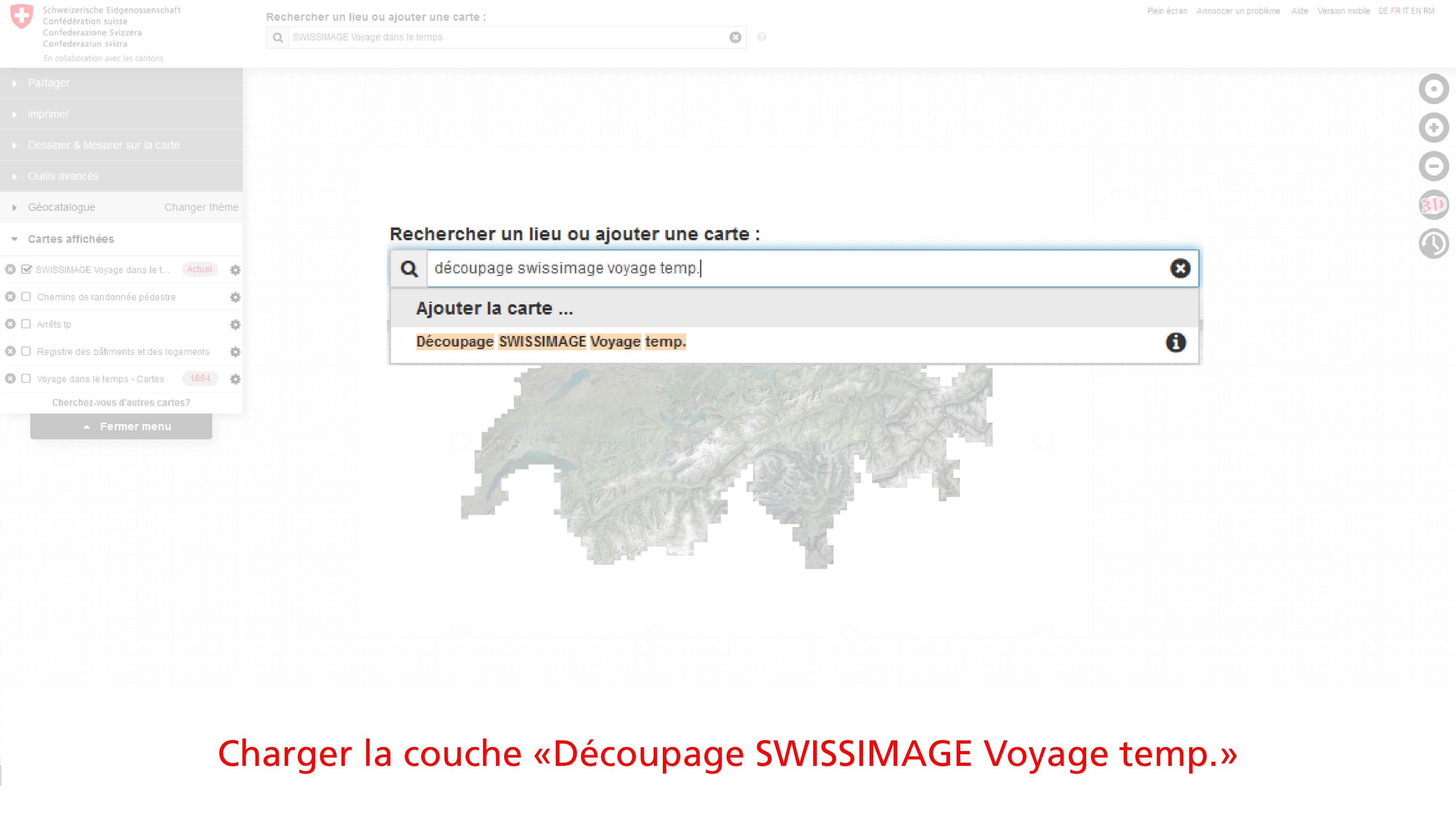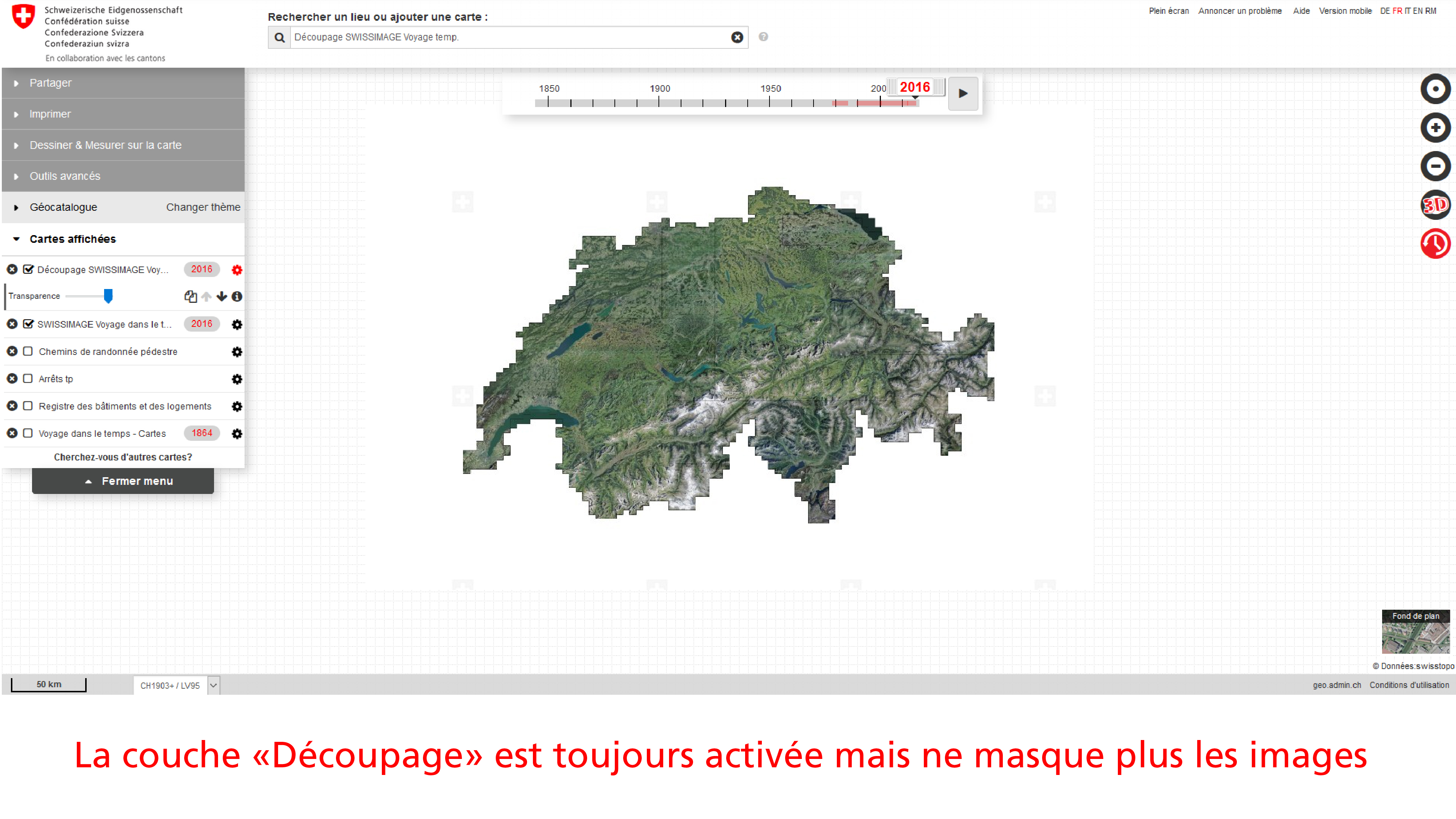 Le "Voyage dans le temps - images aériennes" est intégré dans le géoportail fédéral map.geo.admin.ch avec la couche « SWISSIMAGE Voyage dans le temps ». Deux variantes sont possibles pour la visualisation :