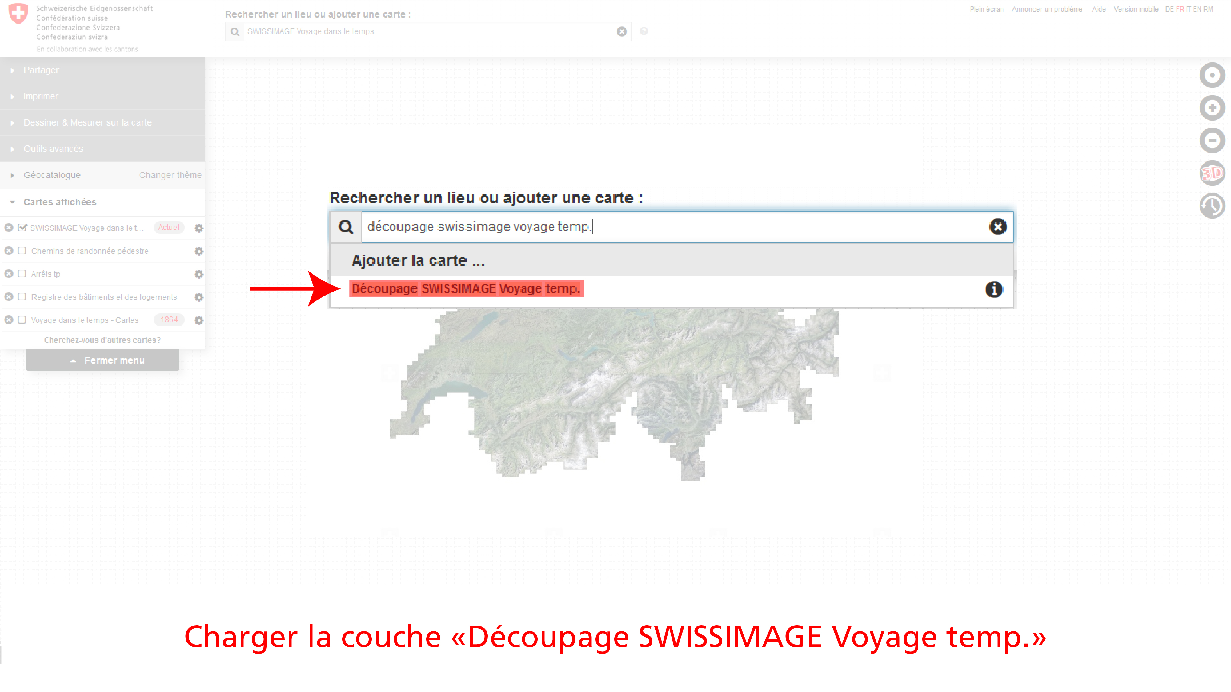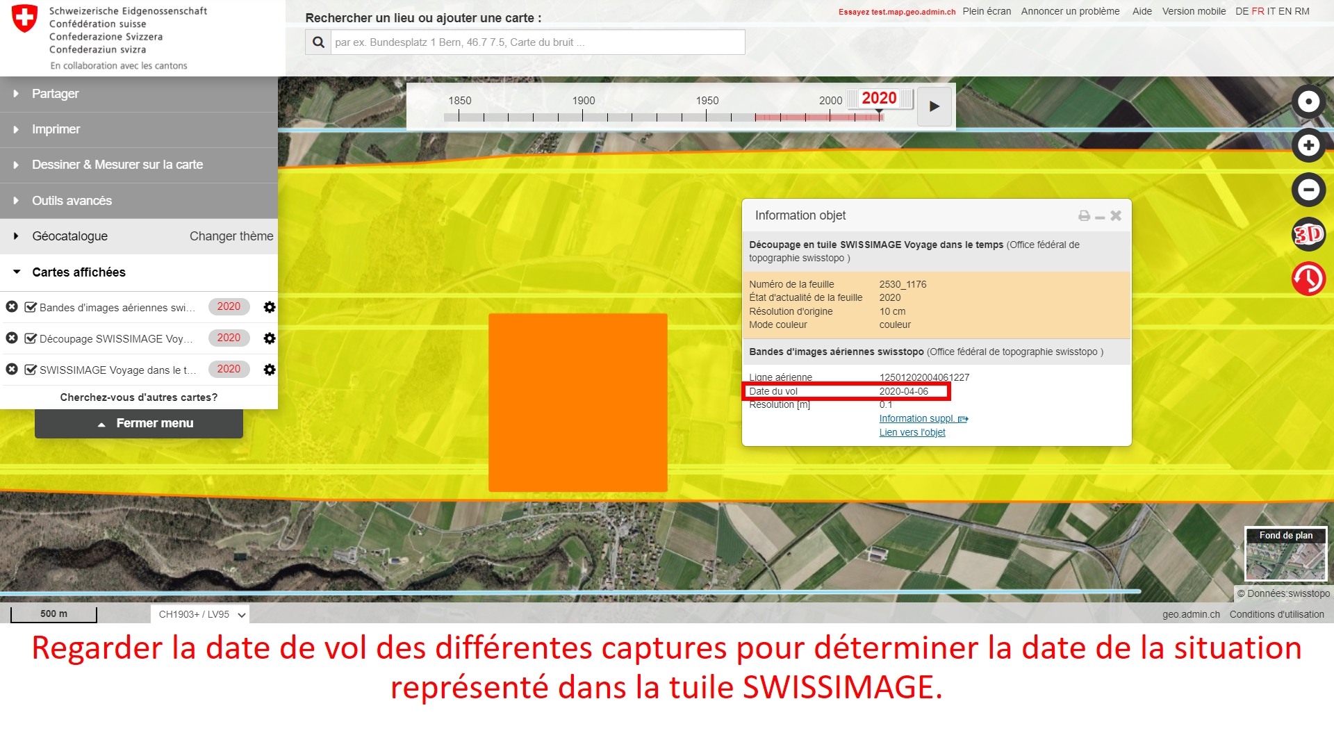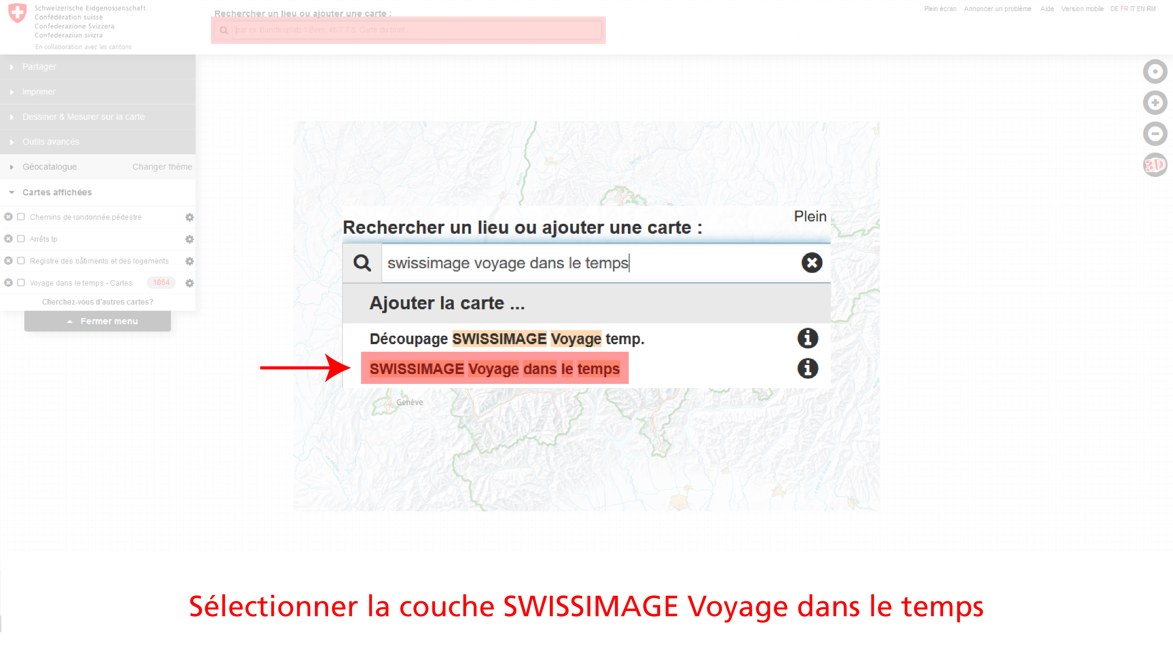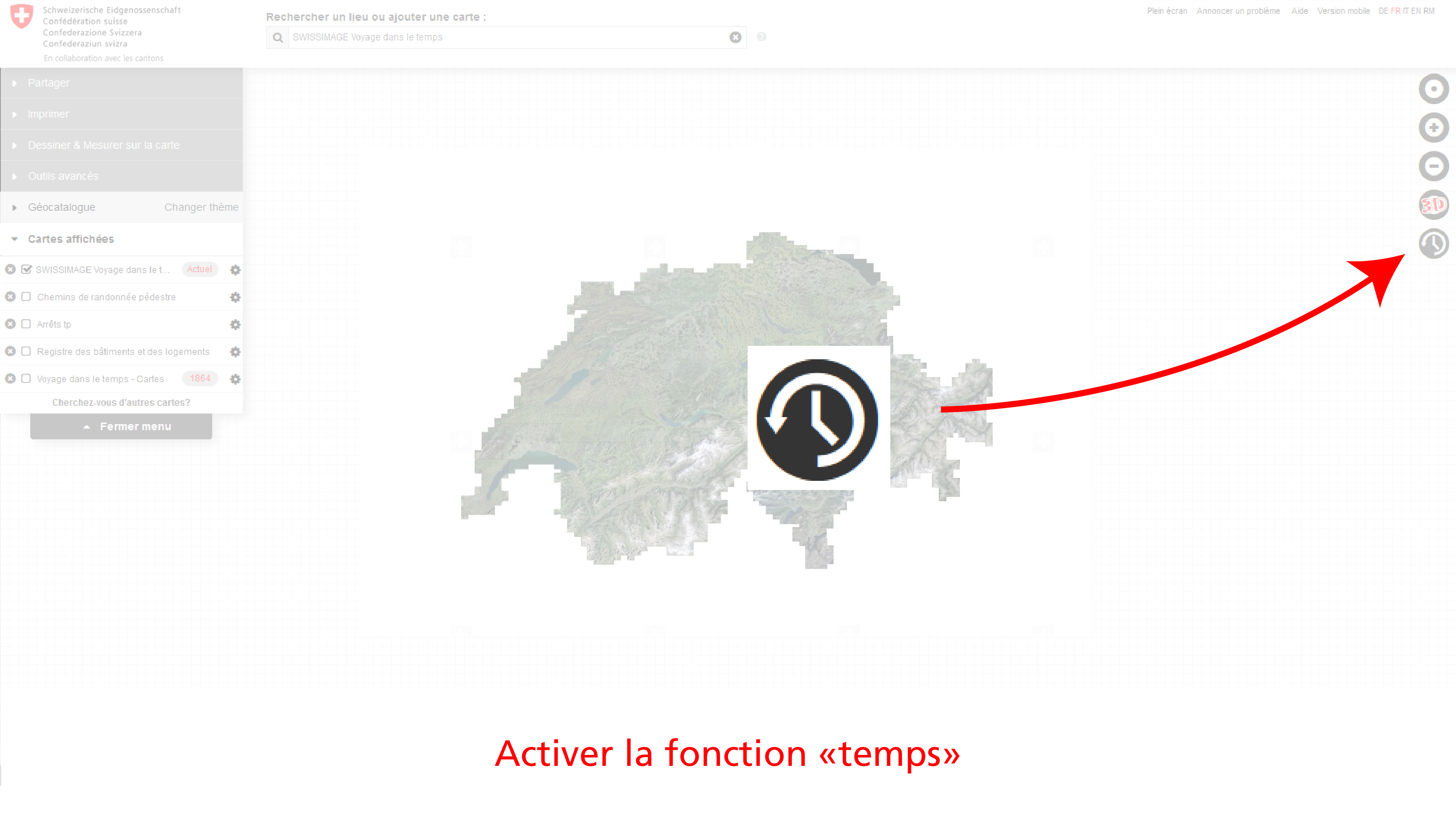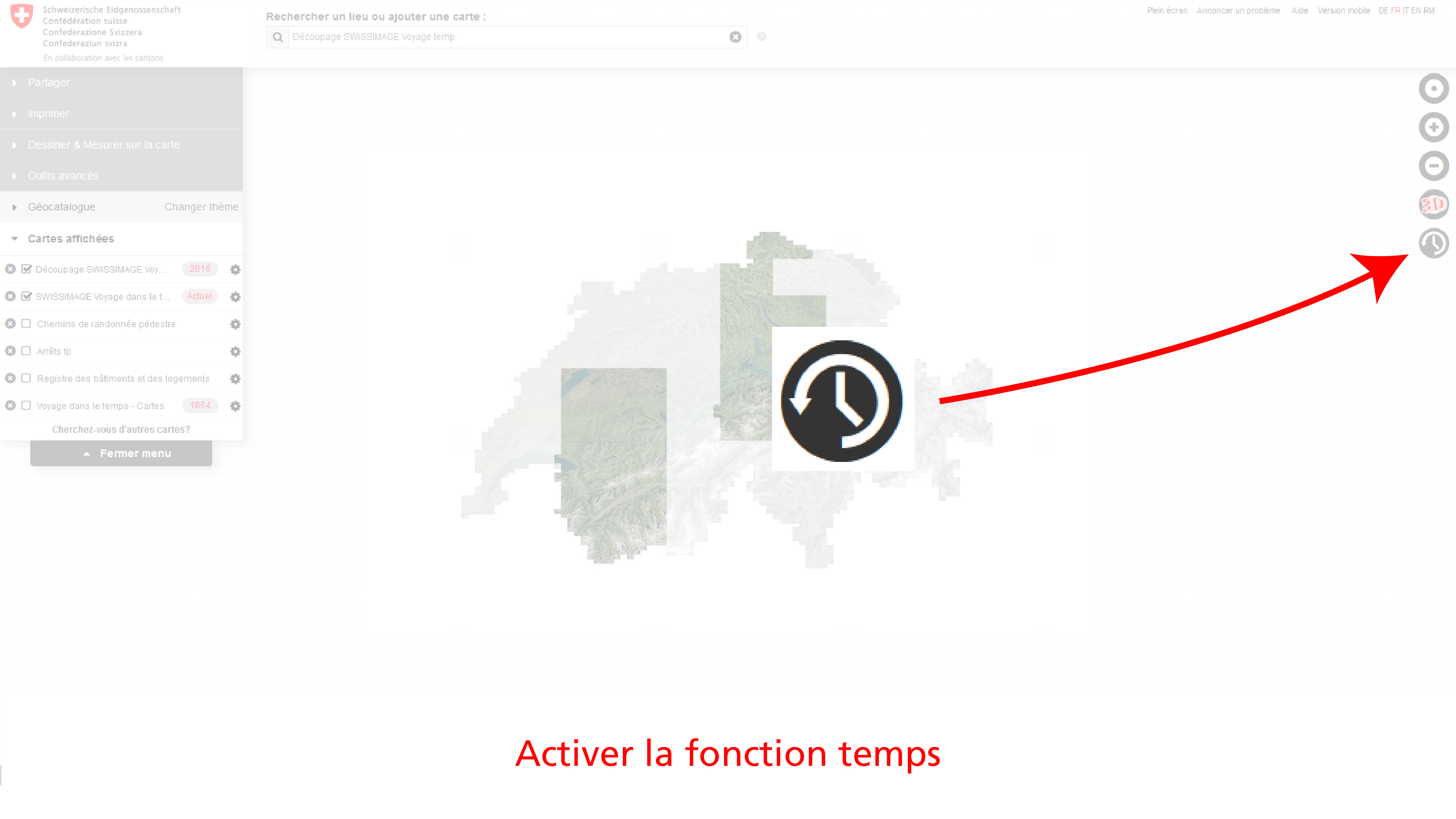 Le "Voyage dans le temps - images aériennes" est intégré dans le géoportail fédéral map.geo.admin.ch avec la couche « SWISSIMAGE Voyage dans le temps ». Deux variantes sont possibles pour la visualisation :