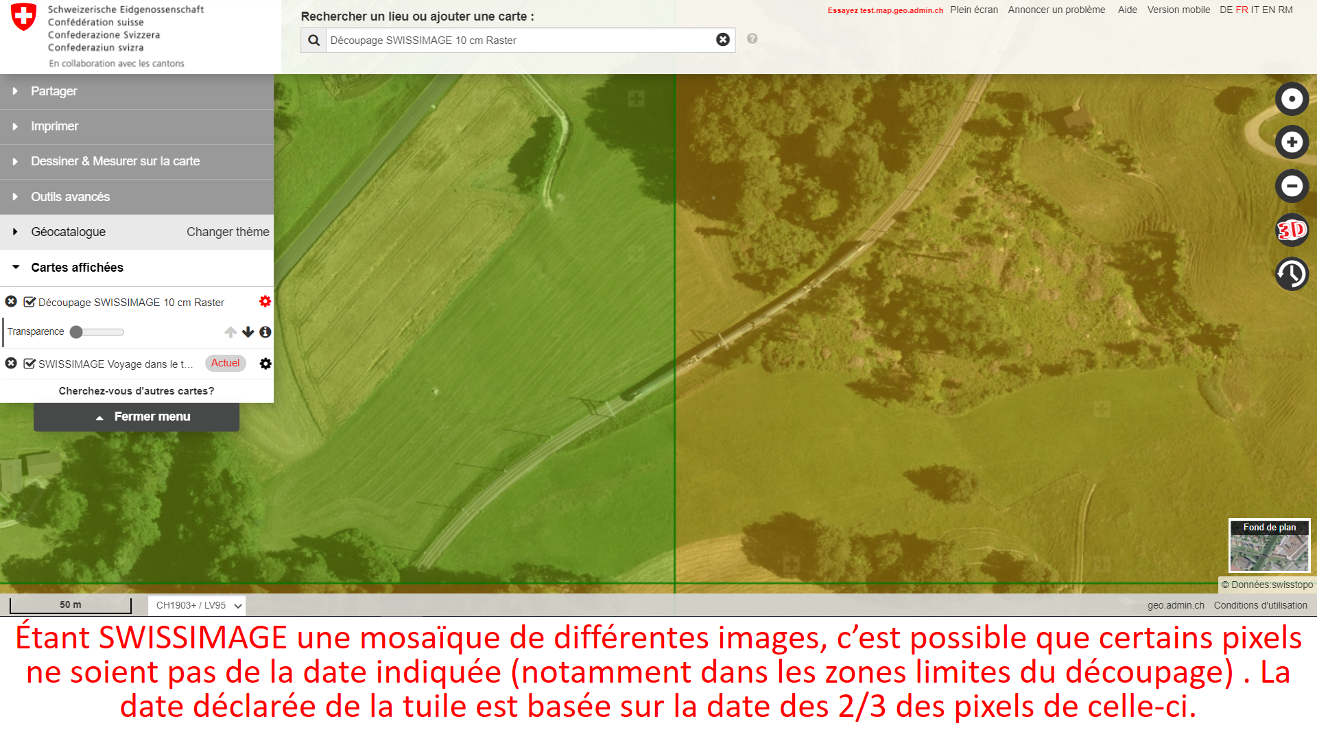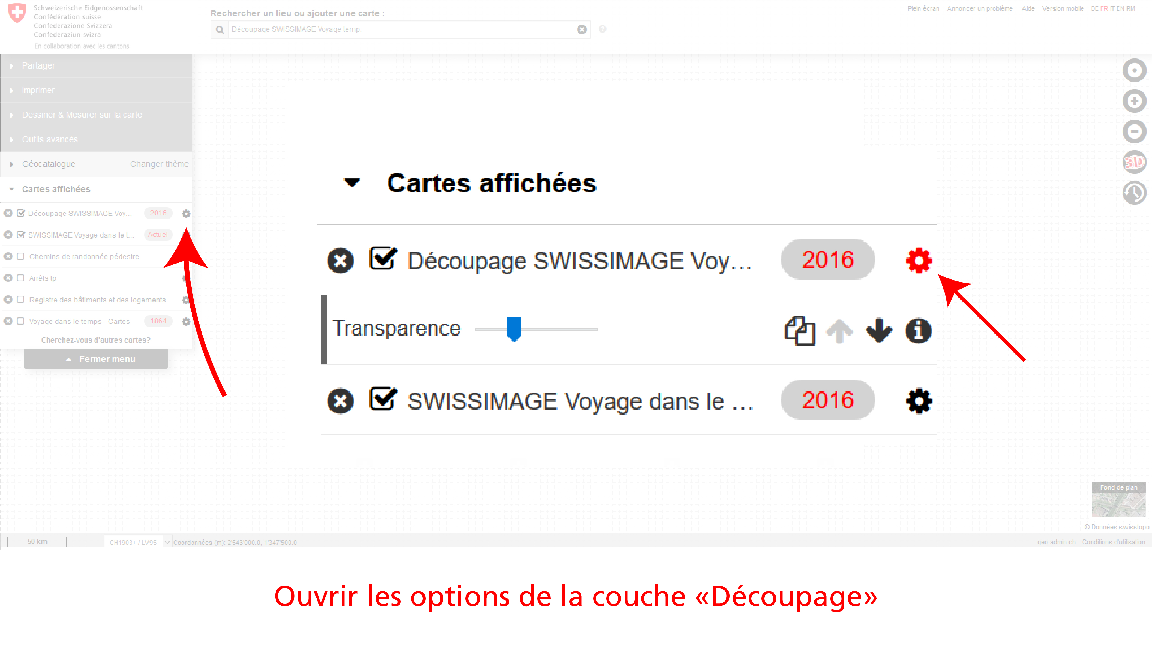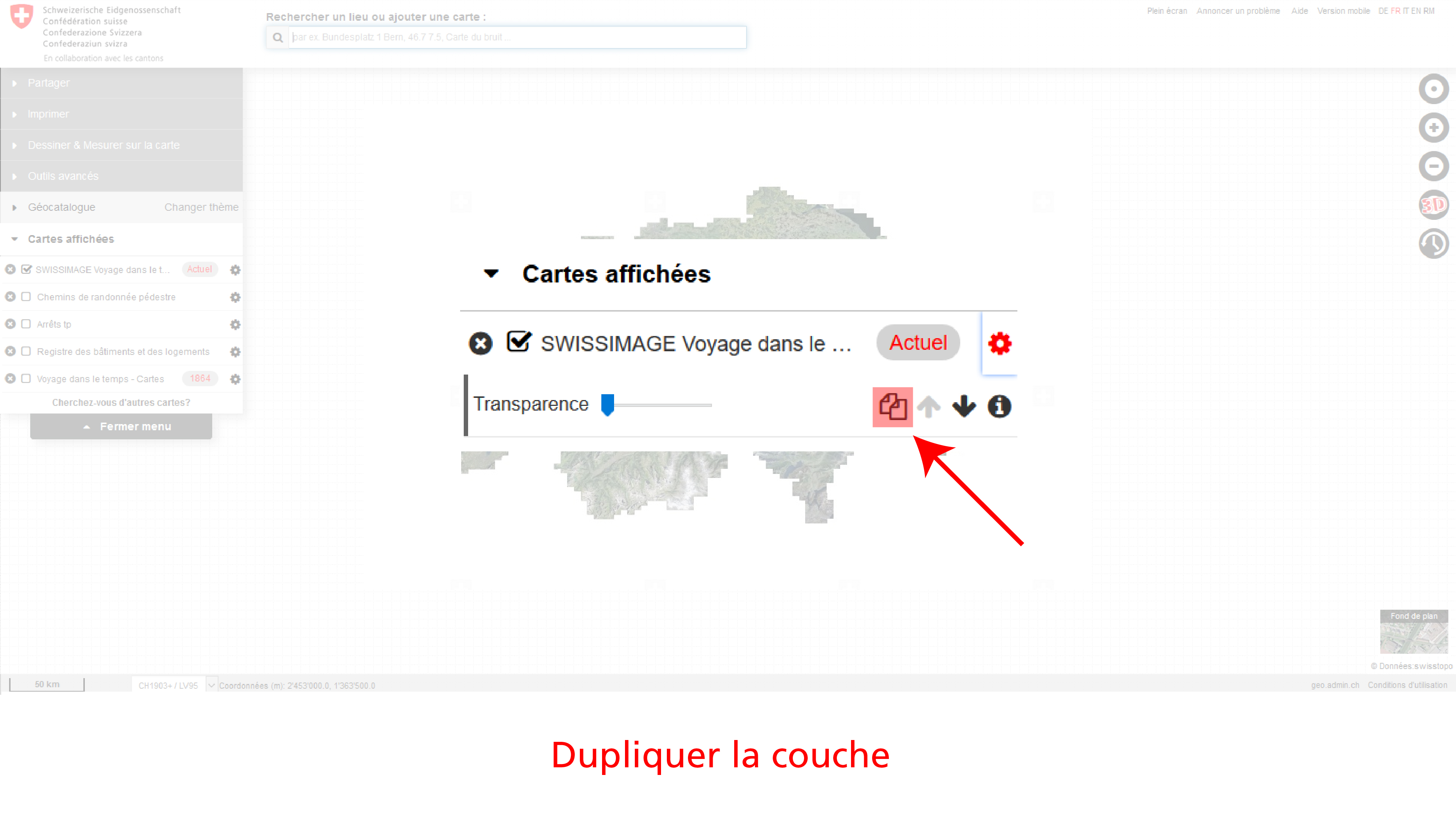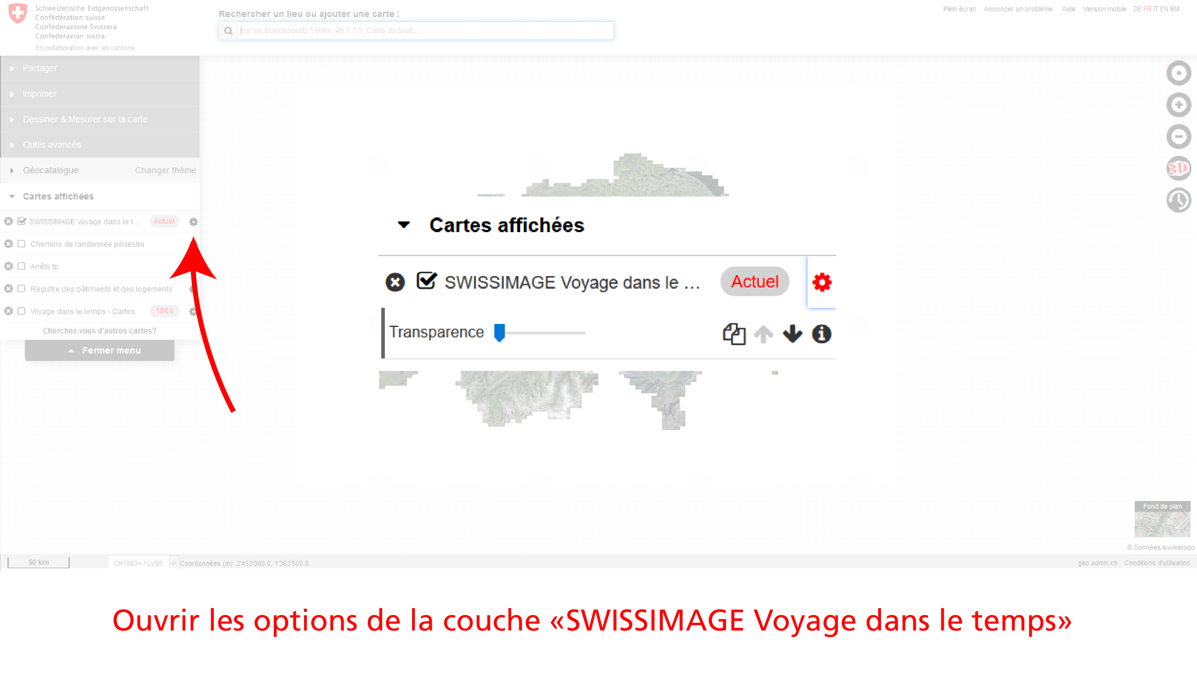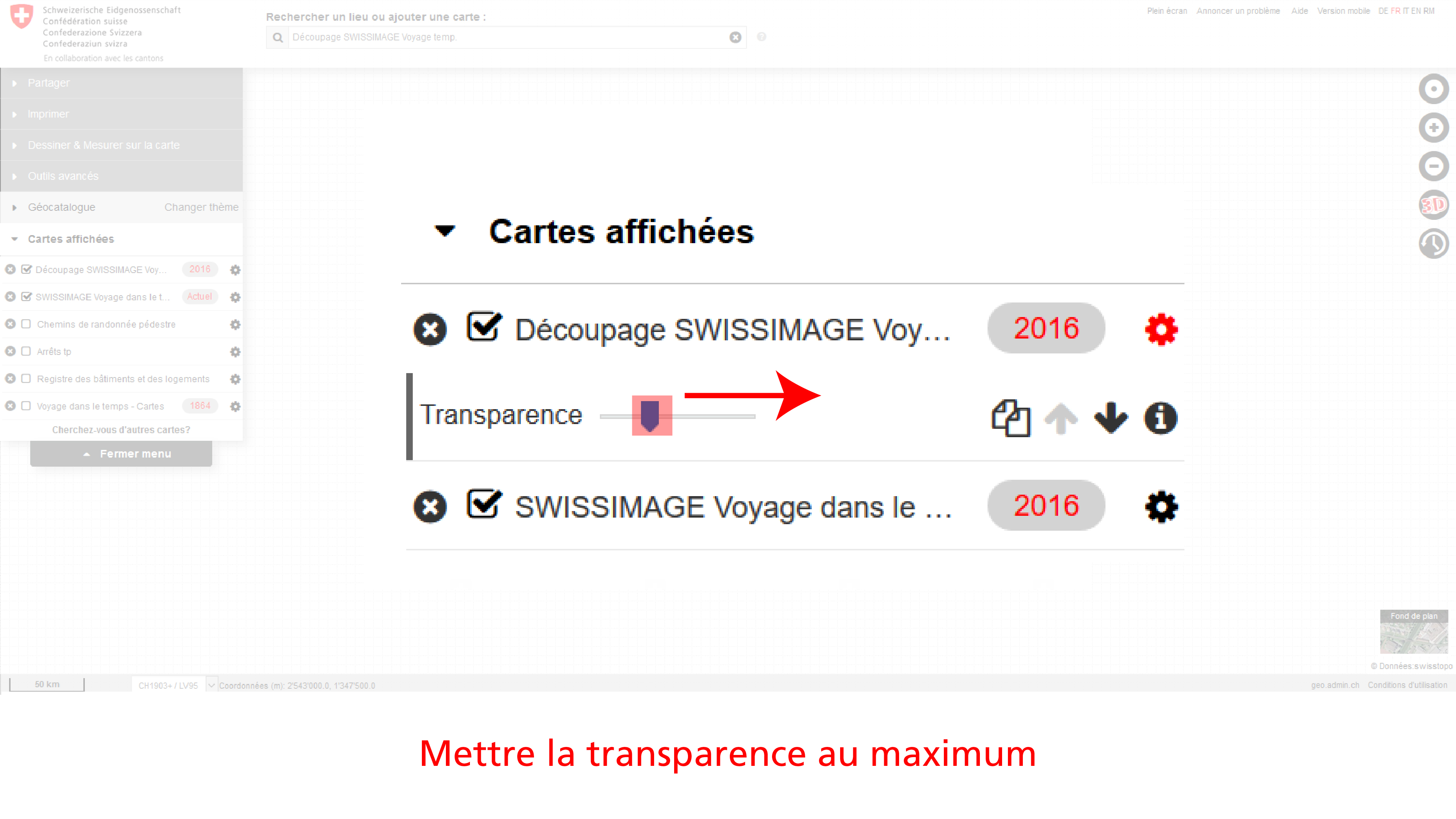 Le "Voyage dans le temps - images aériennes" est intégré dans le géoportail fédéral map.geo.admin.ch avec la couche « SWISSIMAGE Voyage dans le temps ». Deux variantes sont possibles pour la visualisation :