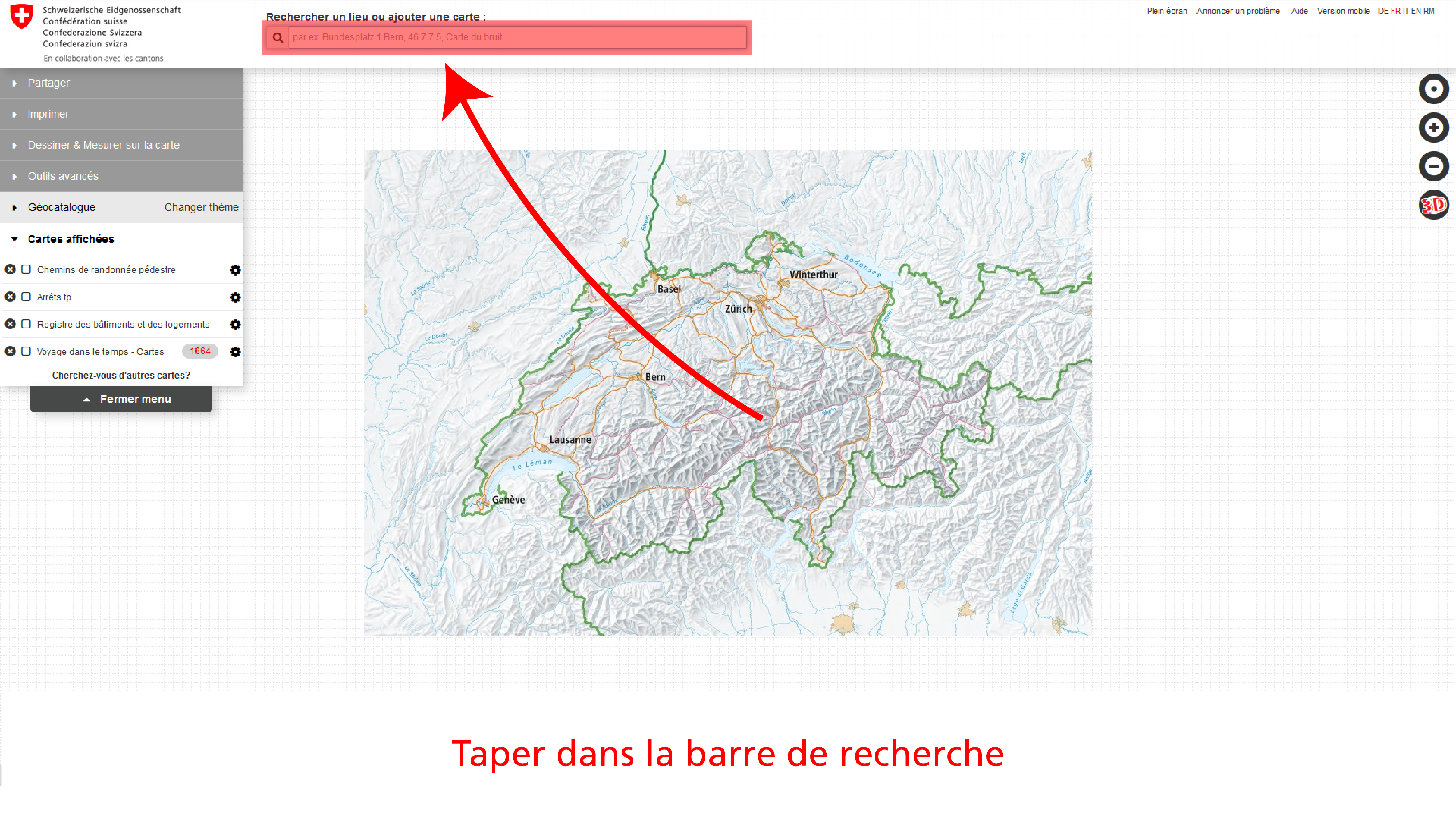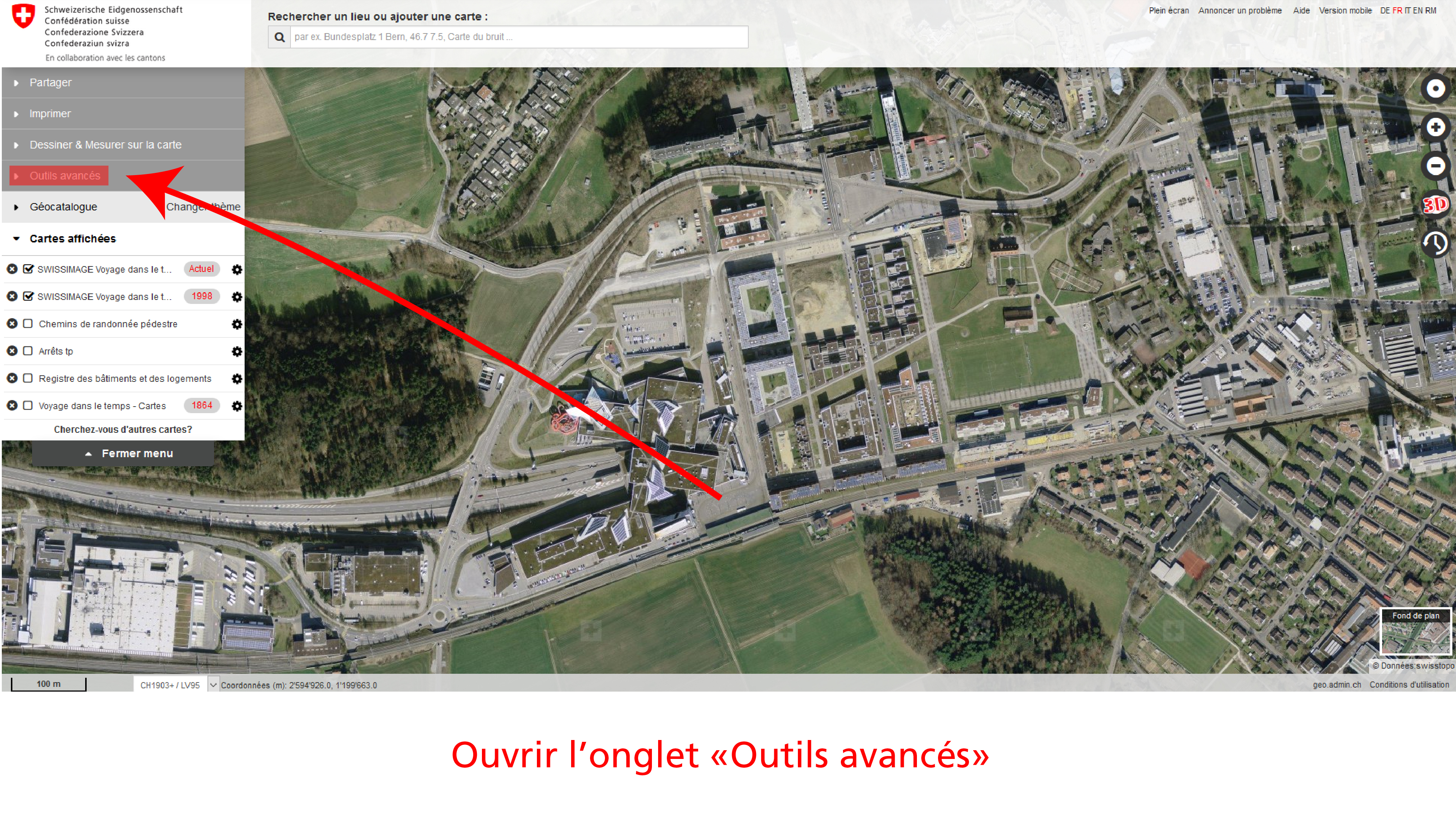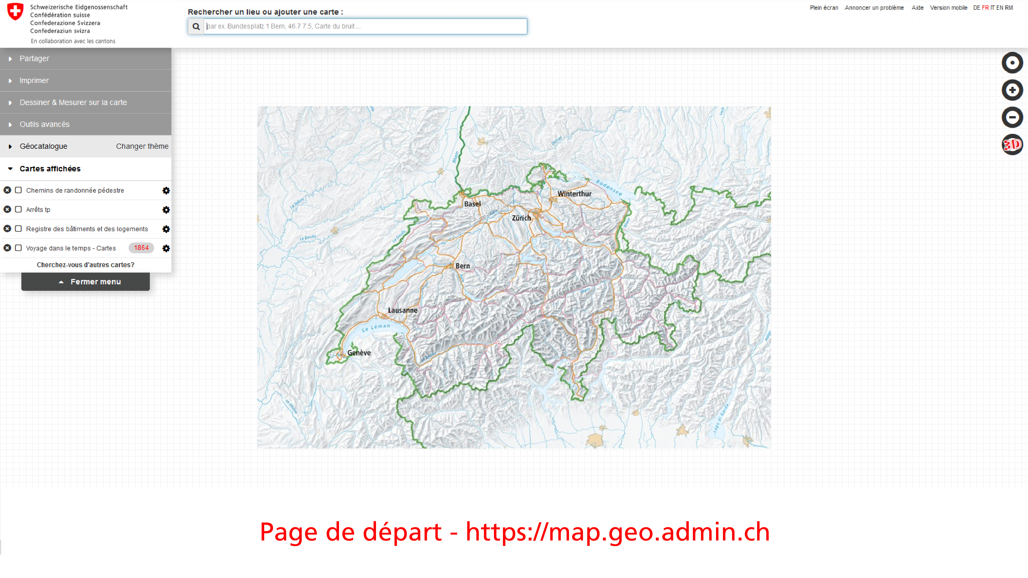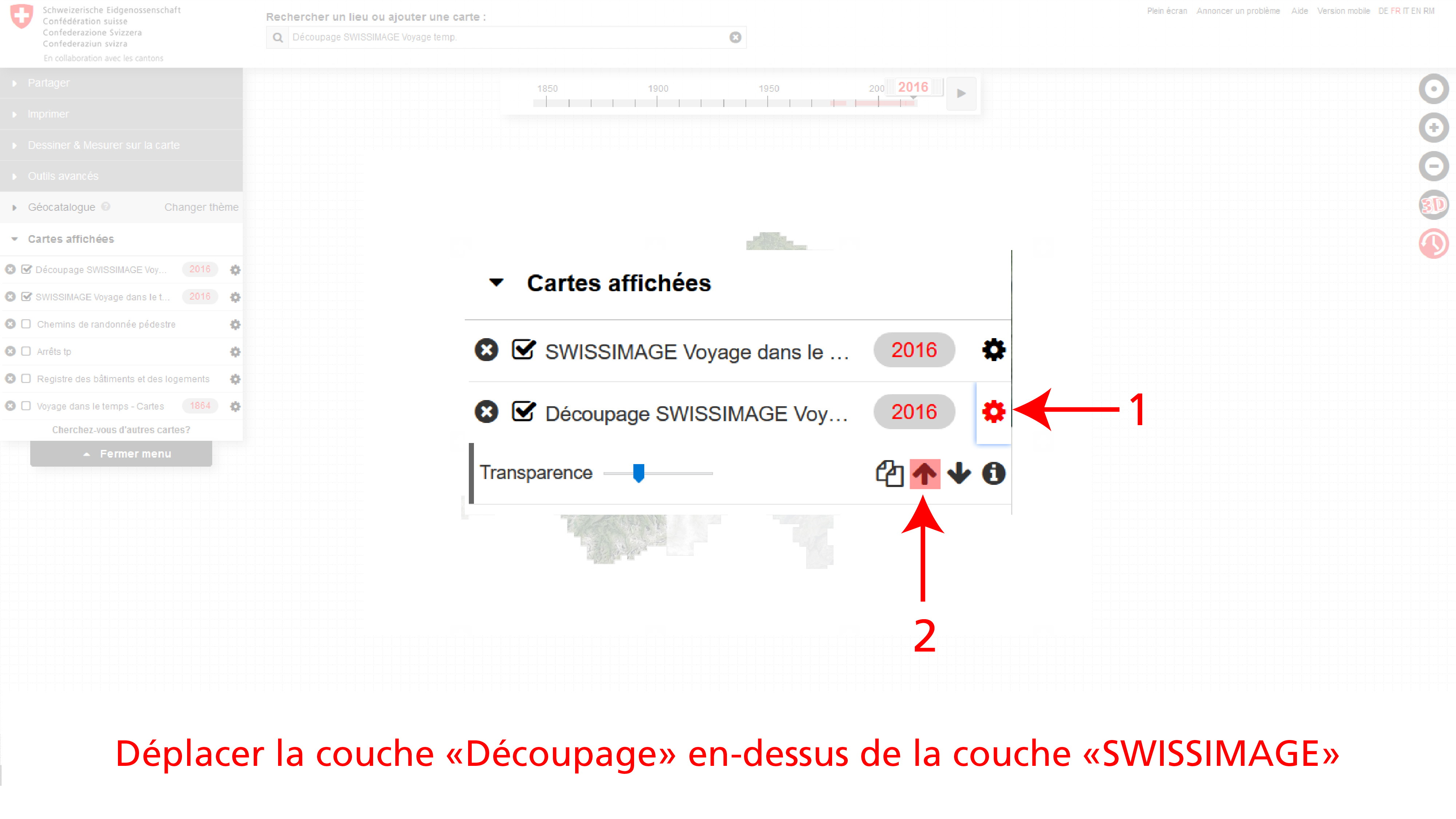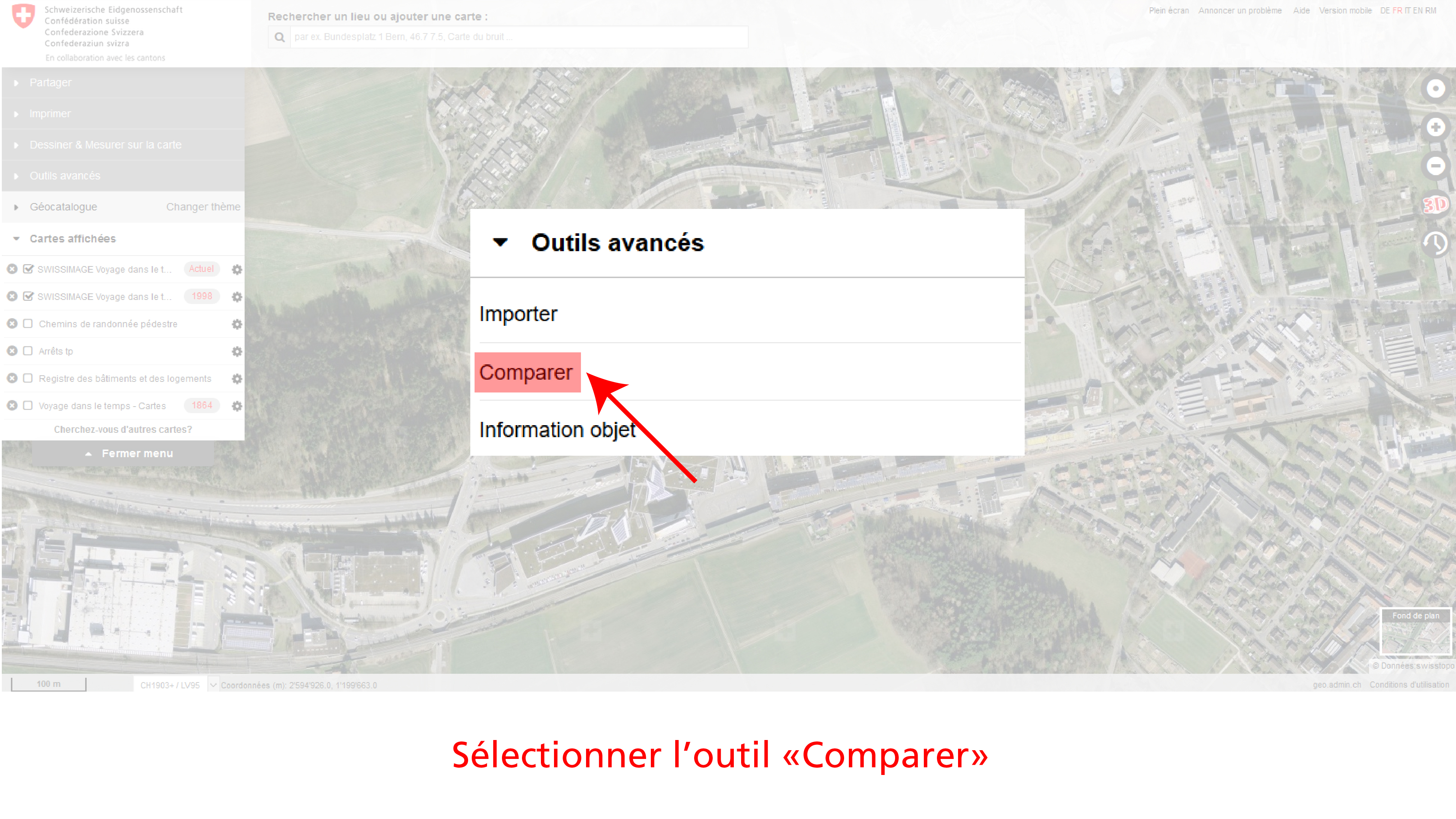 Le "Voyage dans le temps - images aériennes" est intégré dans le géoportail fédéral map.geo.admin.ch avec la couche « SWISSIMAGE Voyage dans le temps ». Deux variantes sont possibles pour la visualisation :