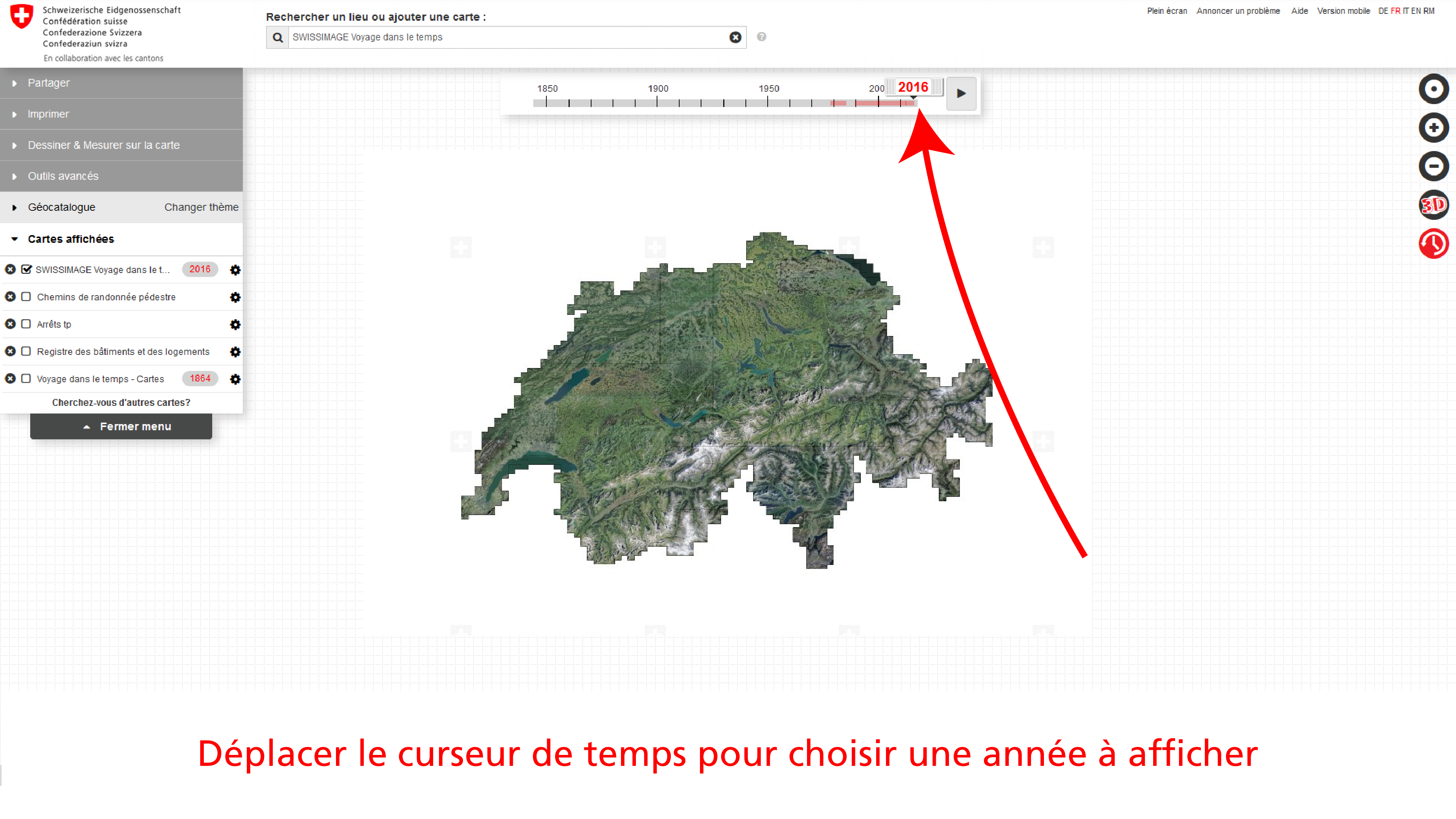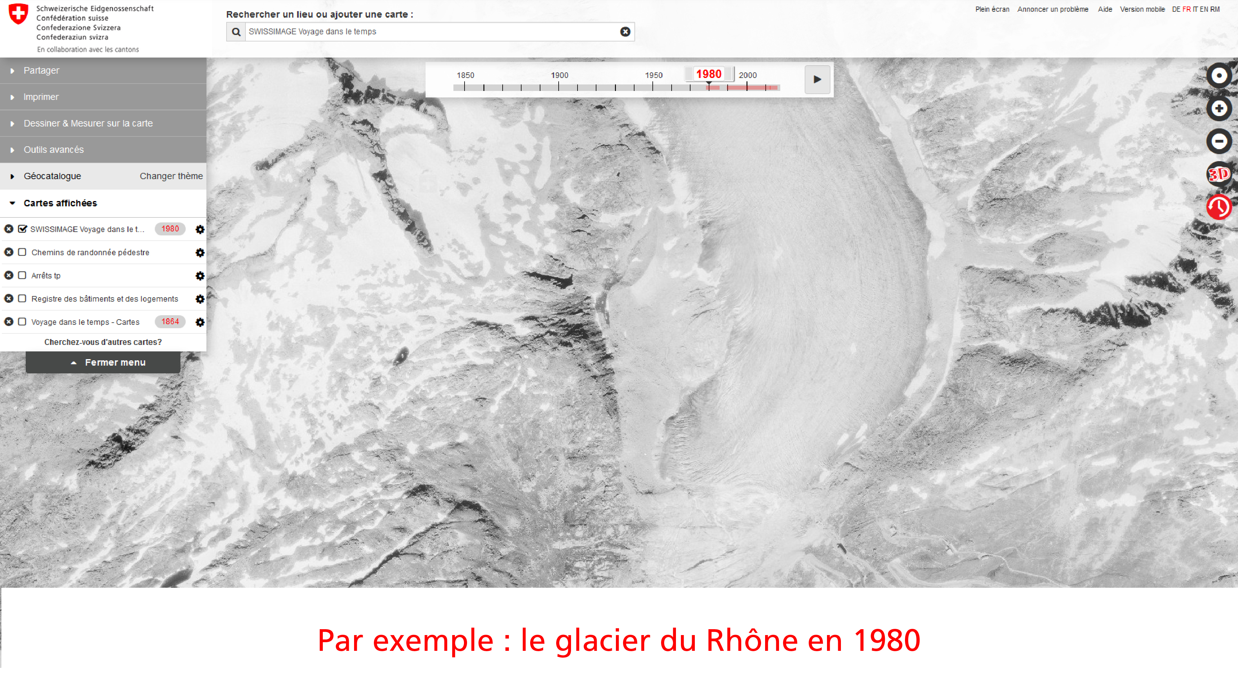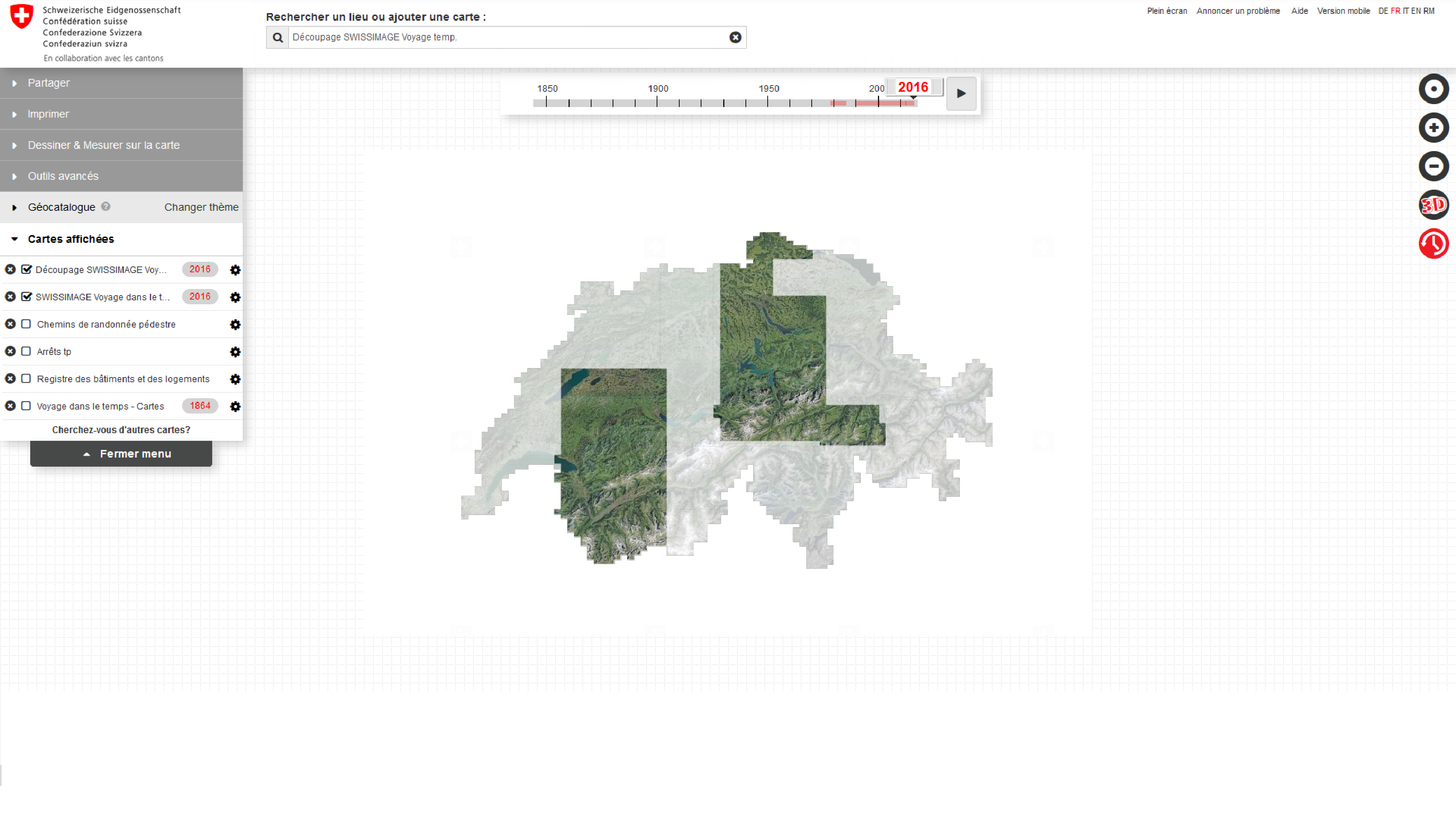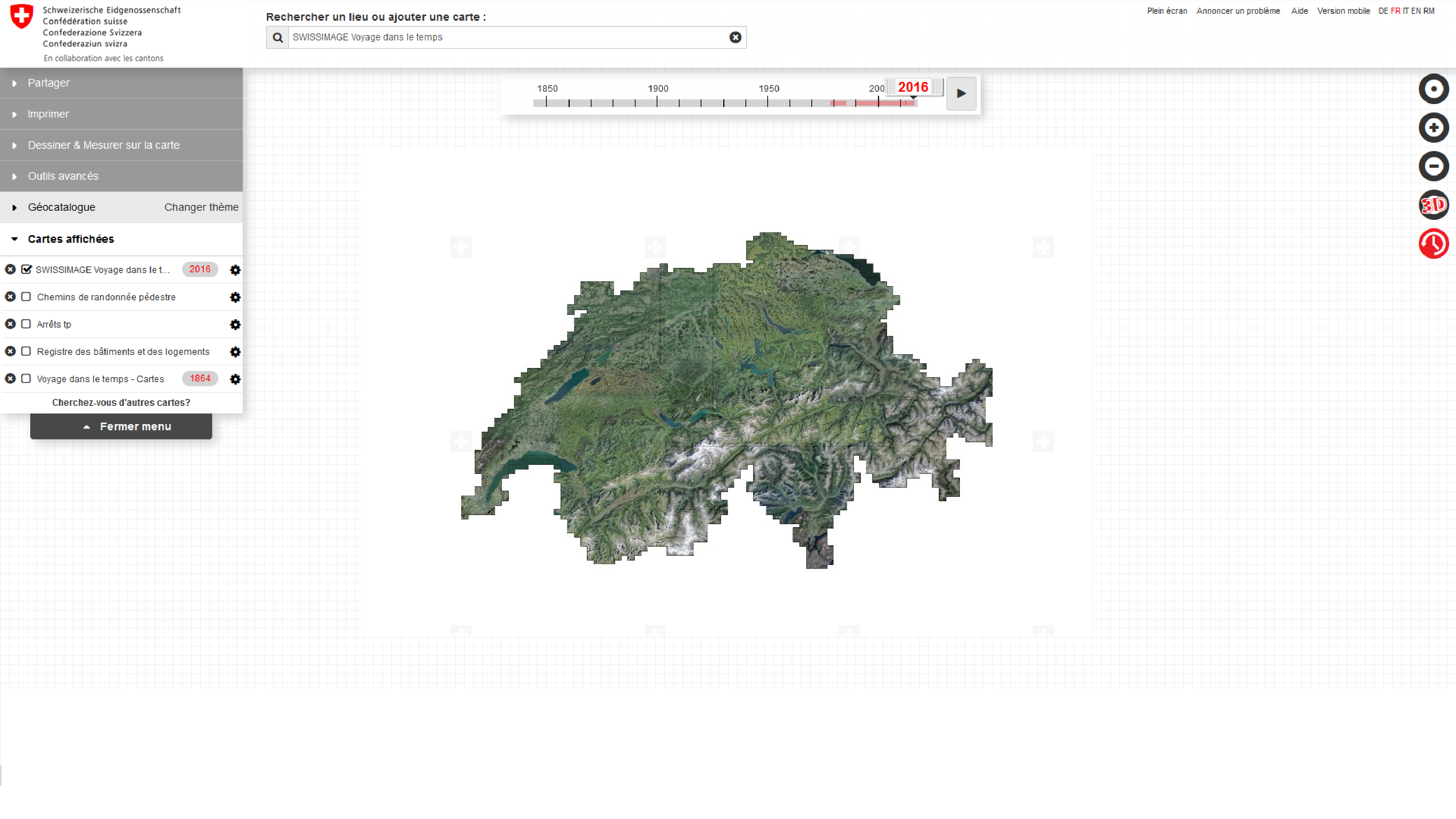 Le "Voyage dans le temps - images aériennes" contient des images de 1926 à nos jours. Grâce au traitement de milliers d’images aériennes, il est possible de faire défiler le temps pour un lieu choisi en Suisse et ainsi d’observer la mutation du milieu urbain et des changements de l’environnement naturel.