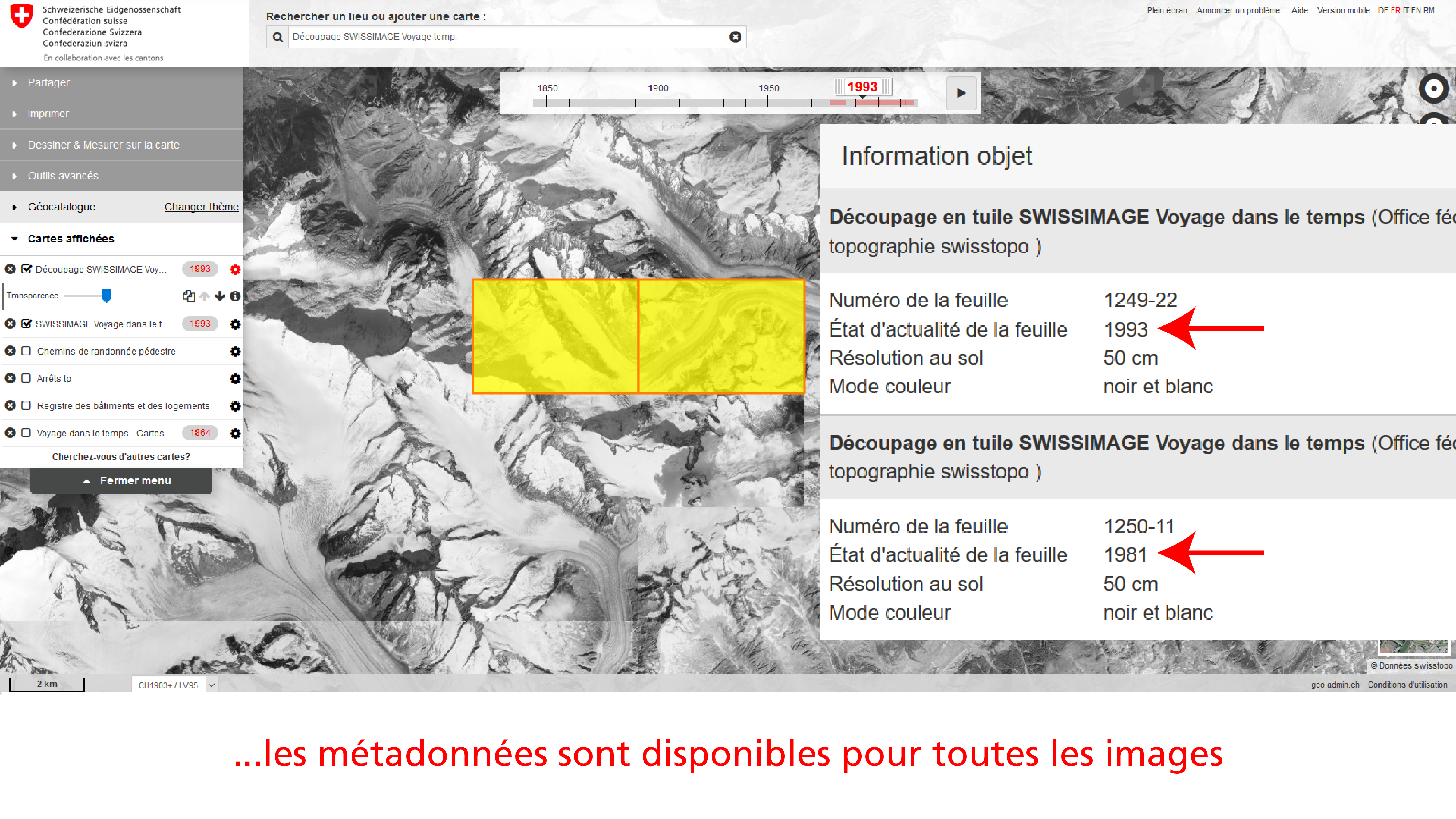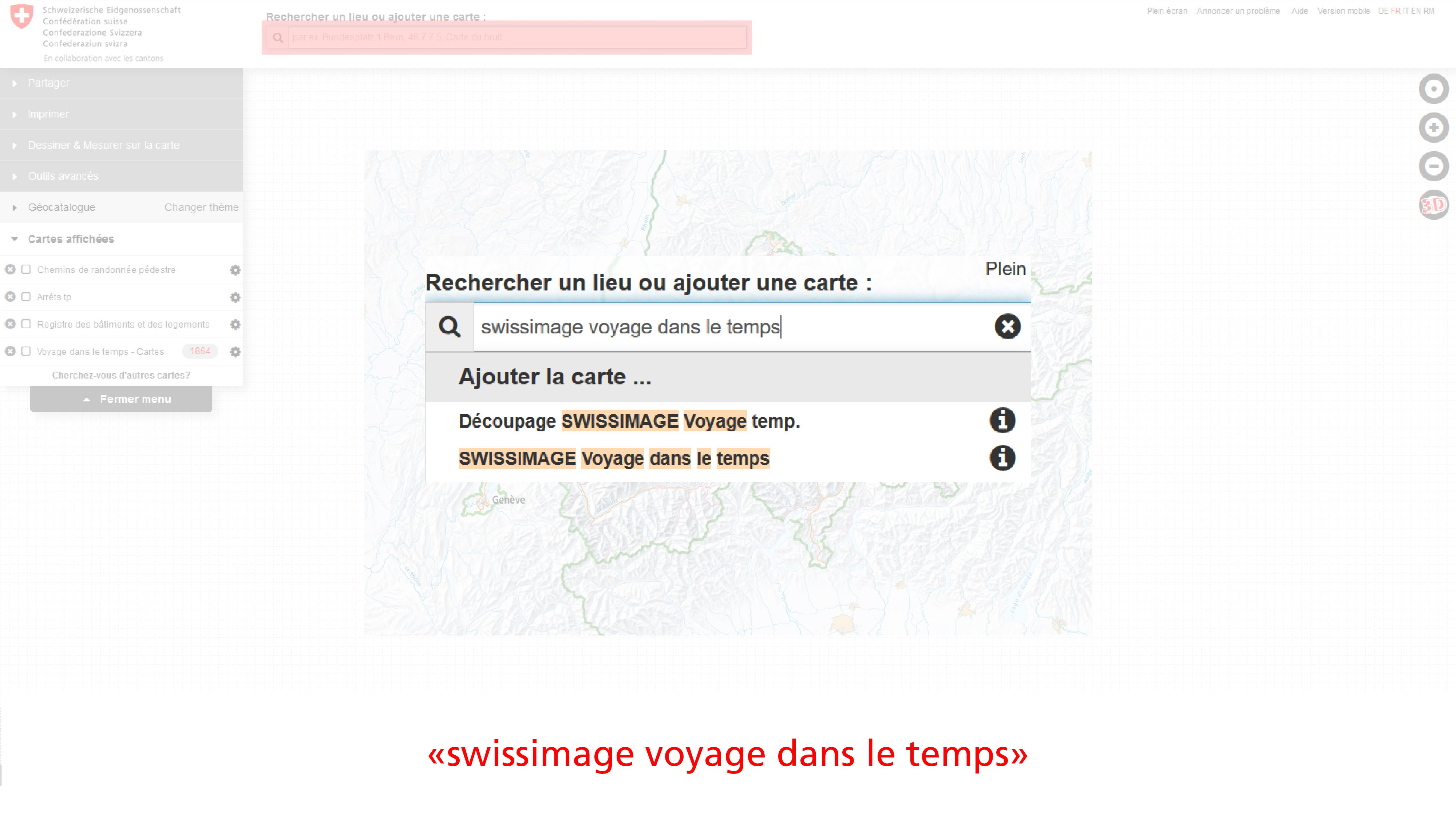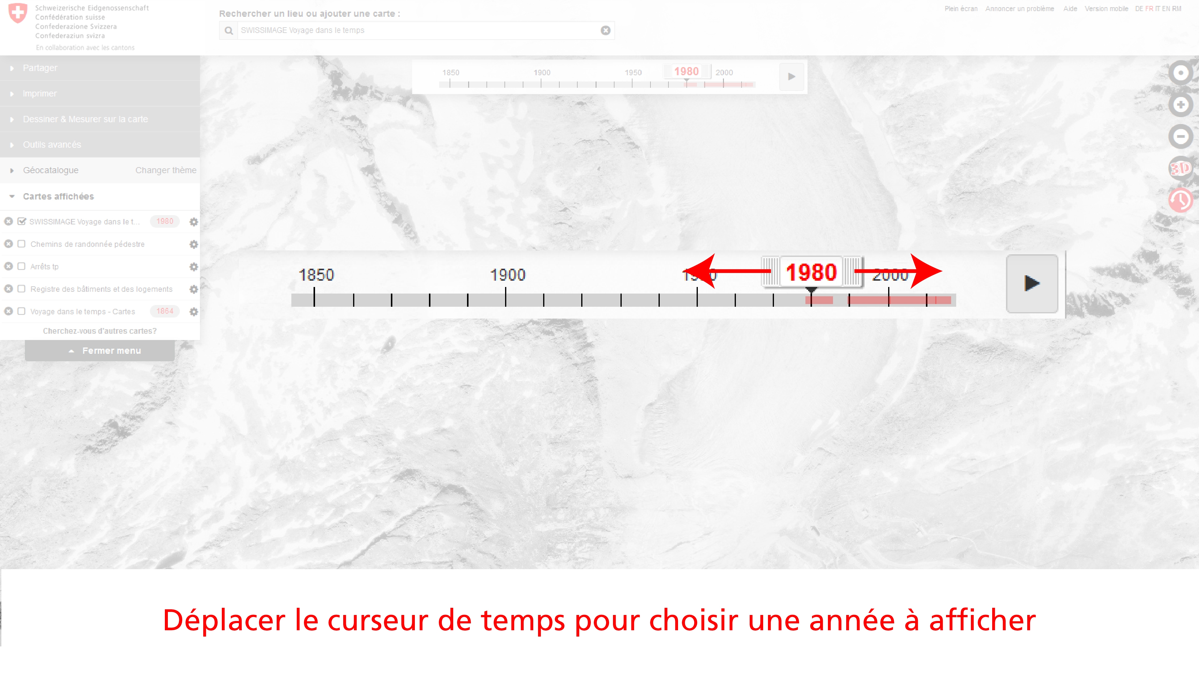 Le "Voyage dans le temps - images aériennes" contient des images de 1926 à nos jours. Grâce au traitement de milliers d’images aériennes, il est possible de faire défiler le temps pour un lieu choisi en Suisse et ainsi d’observer la mutation du milieu urbain et des changements de l’environnement naturel.