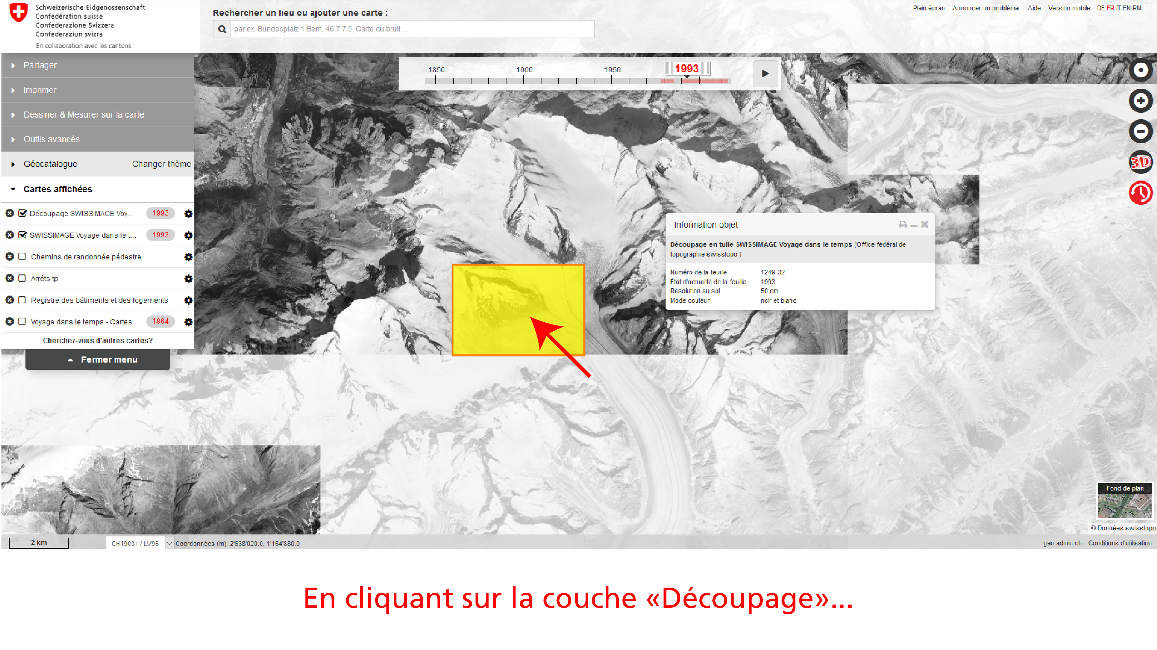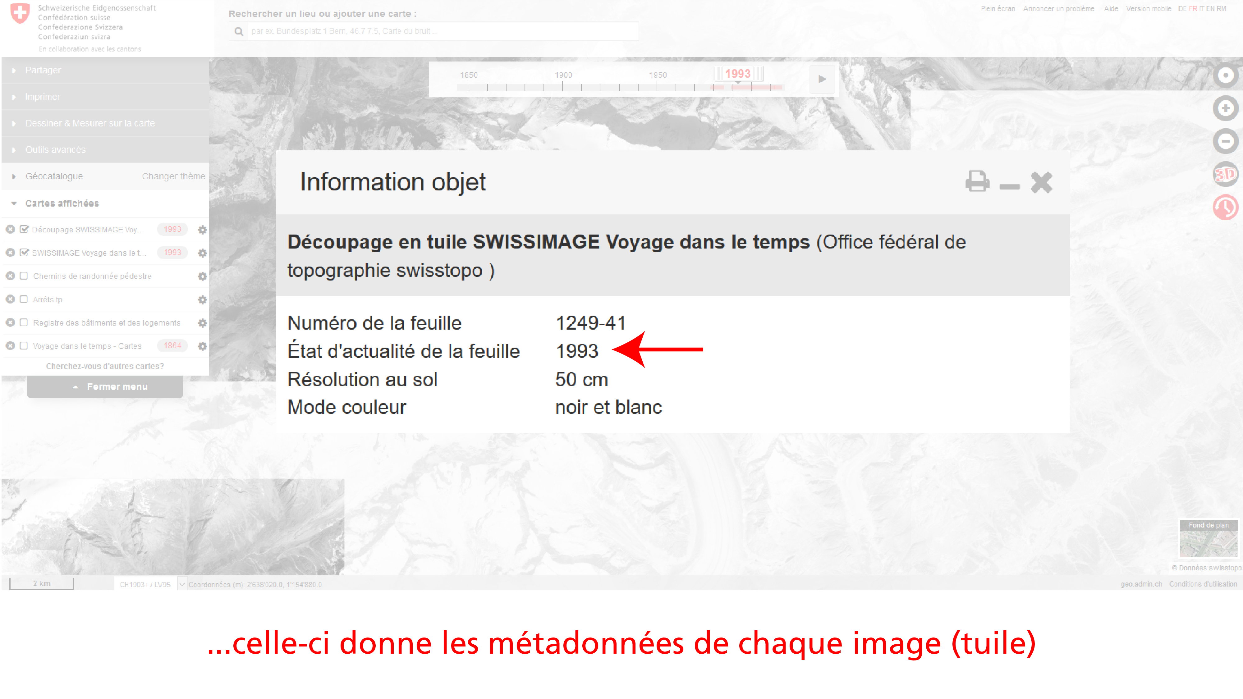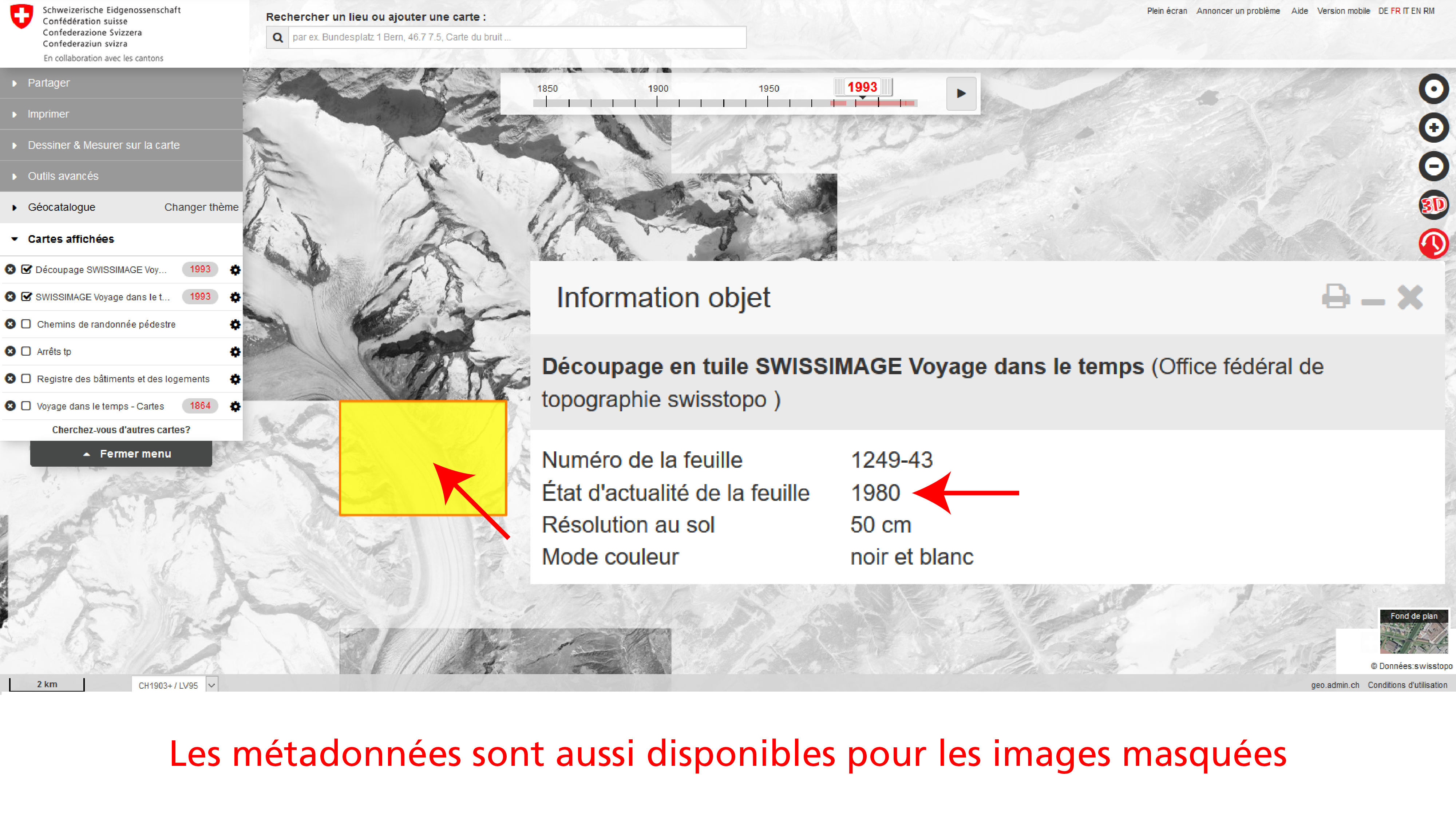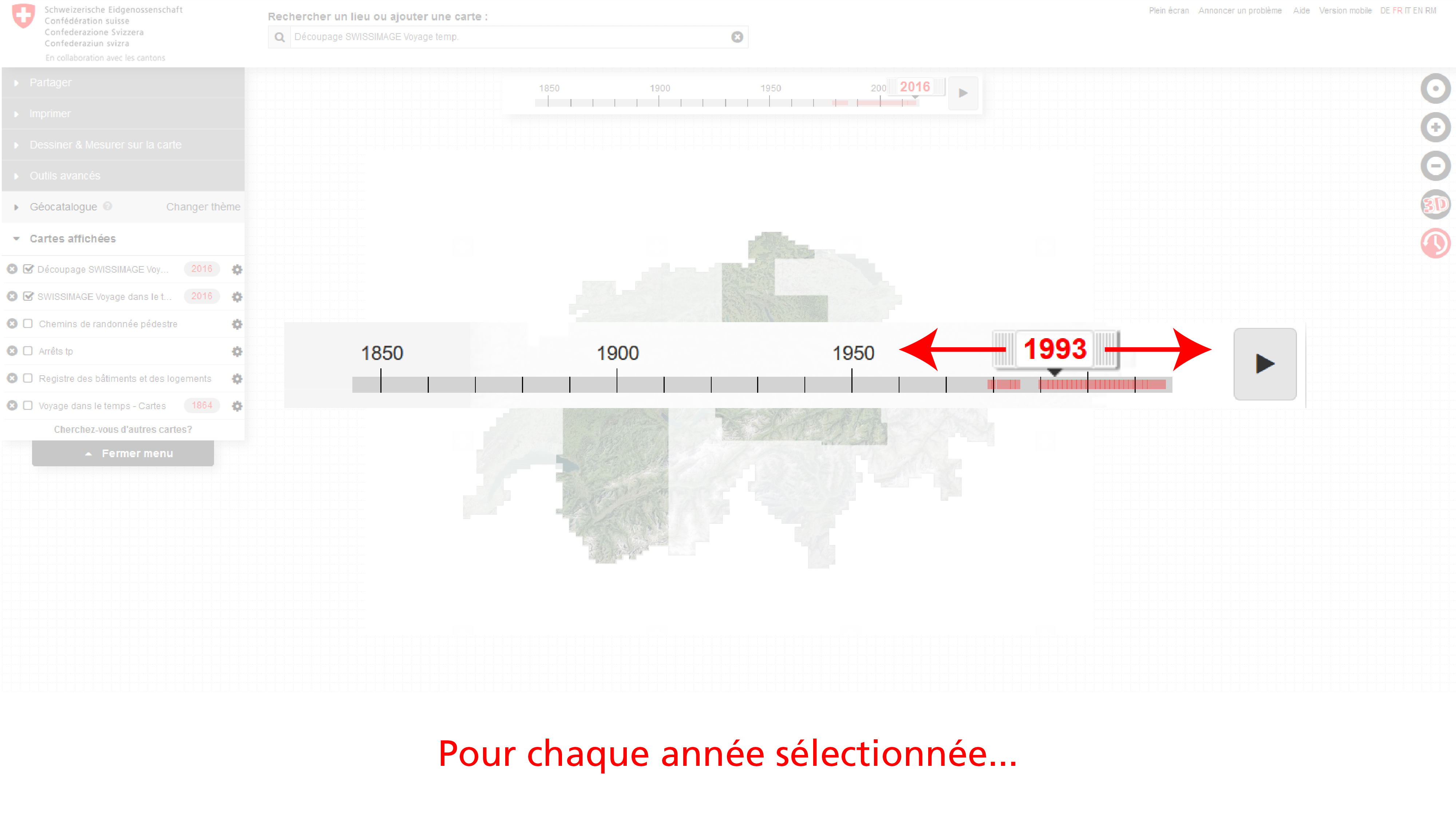Le "Voyage dans le temps - images aériennes" contient des images de 1926 à nos jours. Grâce au traitement de milliers d’images aériennes, il est possible de faire défiler le temps pour un lieu choisi en Suisse et ainsi d’observer la mutation du milieu urbain et des changements de l’environnement naturel.