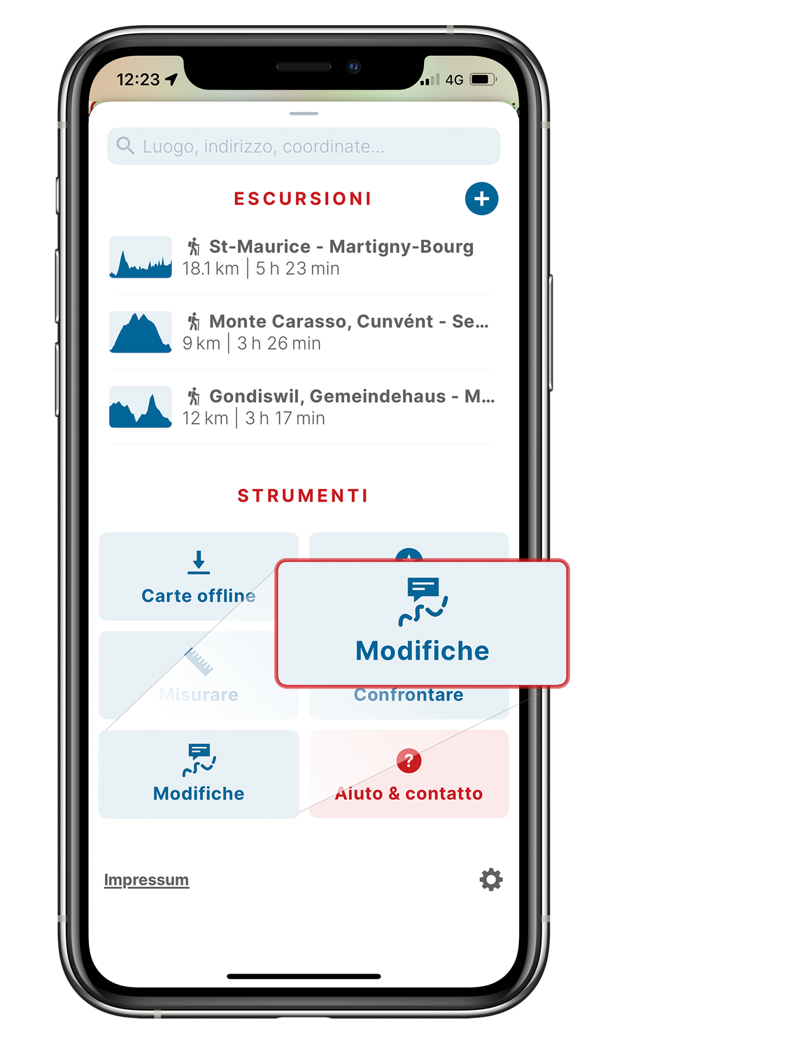 Modifiche ed errori nel materiale cartografico possono essere segnalati direttamente nell’app con lo strumento «Modifiche». Per aprirlo, tirare verso l’alto il menu principale e premere sul pulsante «Modifiche». Qui è possibile inserire le proprie segnalazioni.