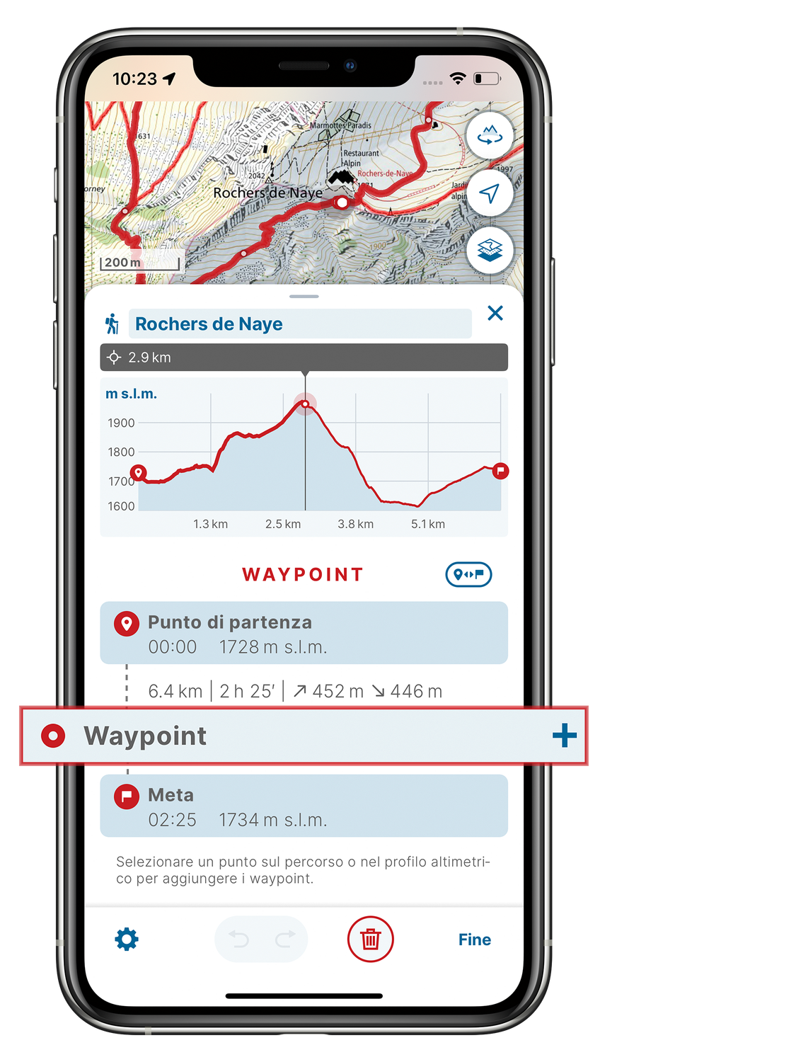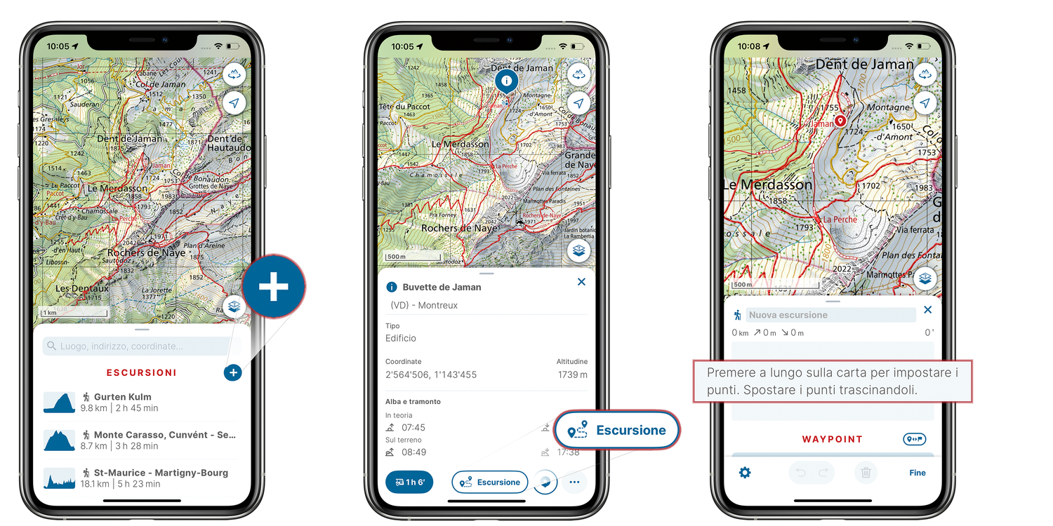 - Tracciare l’escursione tenendo premuto, a intervalli regolari, su vari punti del percorso desiderato. È possibile spostare i punti per modificare l’itinerario fino a quando non si è soddisfatti del risultato.