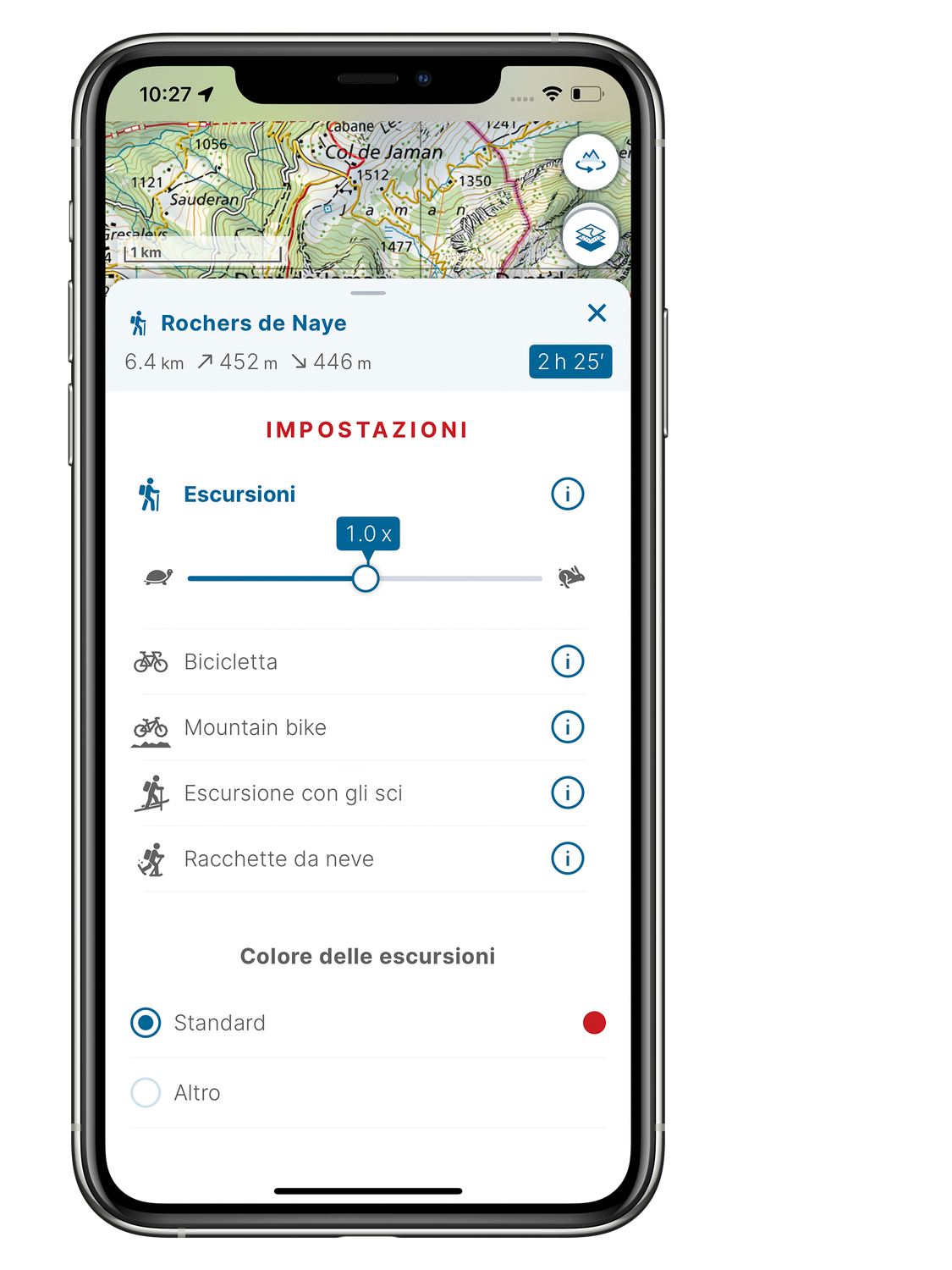 Nota: Le carte nazionali non contengono nessuna informazione sulle limitazioni d'uso o di accesso e sulle norme di circolazione. Per questo motivo, quando si disegna un'escursione, si consiglia di utilizzare la rete di sentieri escursionistici ufficiali o i percorsi conosciuti. Le restrizioni e le regole devono essere rispettate sul posto.