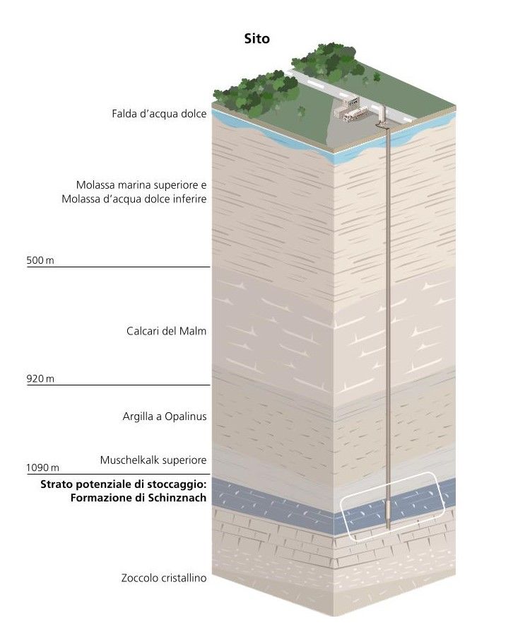 Mentre la Nagra ha esaminato in particolare l’Argilla a Opalinus a circa 900 metri di profondità, per l’iniezione di CO2 ci si concentrerà su uno strato geologico ancora più profondo: il cosiddetto Muschelkalk, a 1100 metri di profondità. Le rocce calcaree e dolomitiche che lo compongono sono acquiferi profondi che si estendono nel sottosuolo di quasi tutto l’Altopiano svizzero. Madritsch spiega che, teoricamente, gli strati rocciosi contenti acqua salata sono ideali per lo stoccaggio di CO2. Il diossido di carbonio iniettato allo stato liquido nel sottosuolo si dissolve per poi distribuirsi nello strato roccioso. Per fare in modo che il CO2 disciolto non possa risalire in superficie, occorre una barriera di copertura: a Trüllikon una prima barriera geologica è già presente direttamente al di sopra del Muschelkalk. Questo è poi seguito da altre barriere di copertura come la ben studiata e molto compatta Argilla a Opalinus.